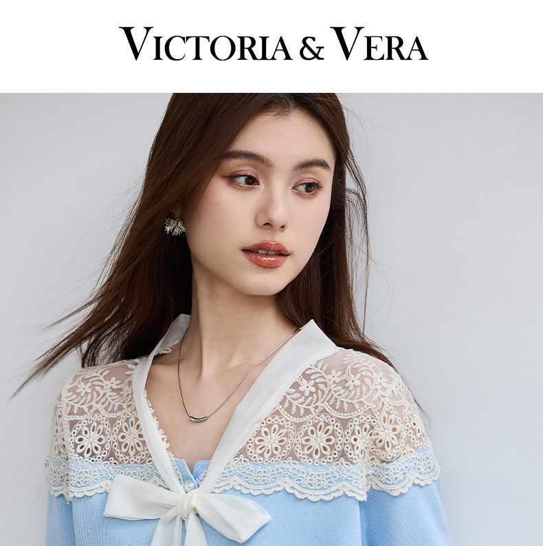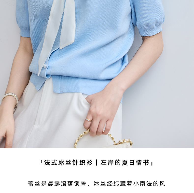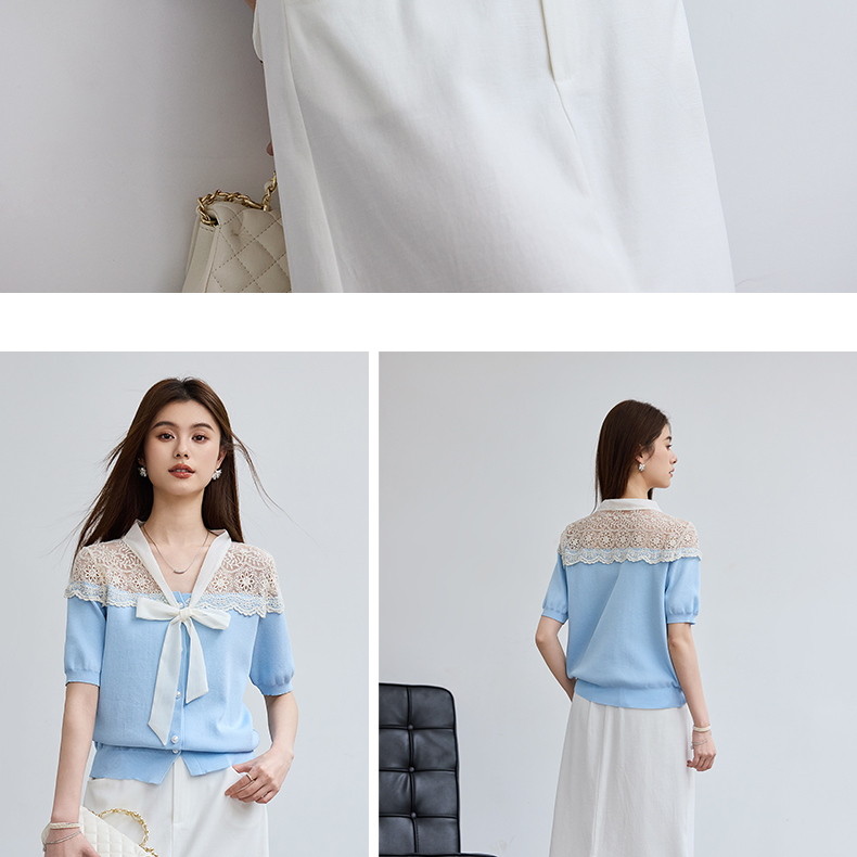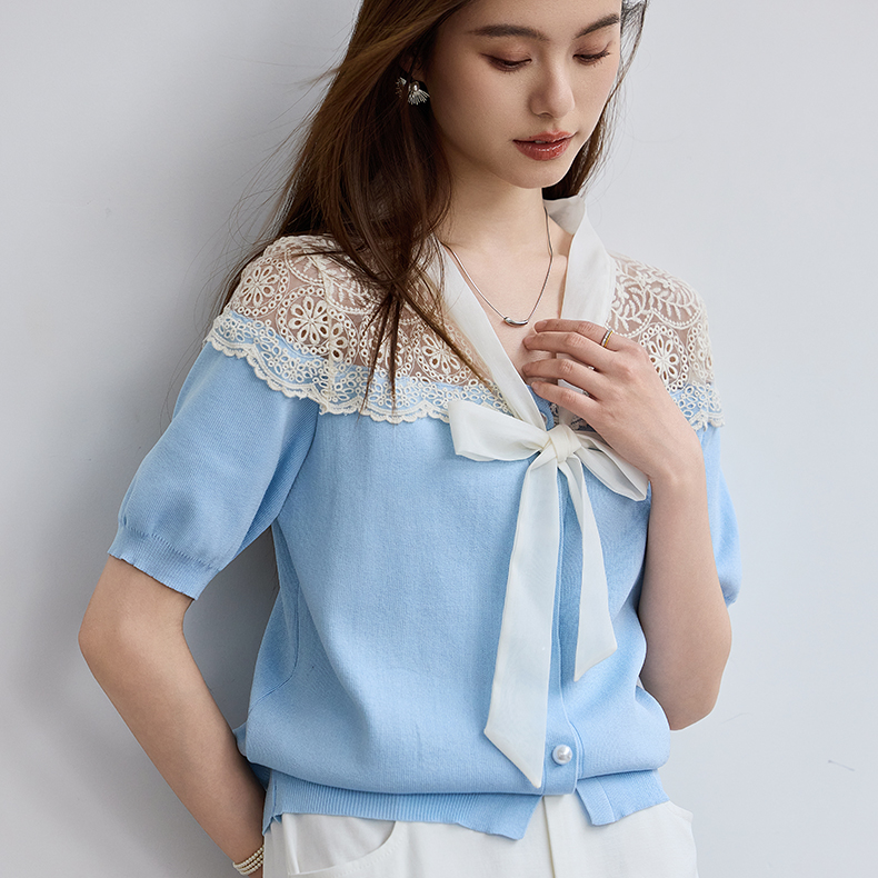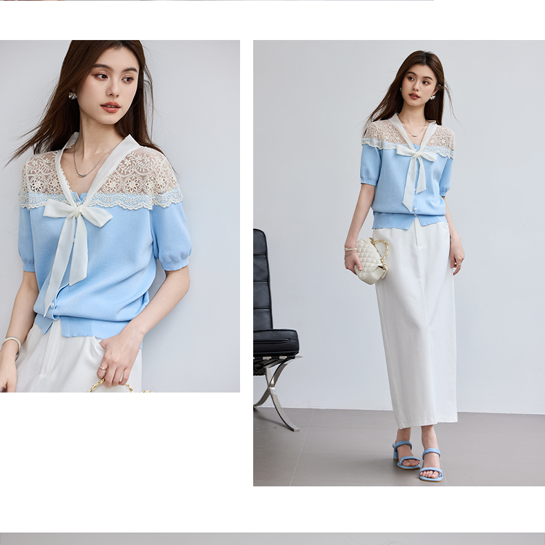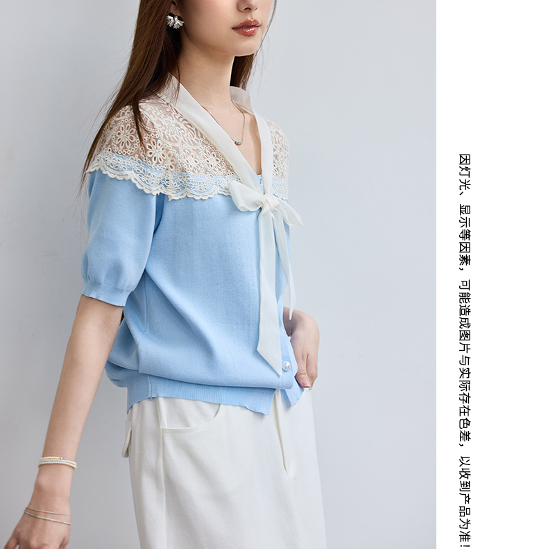 VICTORIA&VERA春季“塞纳雾蓝”蕾丝绑带冰丝针织短袖V领镂空肩线法式通勤慵懒上衣