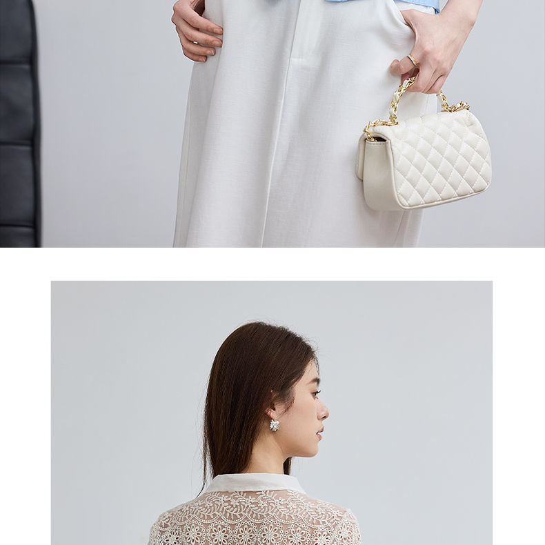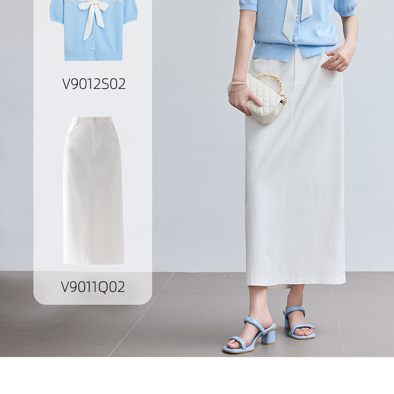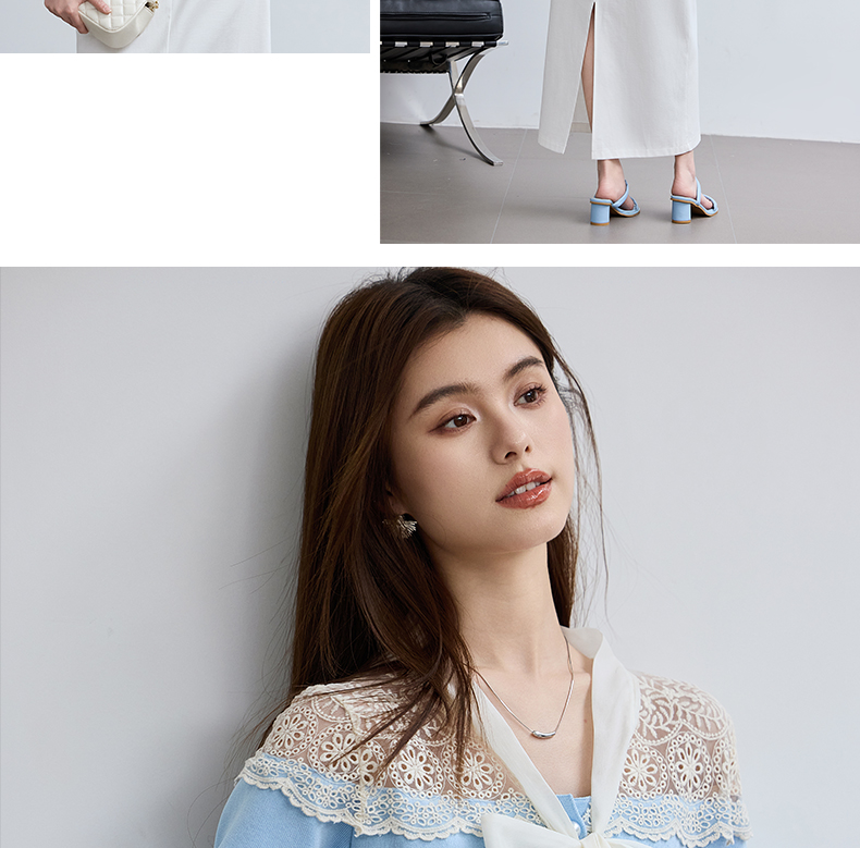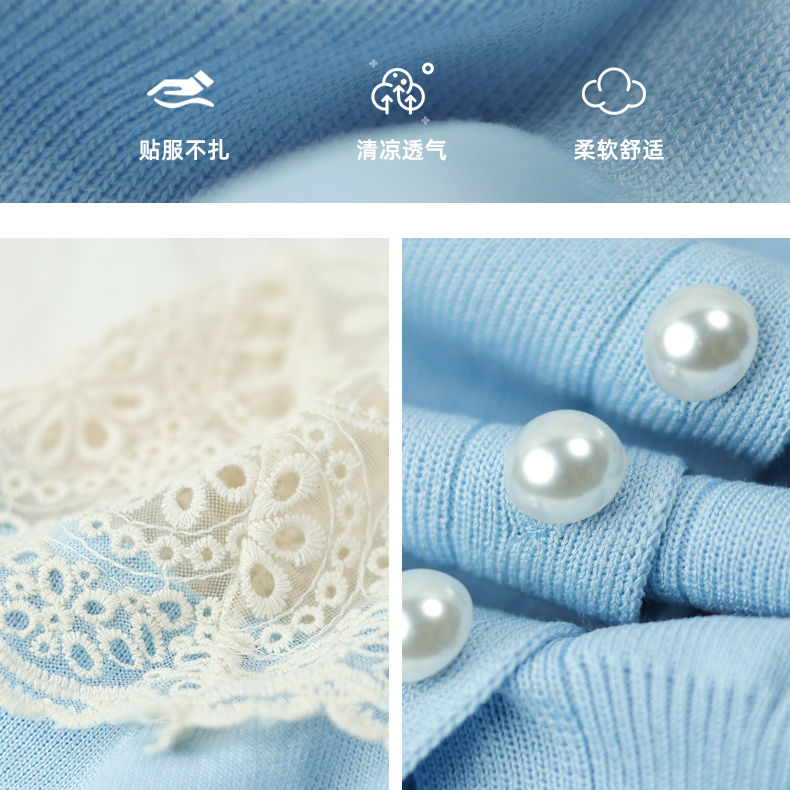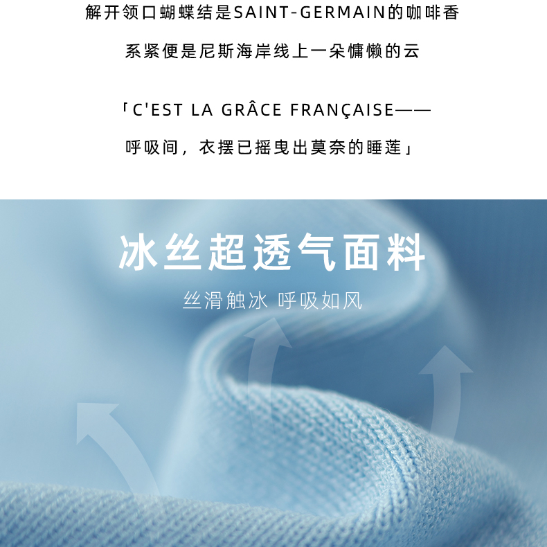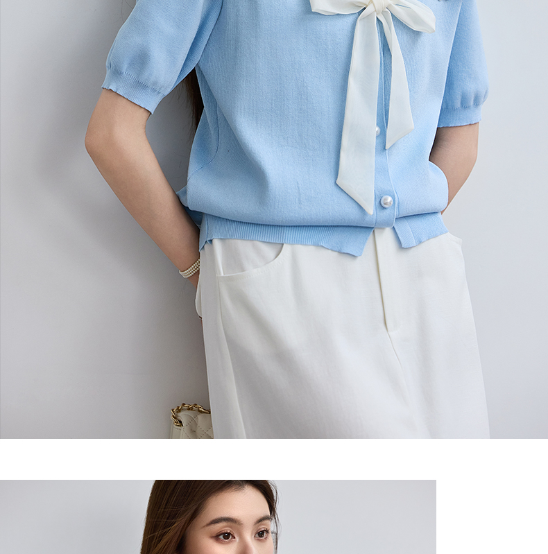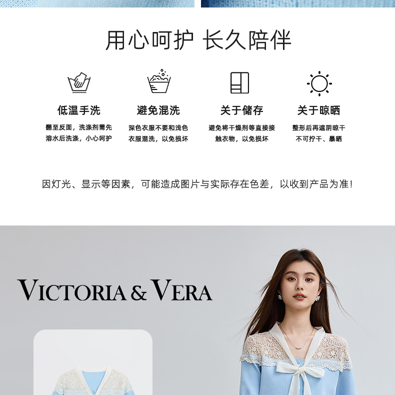 VICTORIA&VERA春季“塞纳雾蓝”蕾丝绑带冰丝针织短袖V领镂空肩线法式通勤慵懒上衣