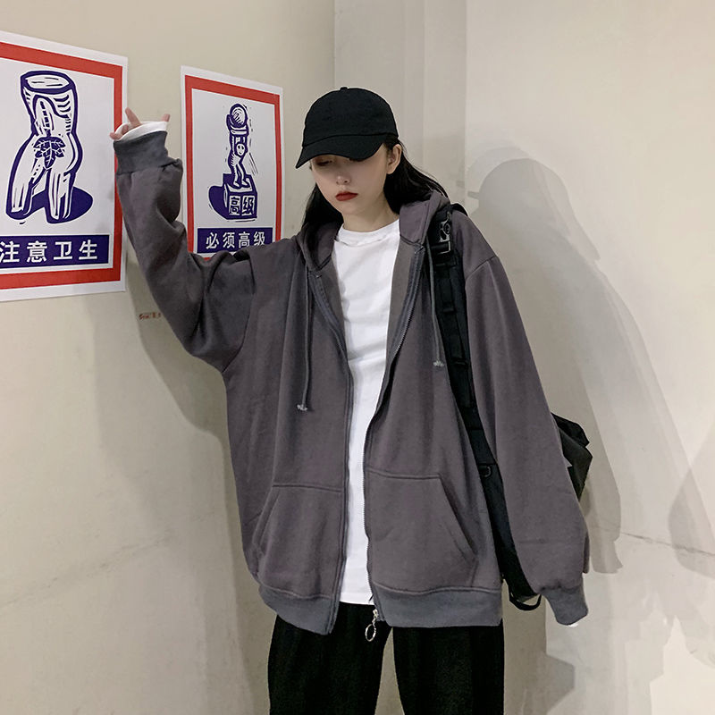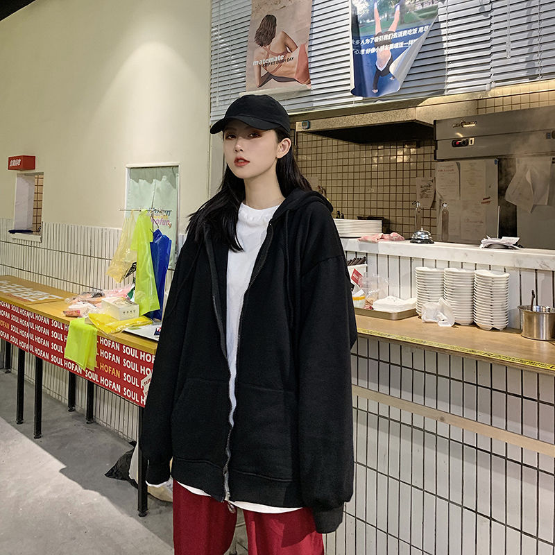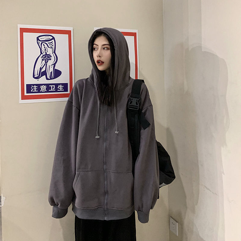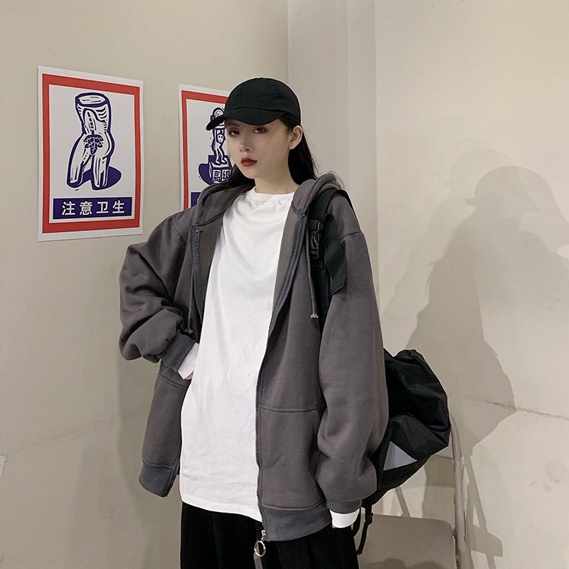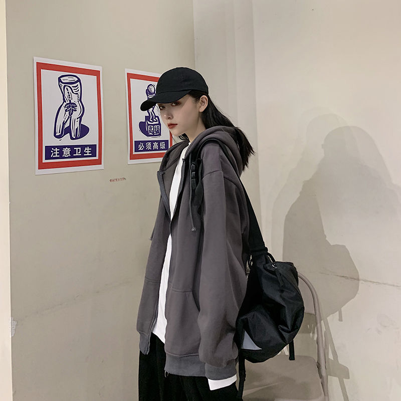 秋冬韩版ins原宿风加绒加厚宽松纯色百搭休闲连帽卫衣开衫外套女