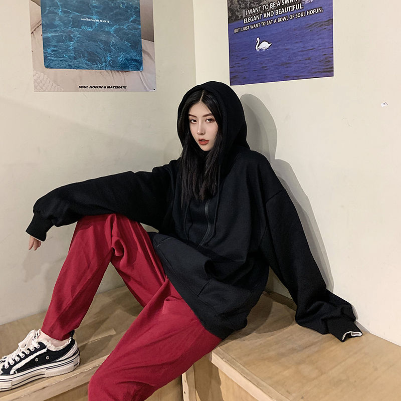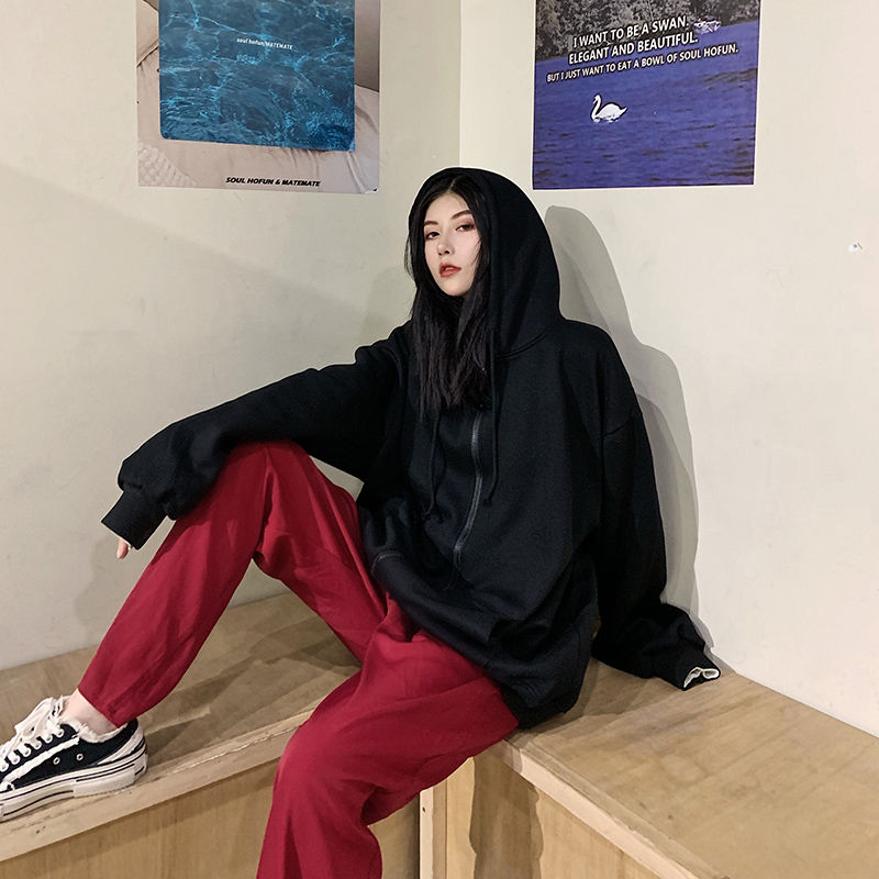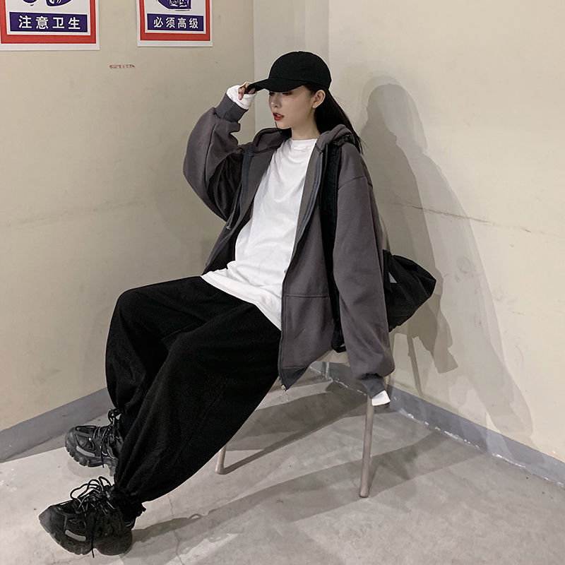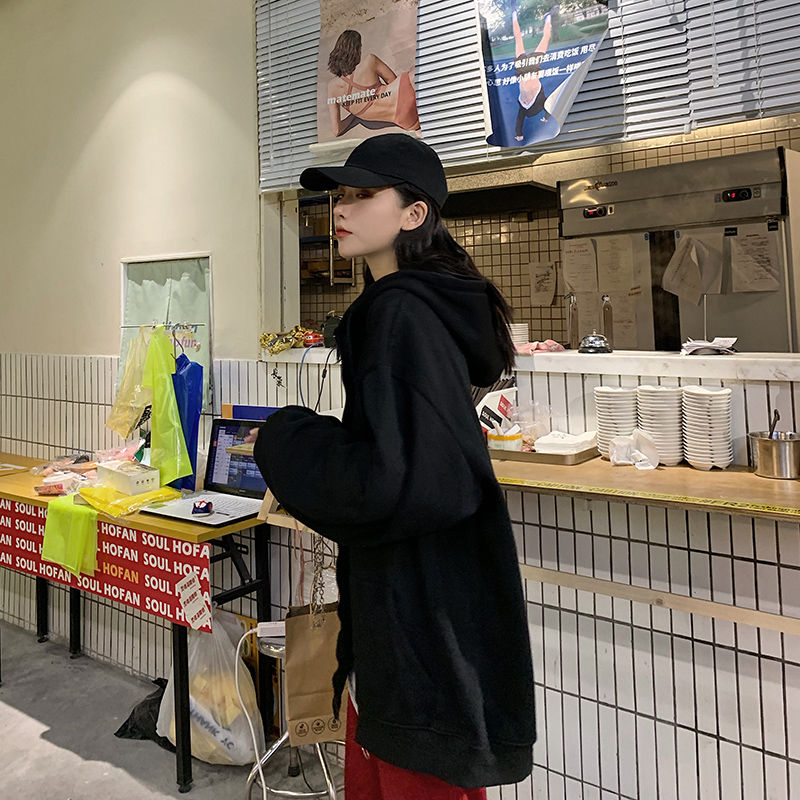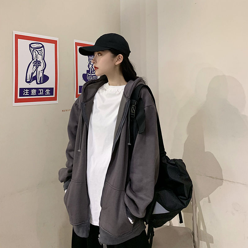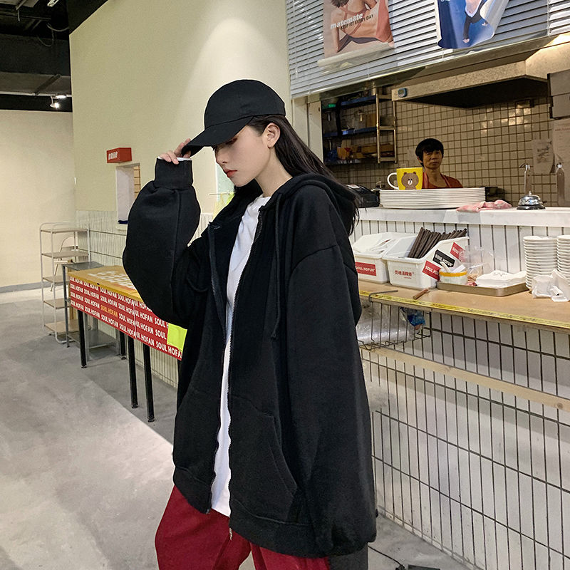 秋冬韩版ins原宿风加绒加厚宽松纯色百搭休闲连帽卫衣开衫外套女