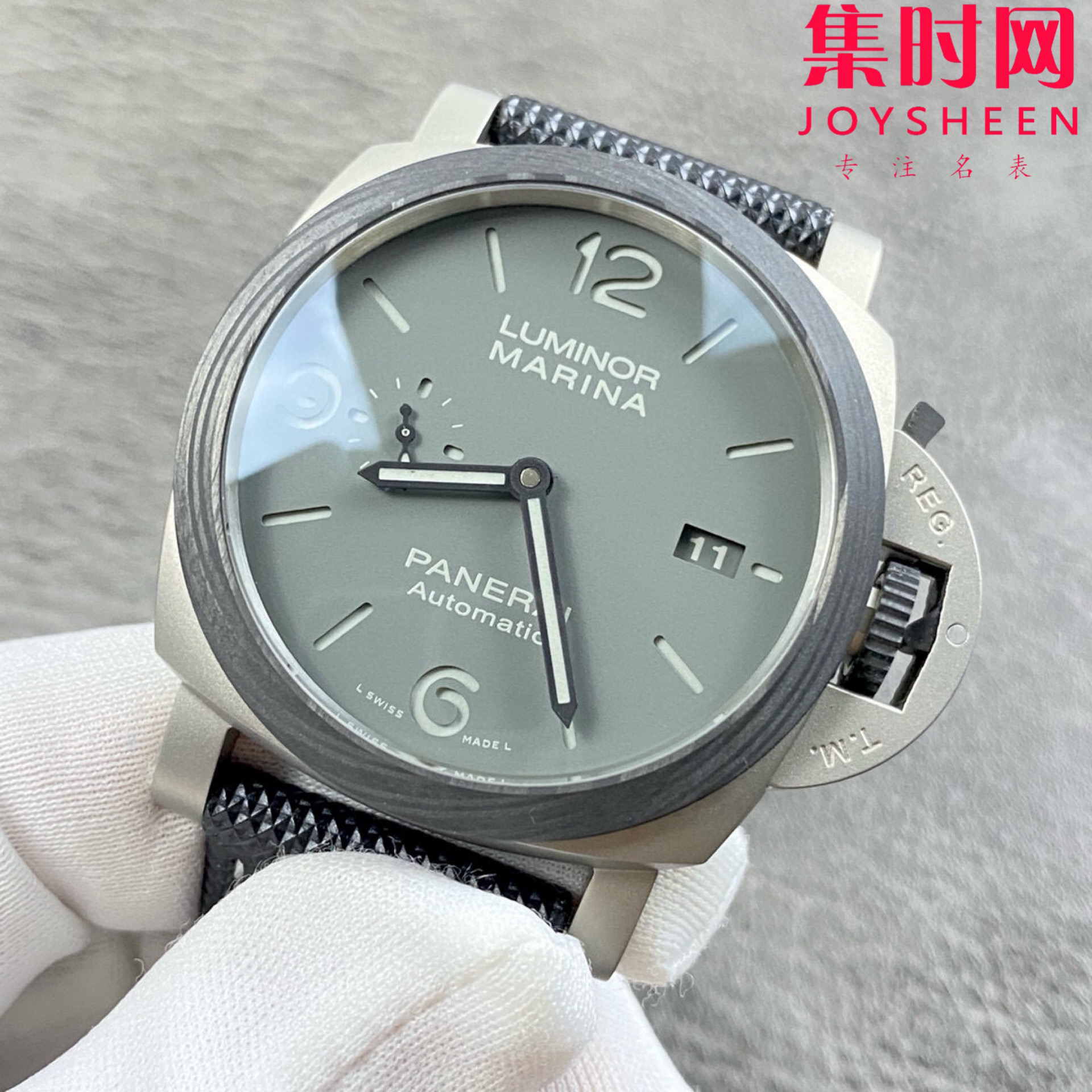 表盘:三明治式结构;阿拉伯数字及时标以灰色Super-LumiNova夜光涂层涂覆,原版绿色夜光