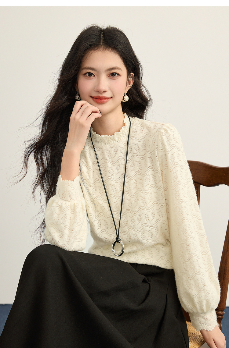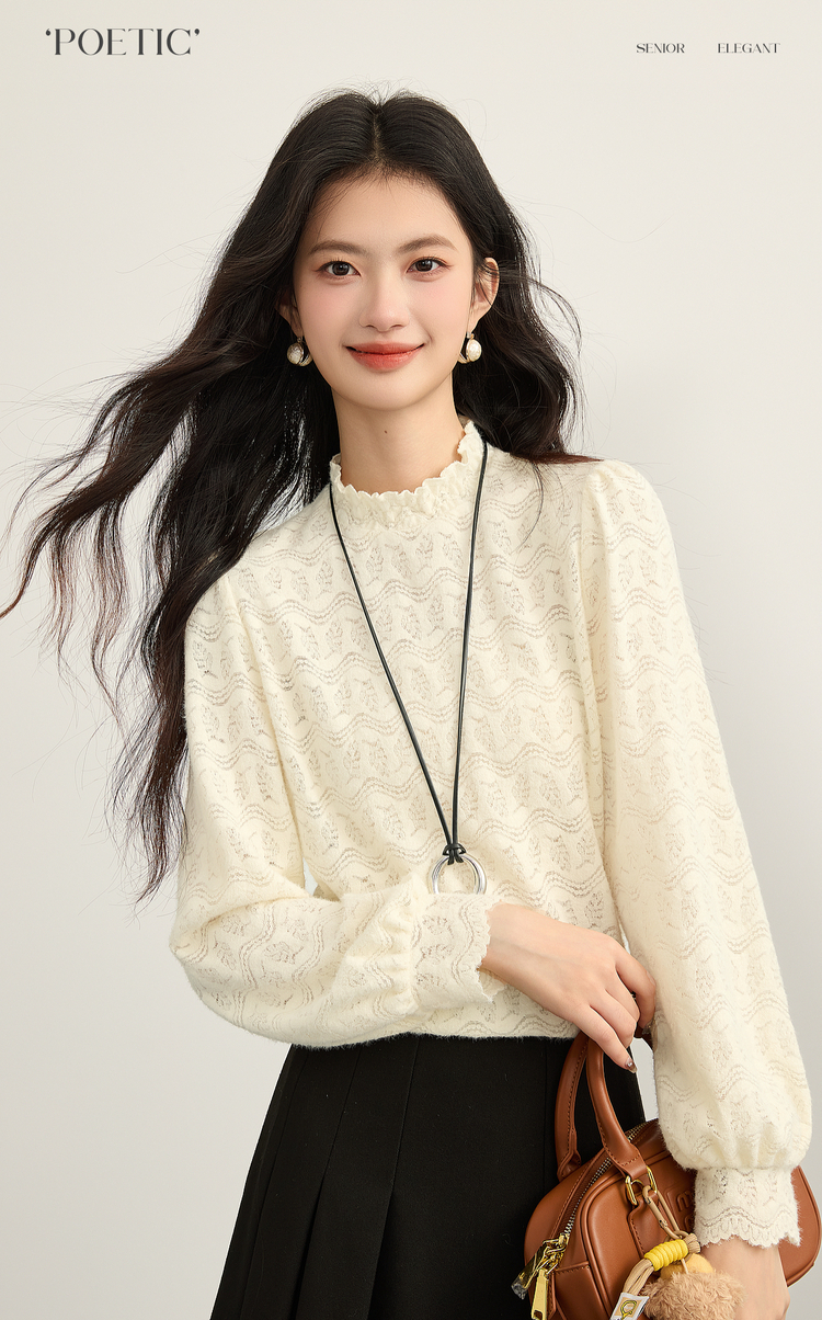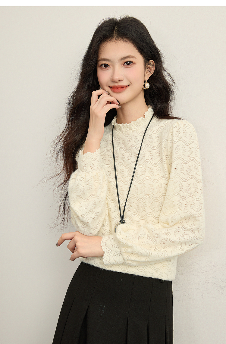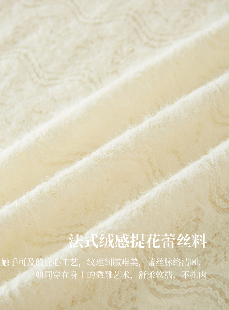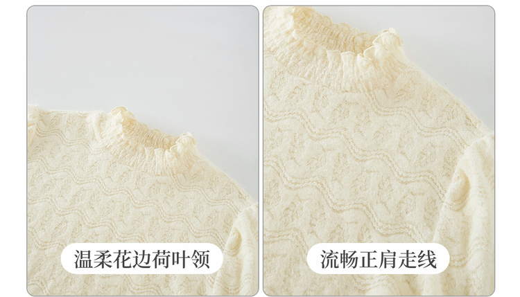【年货节】熙世界法式绒感蕾丝打底衫女秋冬2025年新款杏色木耳边半高领上衣