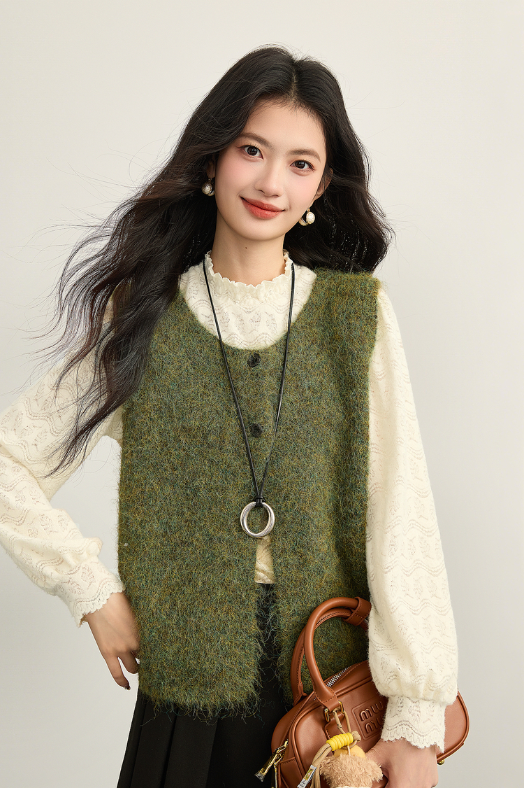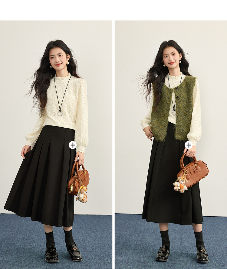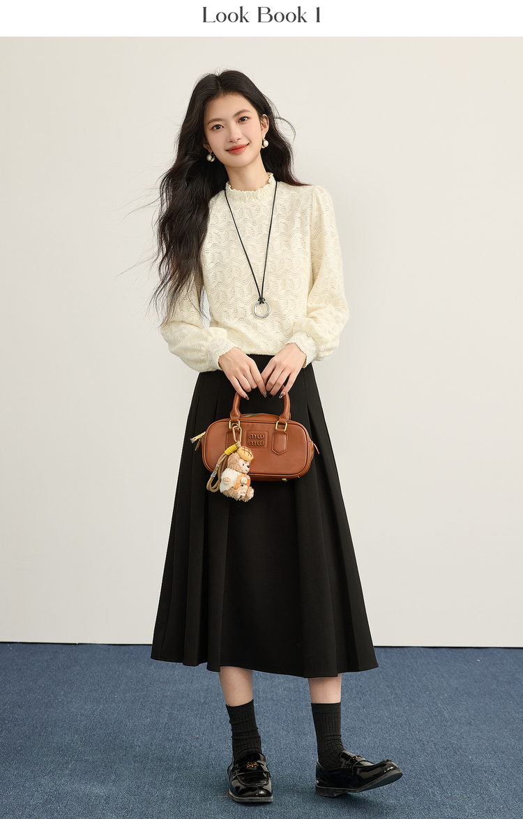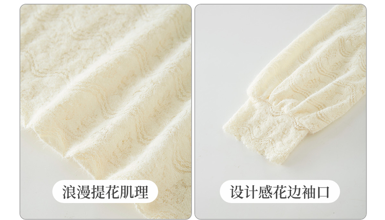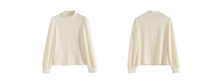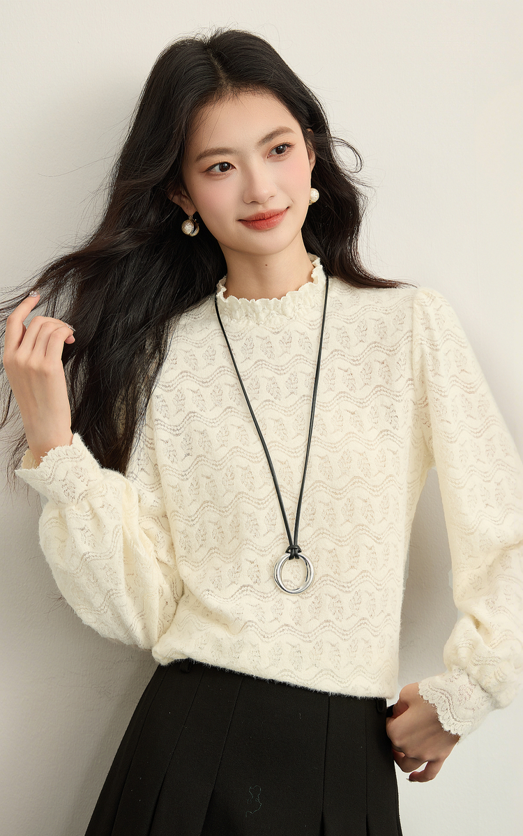 【年货节】熙世界法式绒感蕾丝打底衫女秋冬2025年新款杏色木耳边半高领上衣