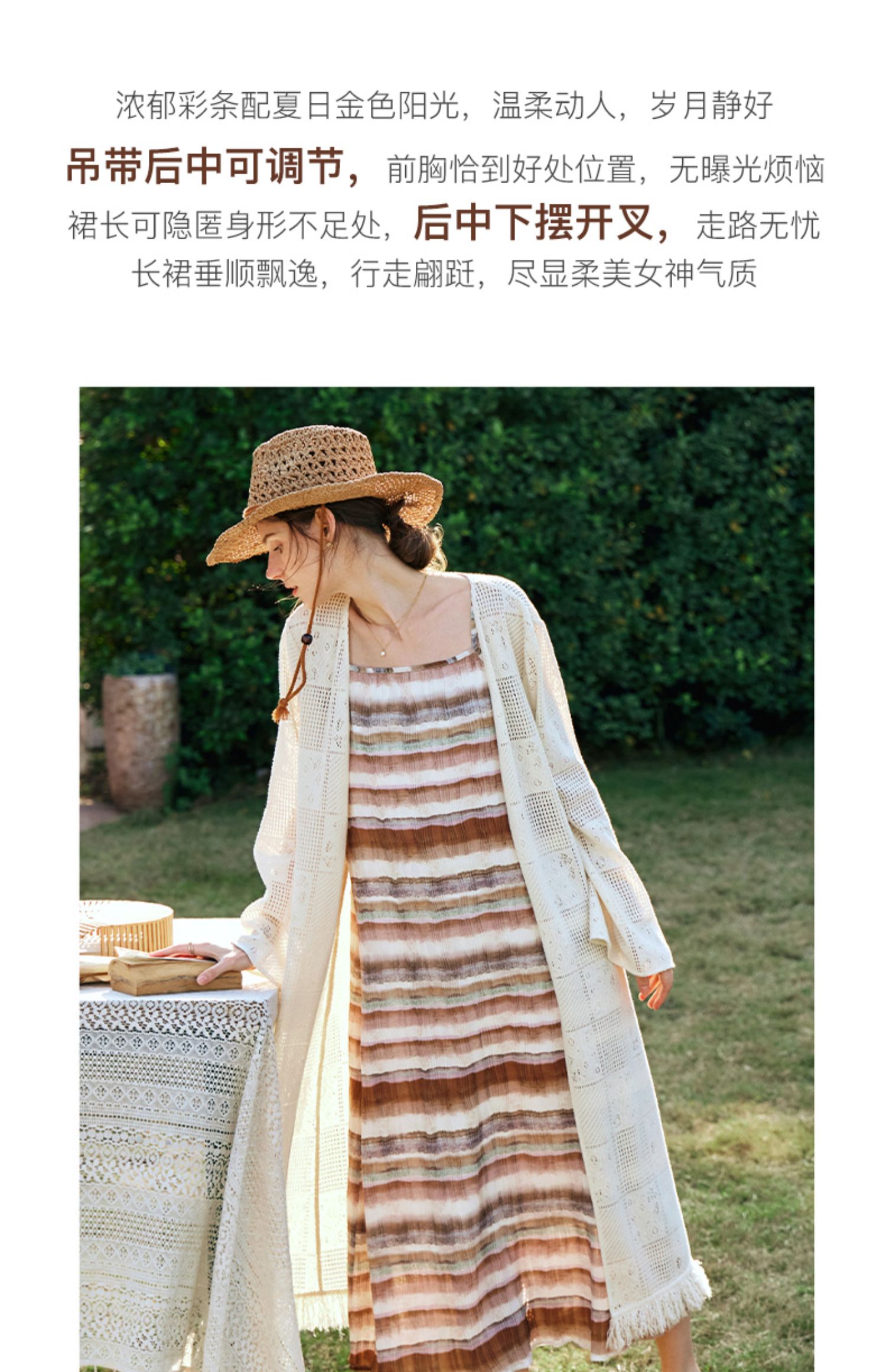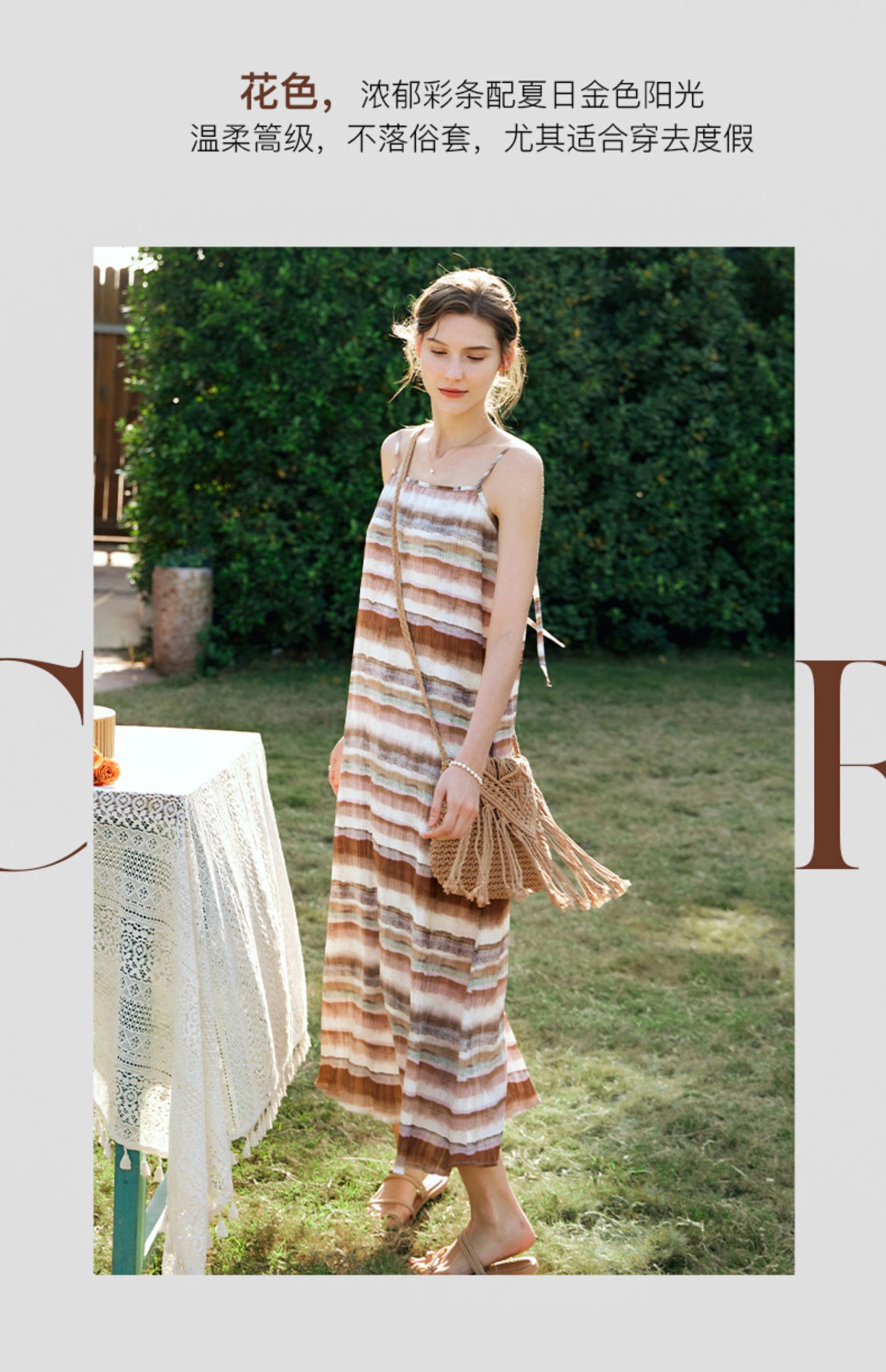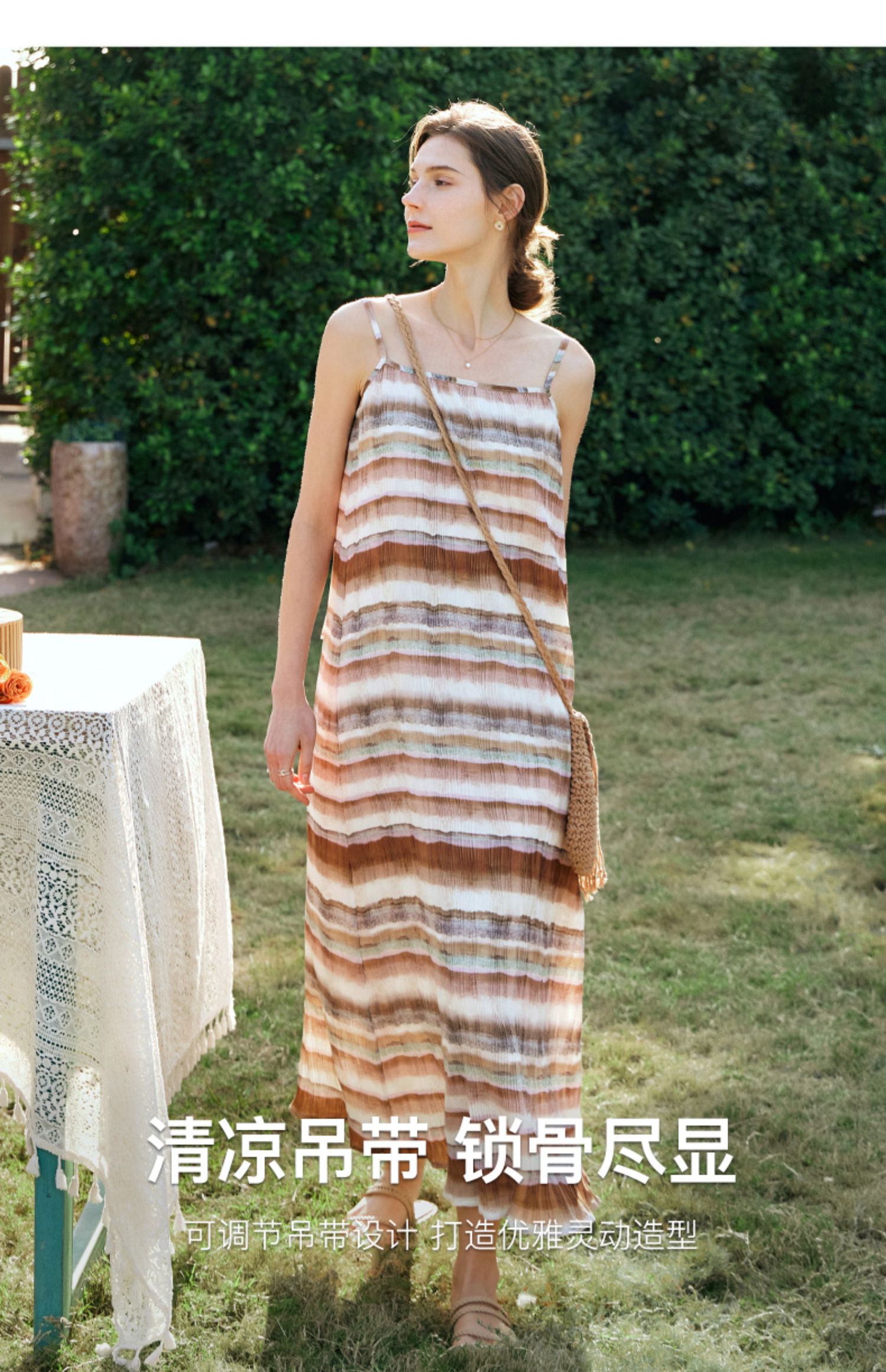 OLrain欧芮儿花色吊带连衣裙女早春2024新款度假风条纹开叉长裙
