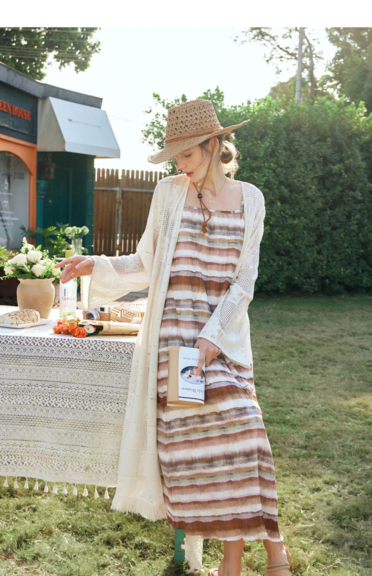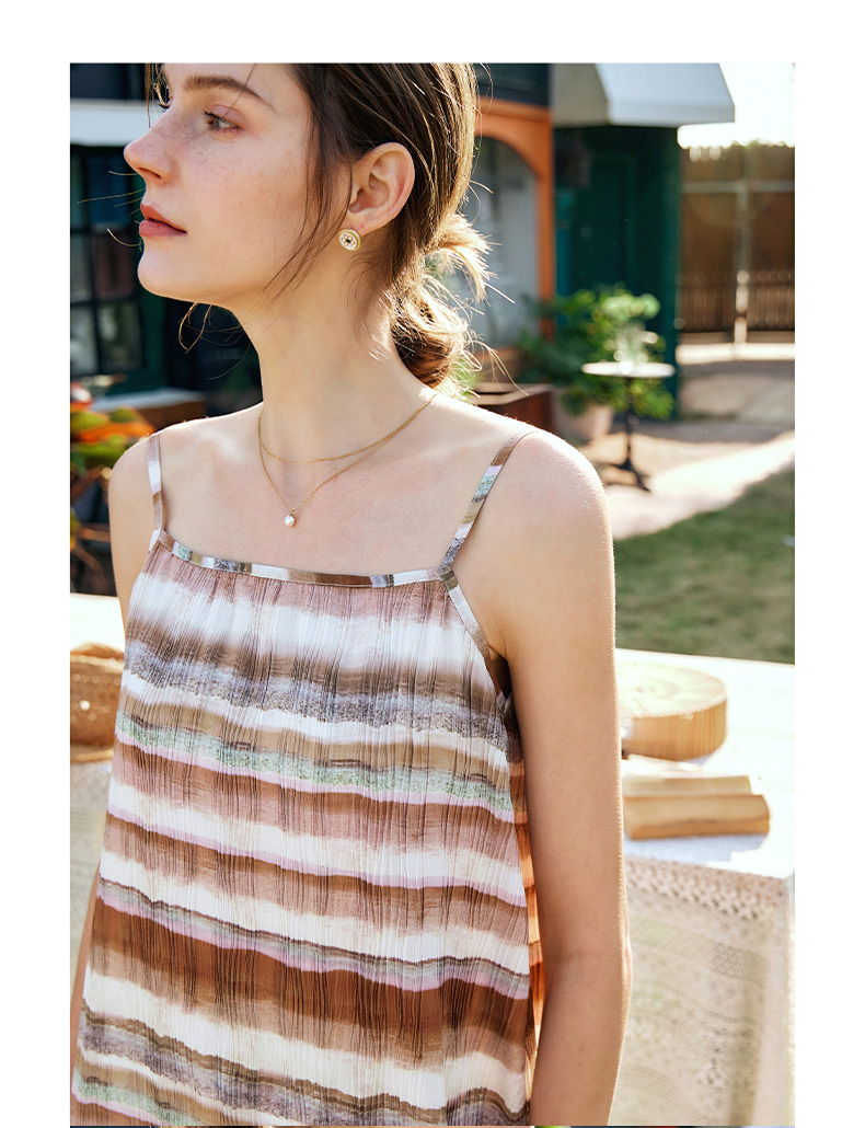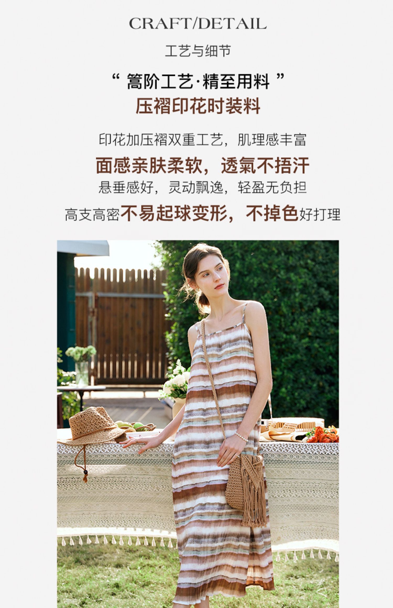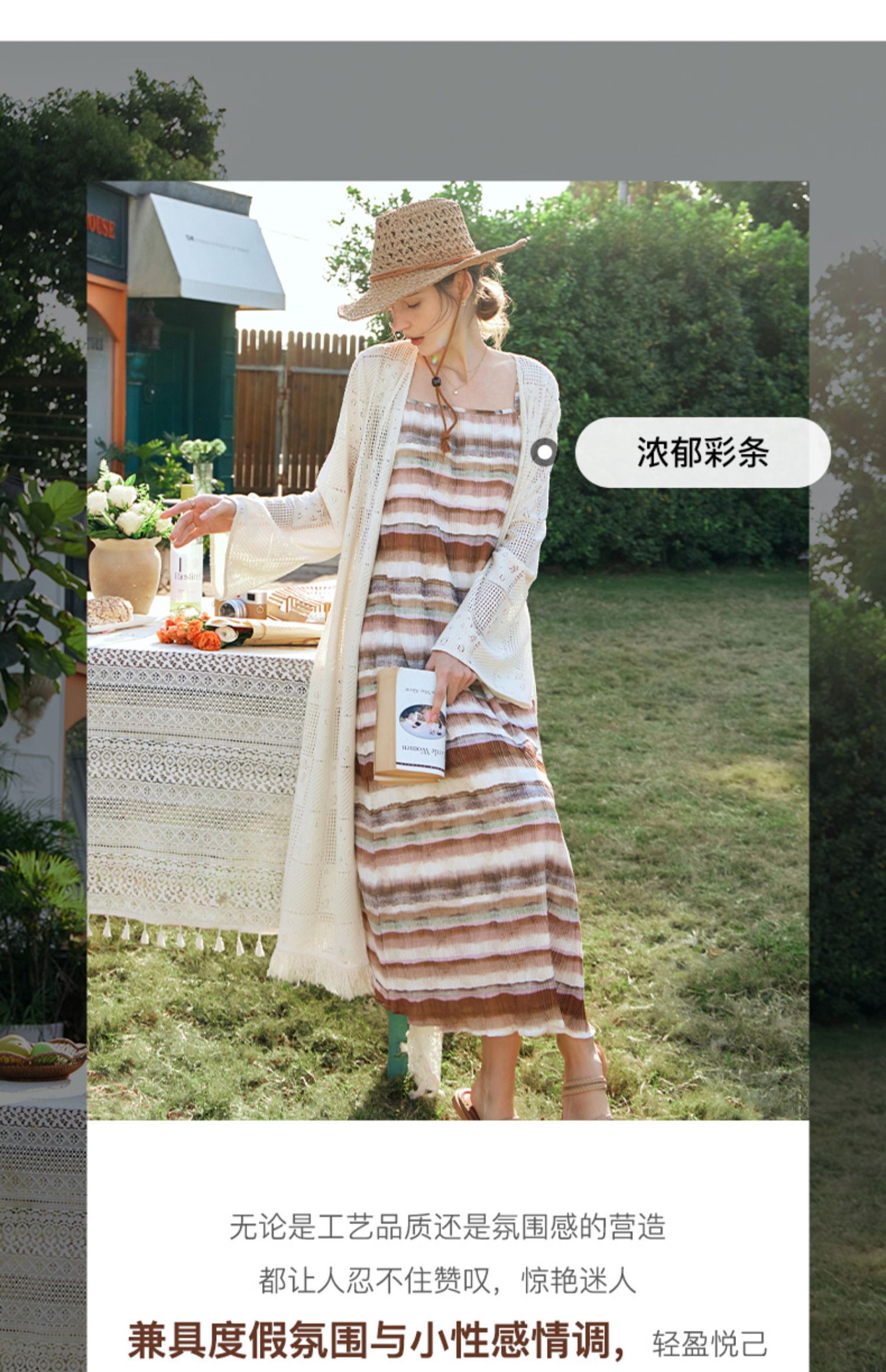OLrain欧芮儿花色吊带连衣裙女早春2024新款度假风条纹开叉长裙