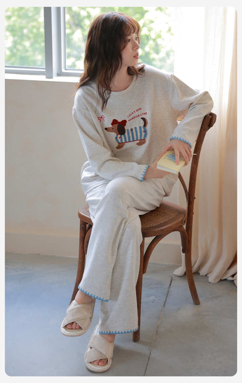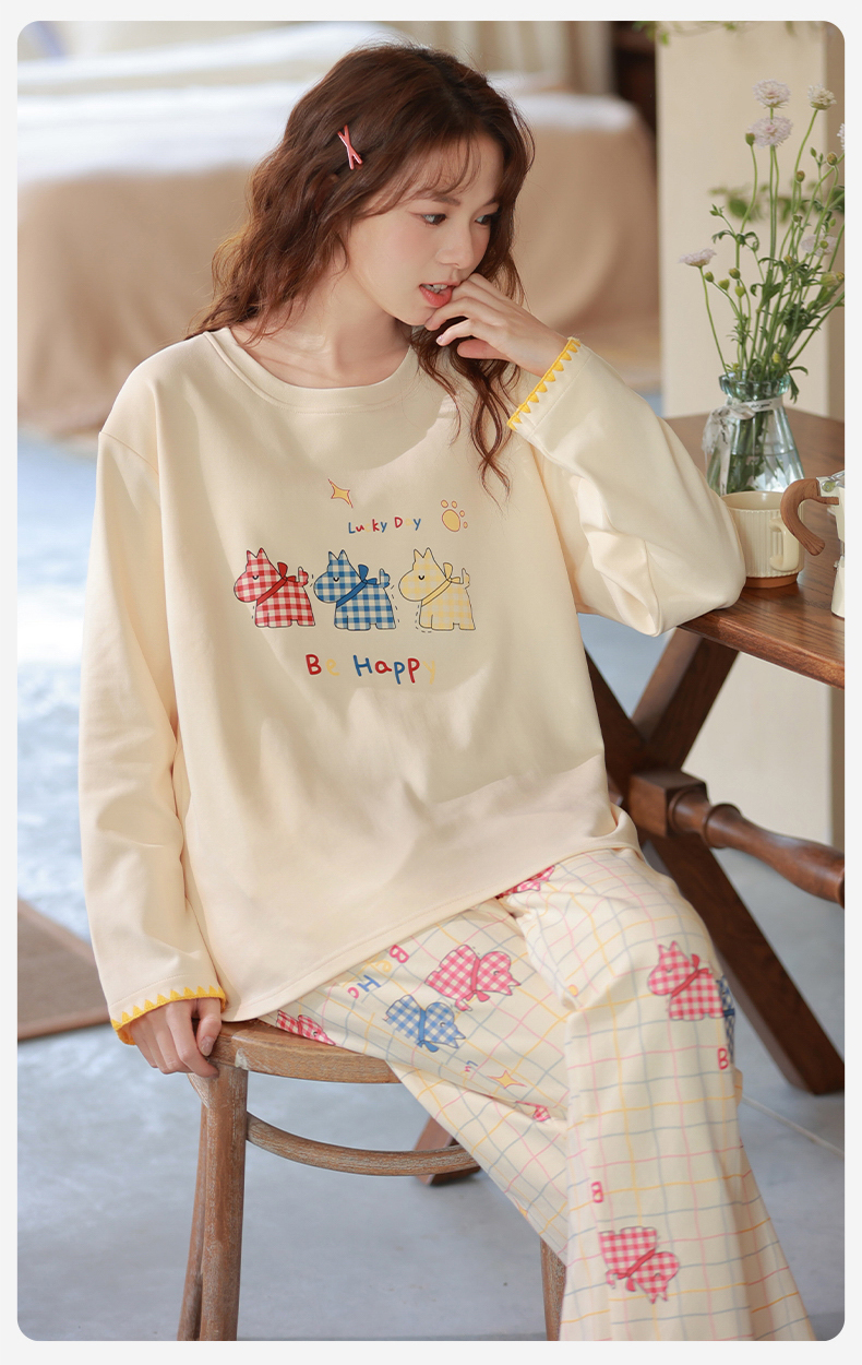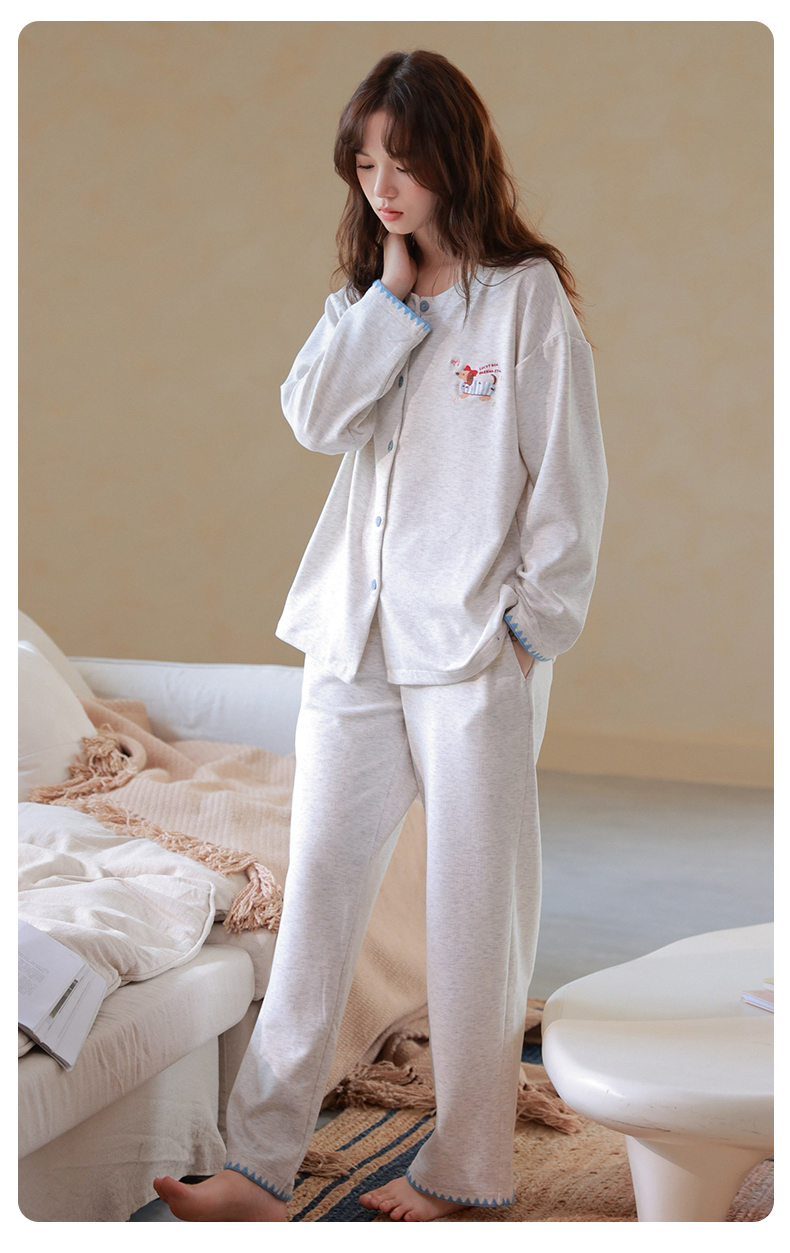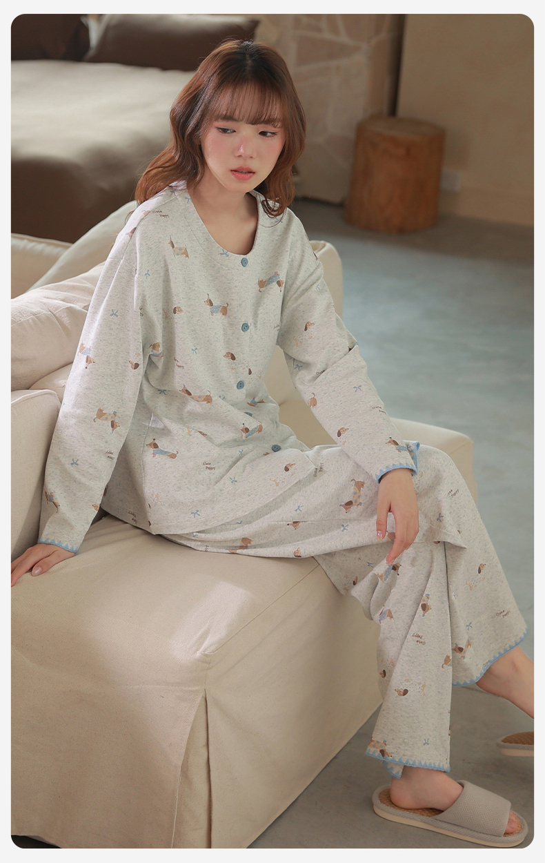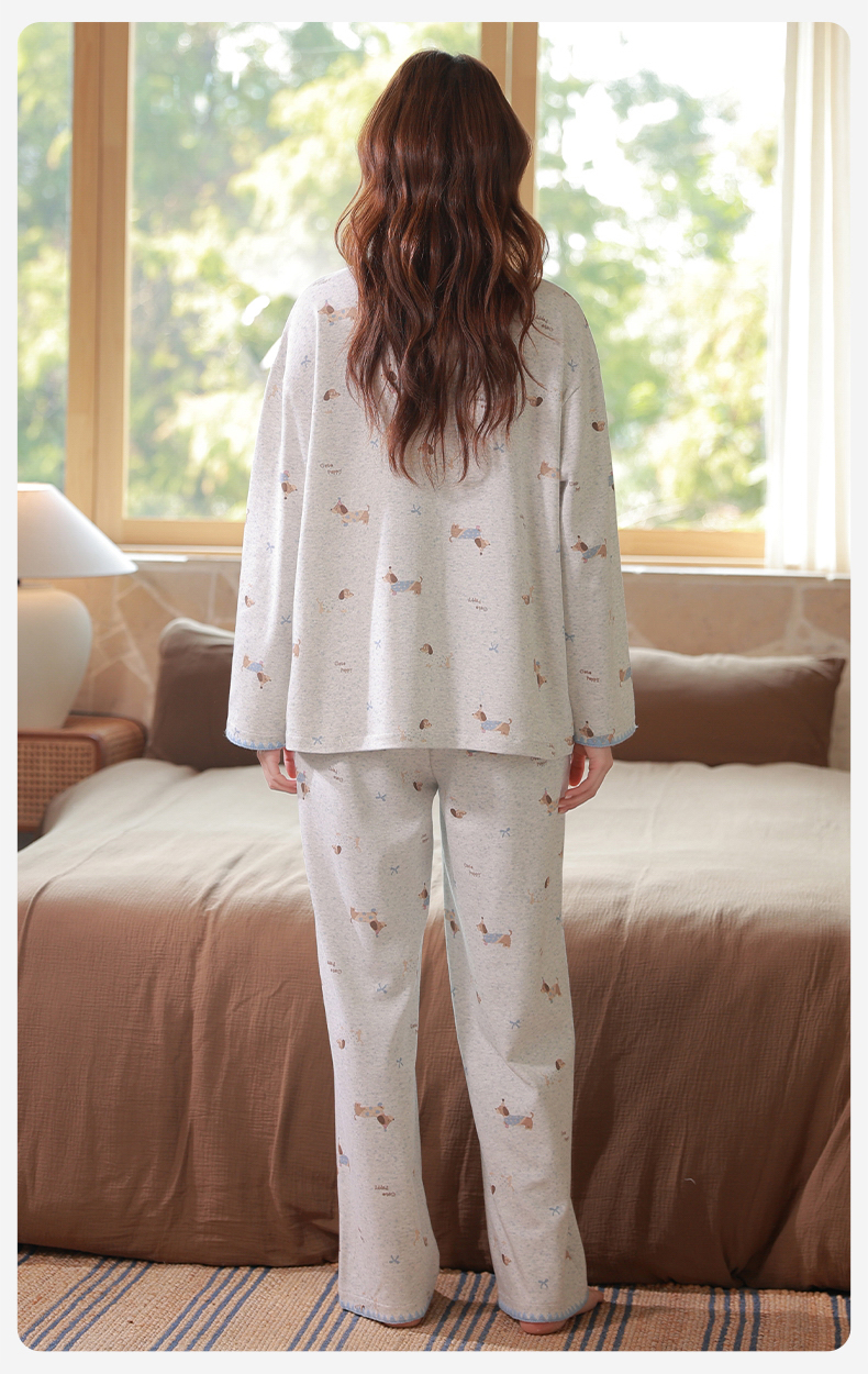 爱帝新款纯棉睡衣套女士文艺印花长袖家居服套装免穿文胸