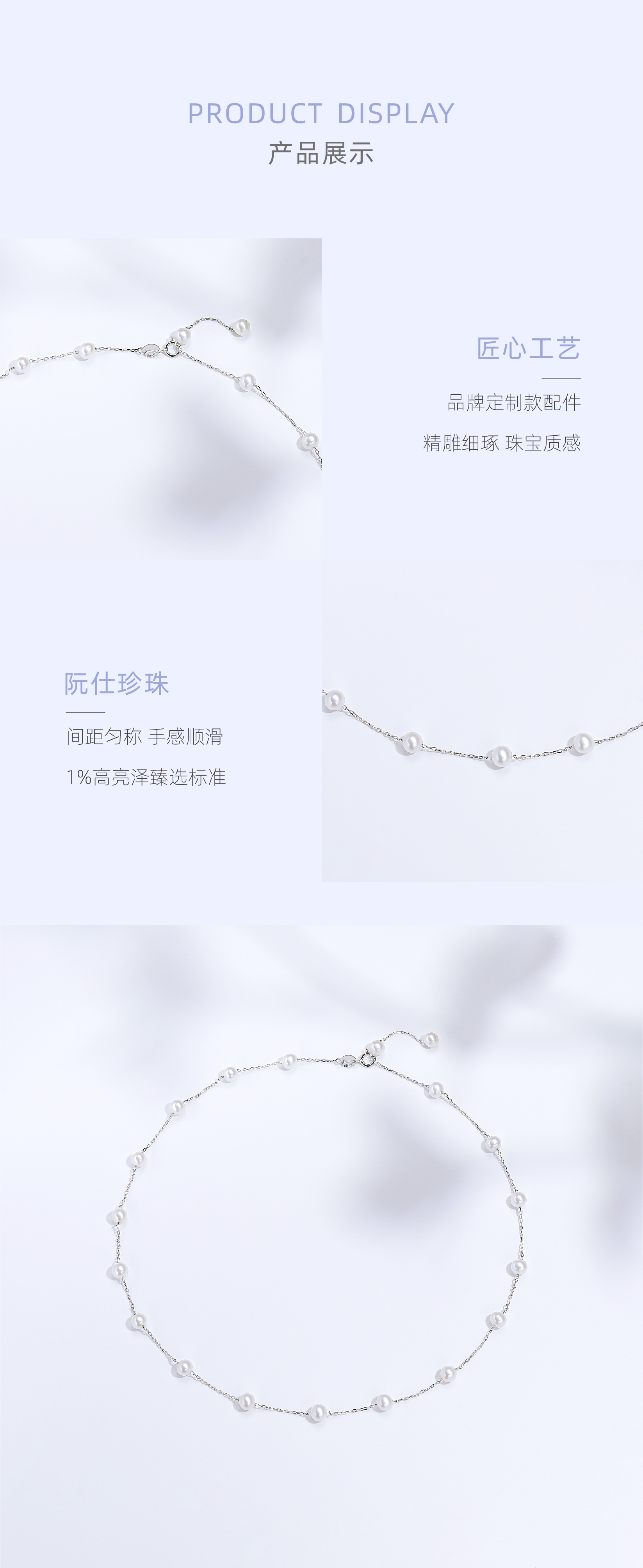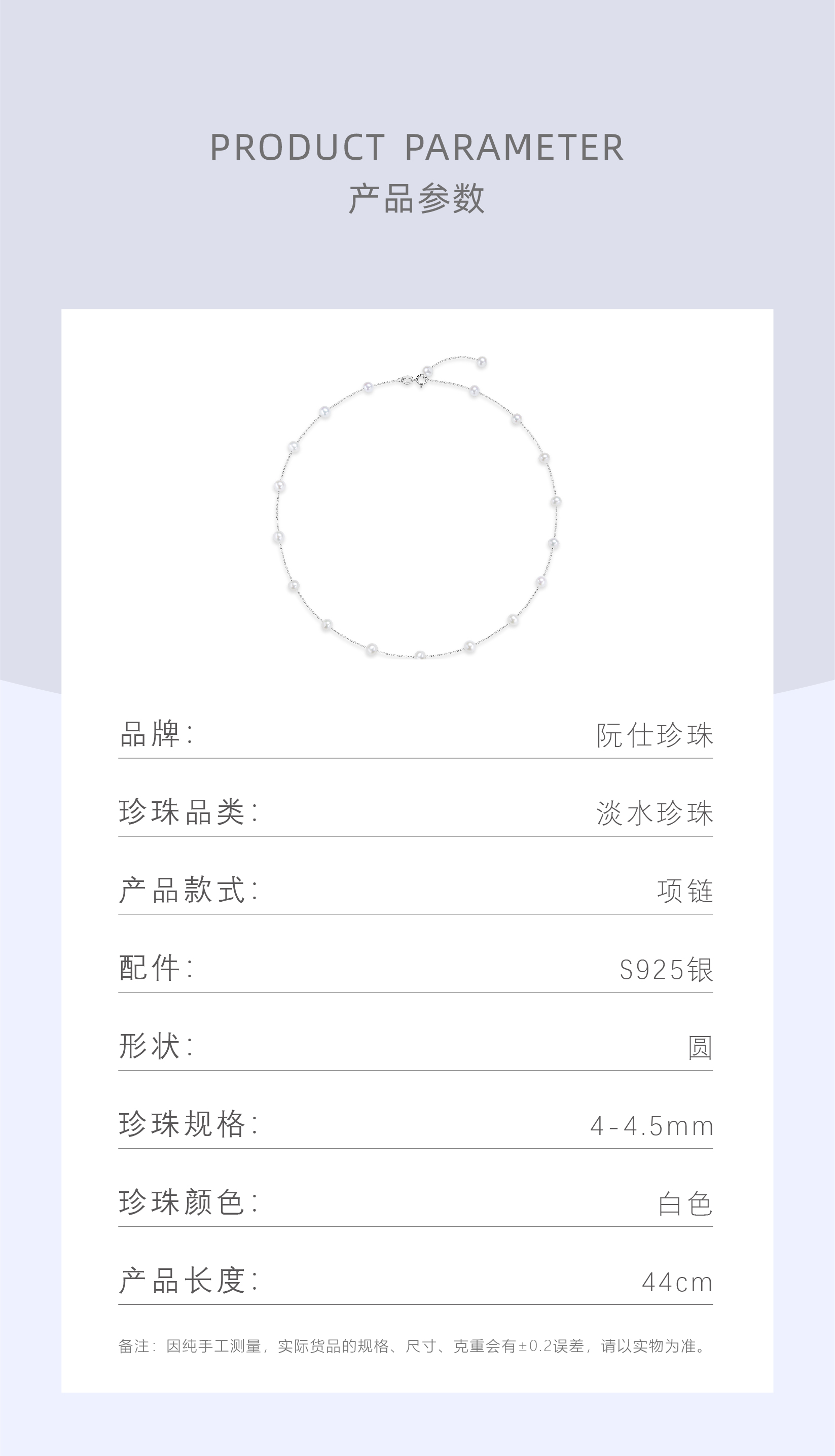 阮仕星际系列S925银 淡水珍珠满天星链牌 4-4.5MM 圆 极微瑕 极强光 NGS4-4.5XJD