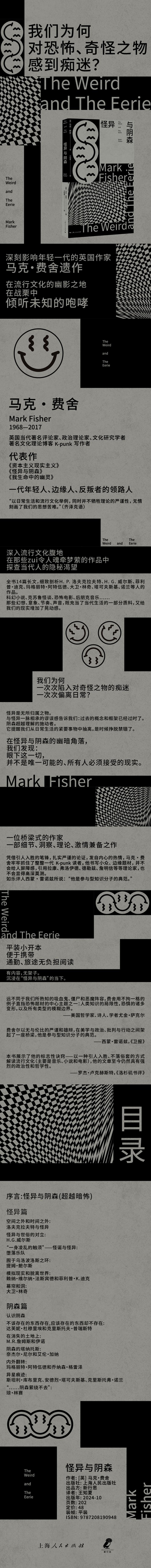恐怖之物为何令人痴迷?又为何必要?《怪异与阴森》是英国当代文化理论家马克·费舍的遗作,全书共十四篇文章,集中探讨了流行文化中的恐怖主题,更准确地说,是“怪异”与“阴森”这两个概念。20 世纪一些最令人魂牵梦萦、最反常的小说就属于这两种模式。费舍探讨了众多流行作家、导演、音乐人的作品。 怪异和阴森,从根本上说,是对未知的刺探,是日常世界偏离自身的方式。马克·费舍将这两个概念定义为激进的叙事模式或“超验的震撼”时刻,要正确理解人类的生存状态,就必须对这类边缘概念进行研究。从这种意义上看来,科技、资本也是这样一种阴森可怖的存在。