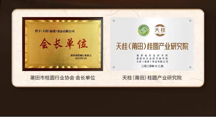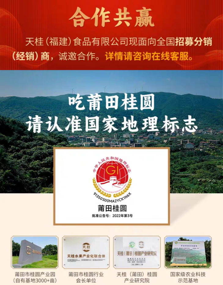 🔻 天桂(福建)食品有限公司2017年,以振兴乡村、滋养美好生活为使命,致力于“三产融合”发展并打造中国桂圆第一品牌。 🔻 公司总部位于妈祖故里,素有“海滨邹鲁”美誉的桂圆黄金产区--福建莆田。 🔻 天桂作为莆田市桂圆行业协会会长单位,为振兴家乡桂圆产业,建立桂圆产业联合体,打造莆田市首个桂圆产业园,规划建设数万亩直控桂圆基地。 🔻 公司大力发展产学研合作,聘请省市桂圆产业界技术专家为天桂农业技术顾问,联合福建省农业科学院、莆田市农业科学研究所共同成立天桂(莆田)桂圆产业研究院。