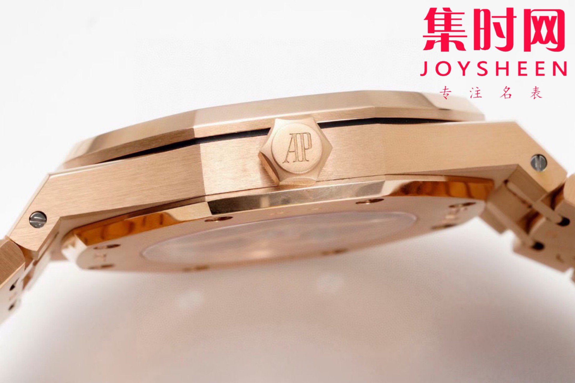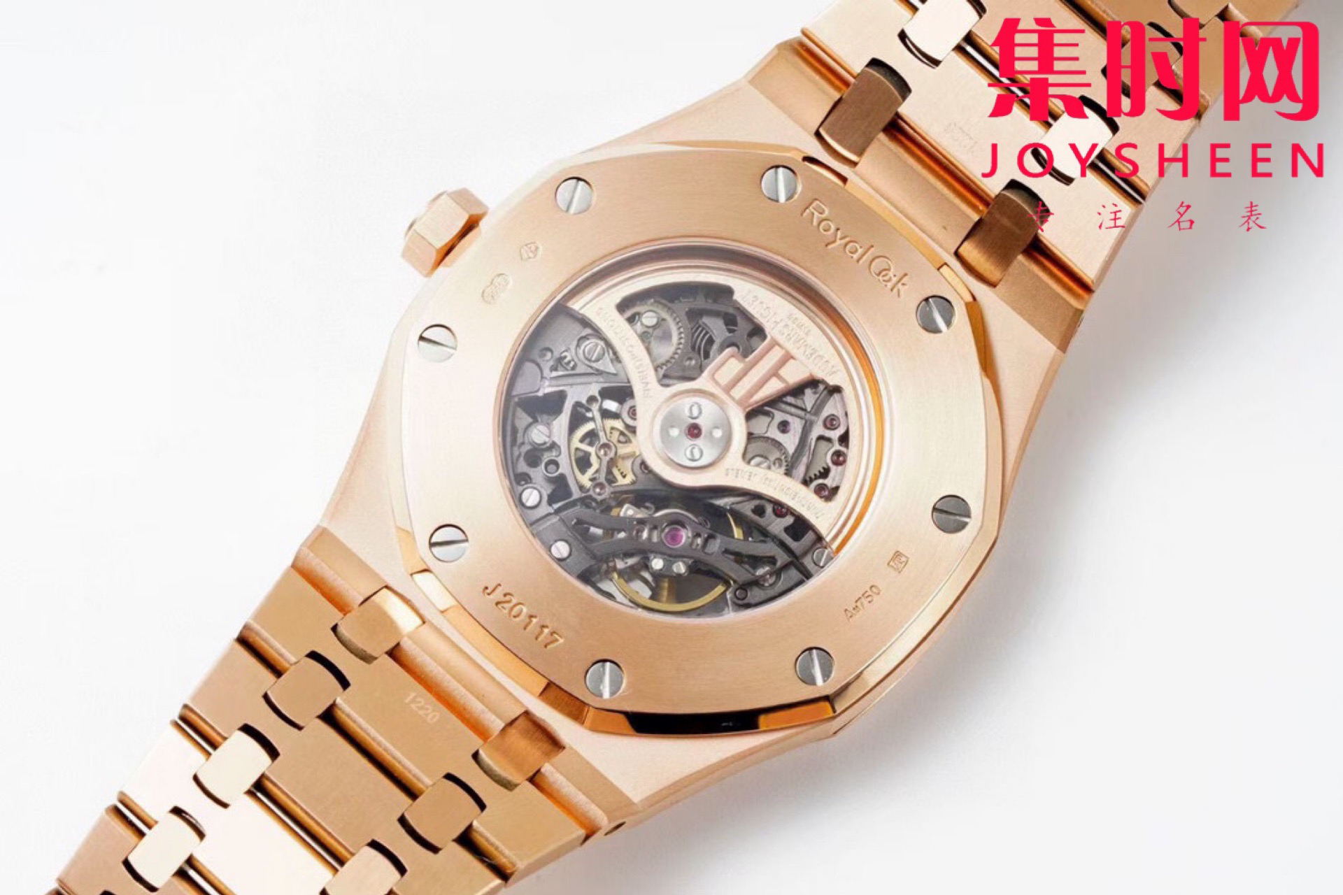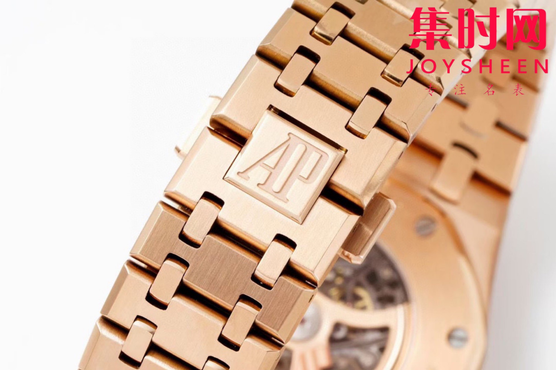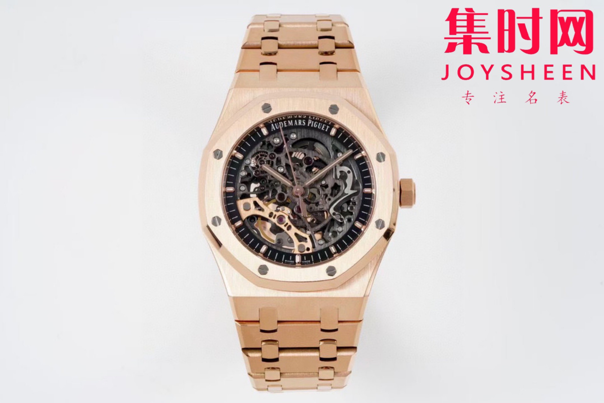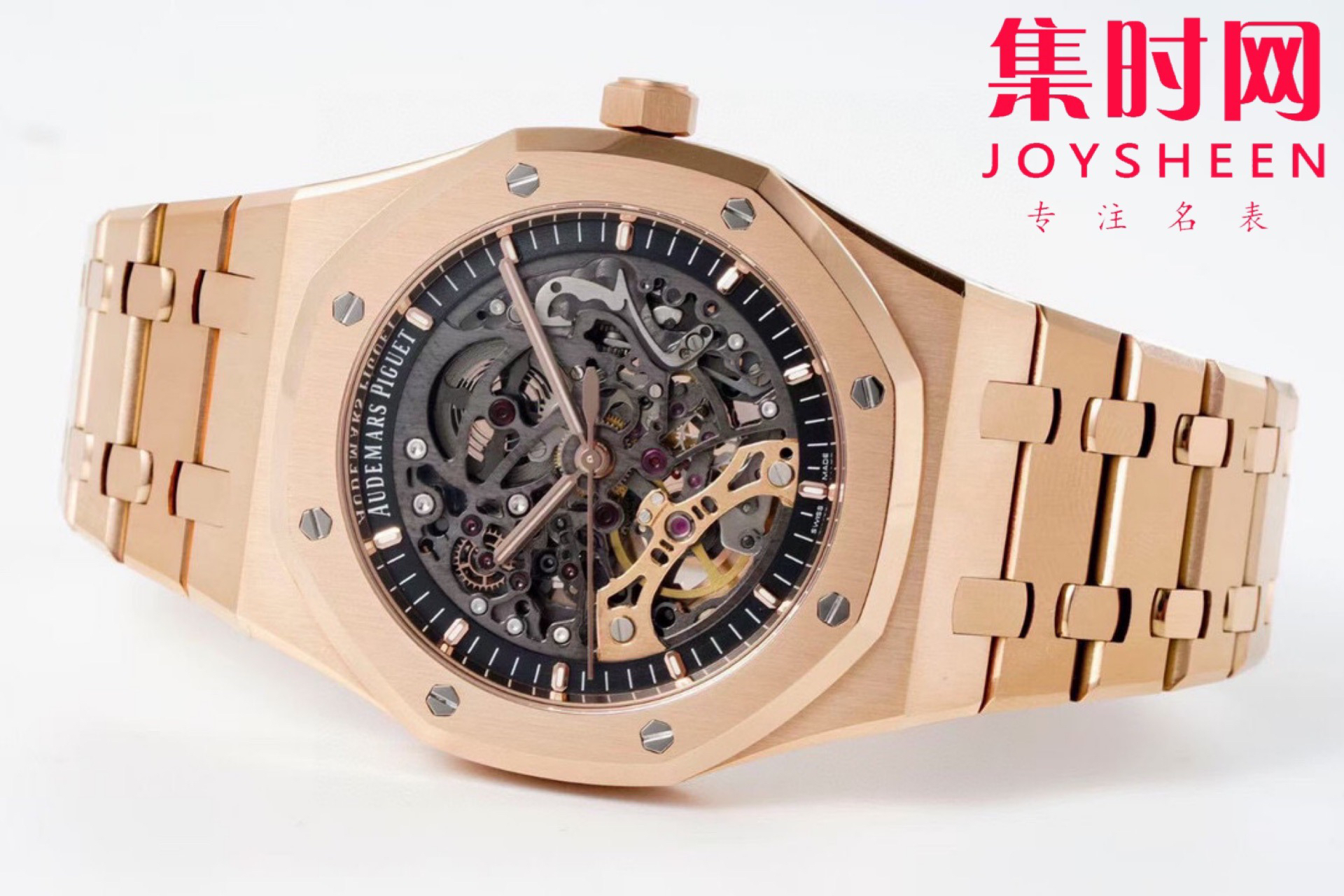 表盘材质:镂空表盘 搭配玫瑰金荧光立体时标和皇家橡树指针
