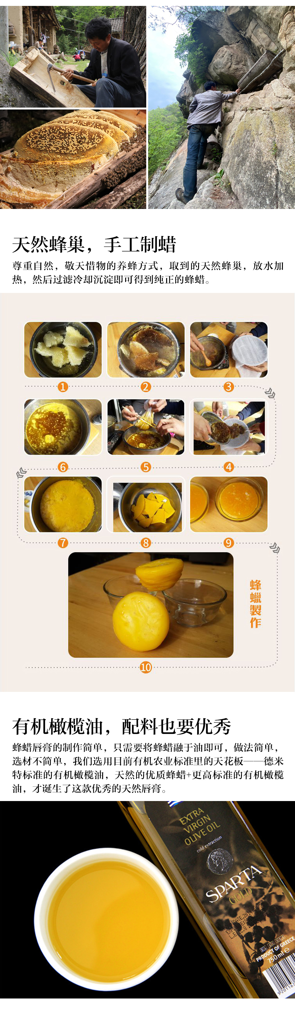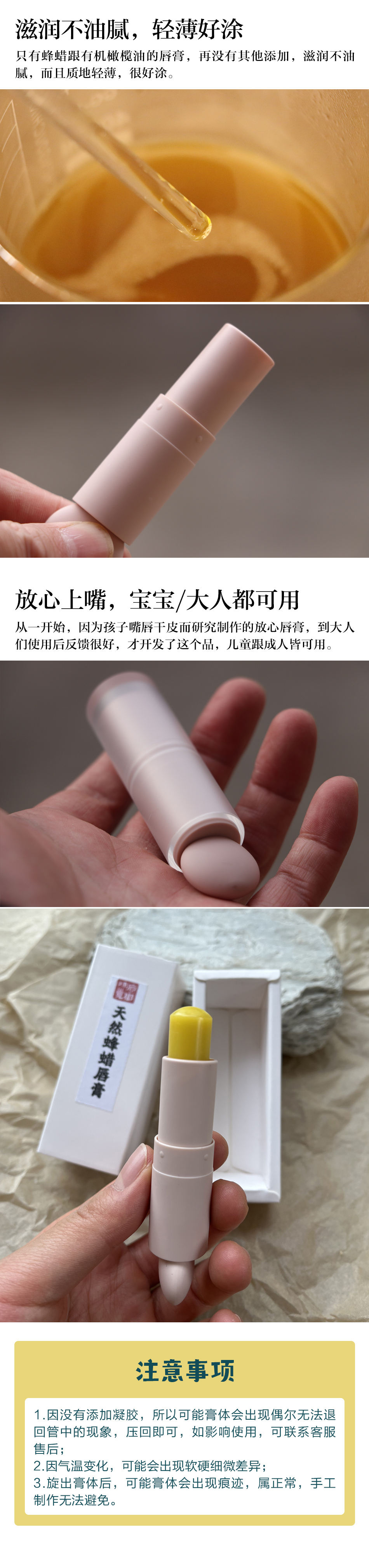 【配料】:蜂蜡、有机橄榄油 【规格】:4g 【制作者】:刘蜜书 【保质期】:12个月 【味道】:蜂蜡香,蜜香,野花混合气味 【制作方式】:无添加,手工制作 【产地】:陕西·汉中 【注意事项】: 1.因没有添加凝胶,所以可能膏体会出现偶尔无法退回管中的现象,压回即可,如影响使用,可联系客服售后; 2.因气温变化,可能会出现软硬细微差异; 3.旋出膏体后,可能膏体会出现痕迹,属正常,手工制作无法避免 |