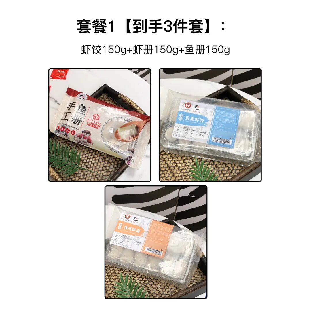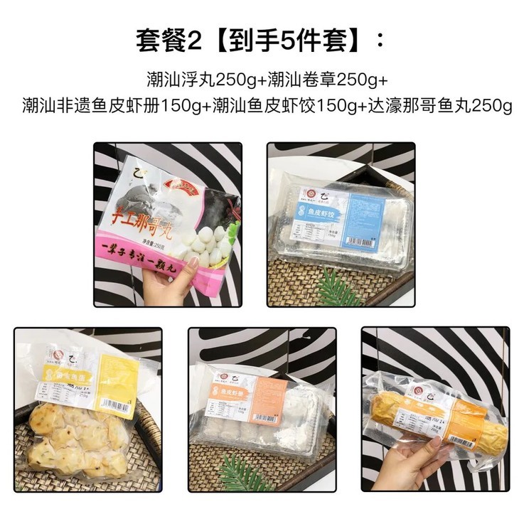 潮汕浮丸250g+潮汕卷章250g+潮汕非遗鱼皮虾册150g+潮汕鱼皮虾饺150g+达濠那哥鱼丸250g