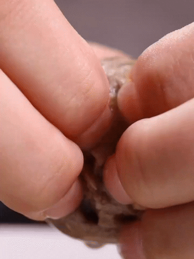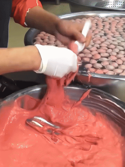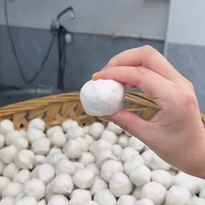 老师傅揉压鱼糜到起胶,再手工挤丸