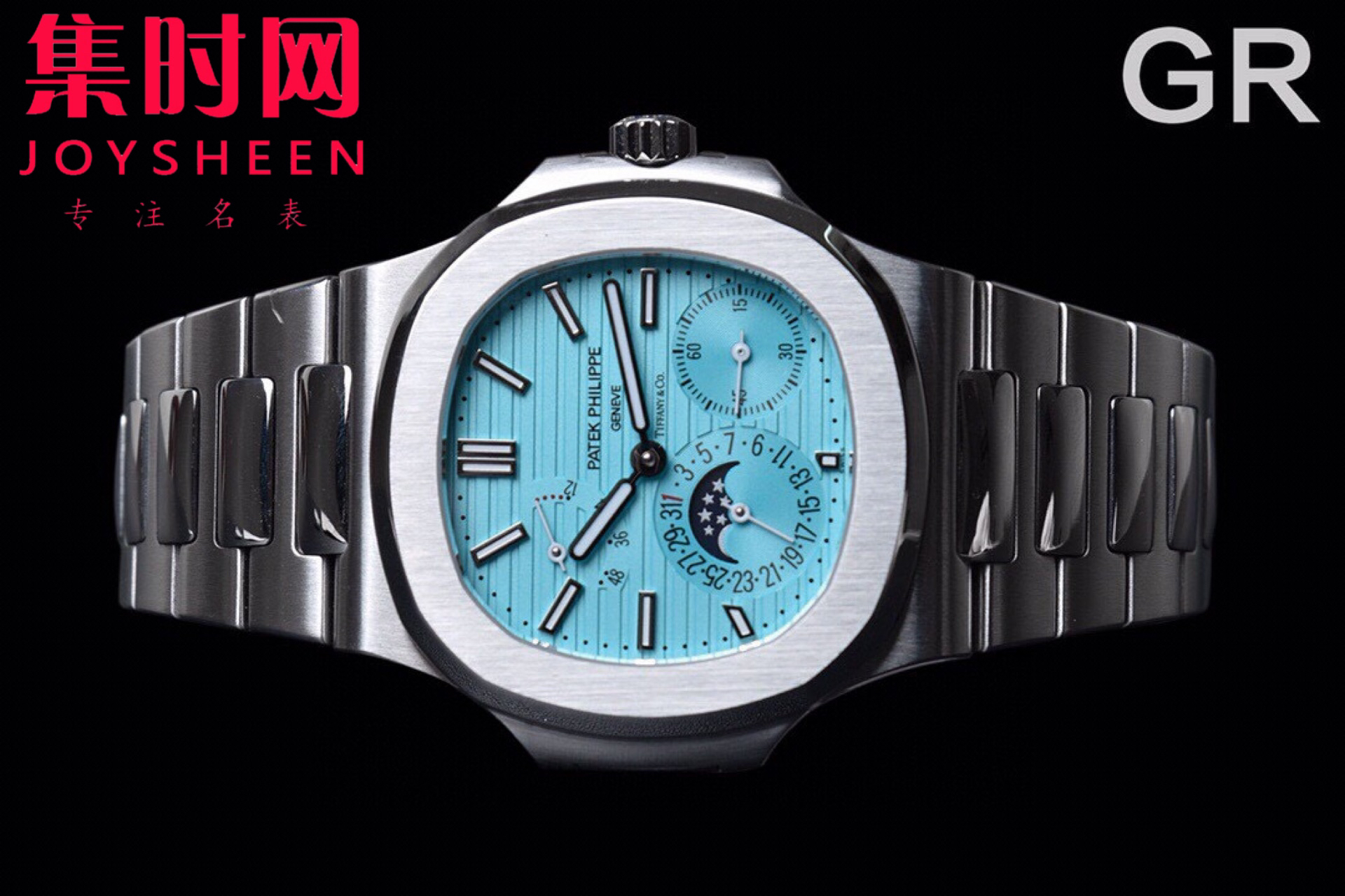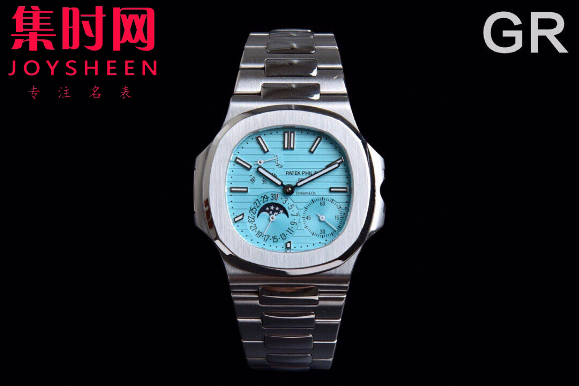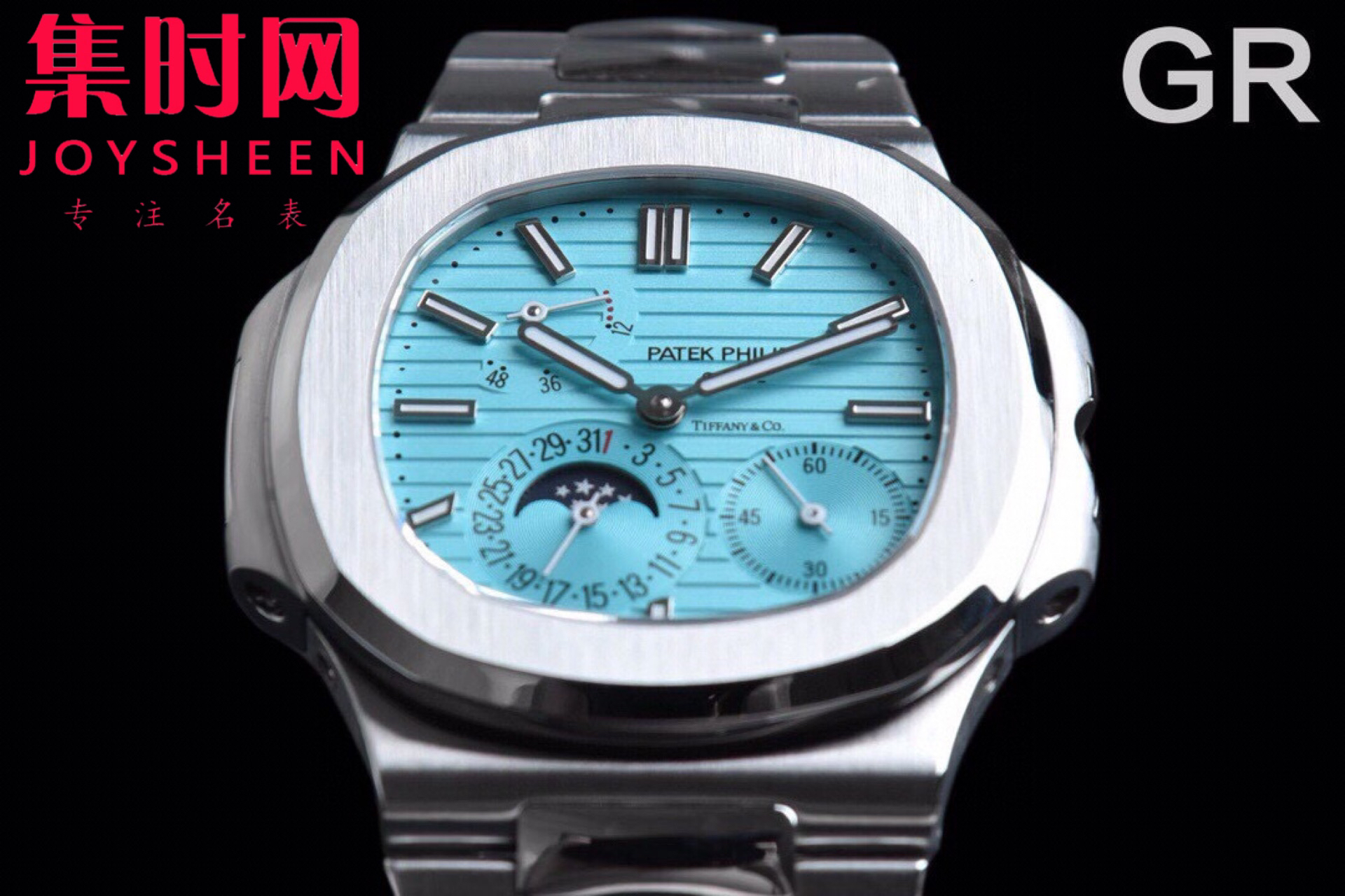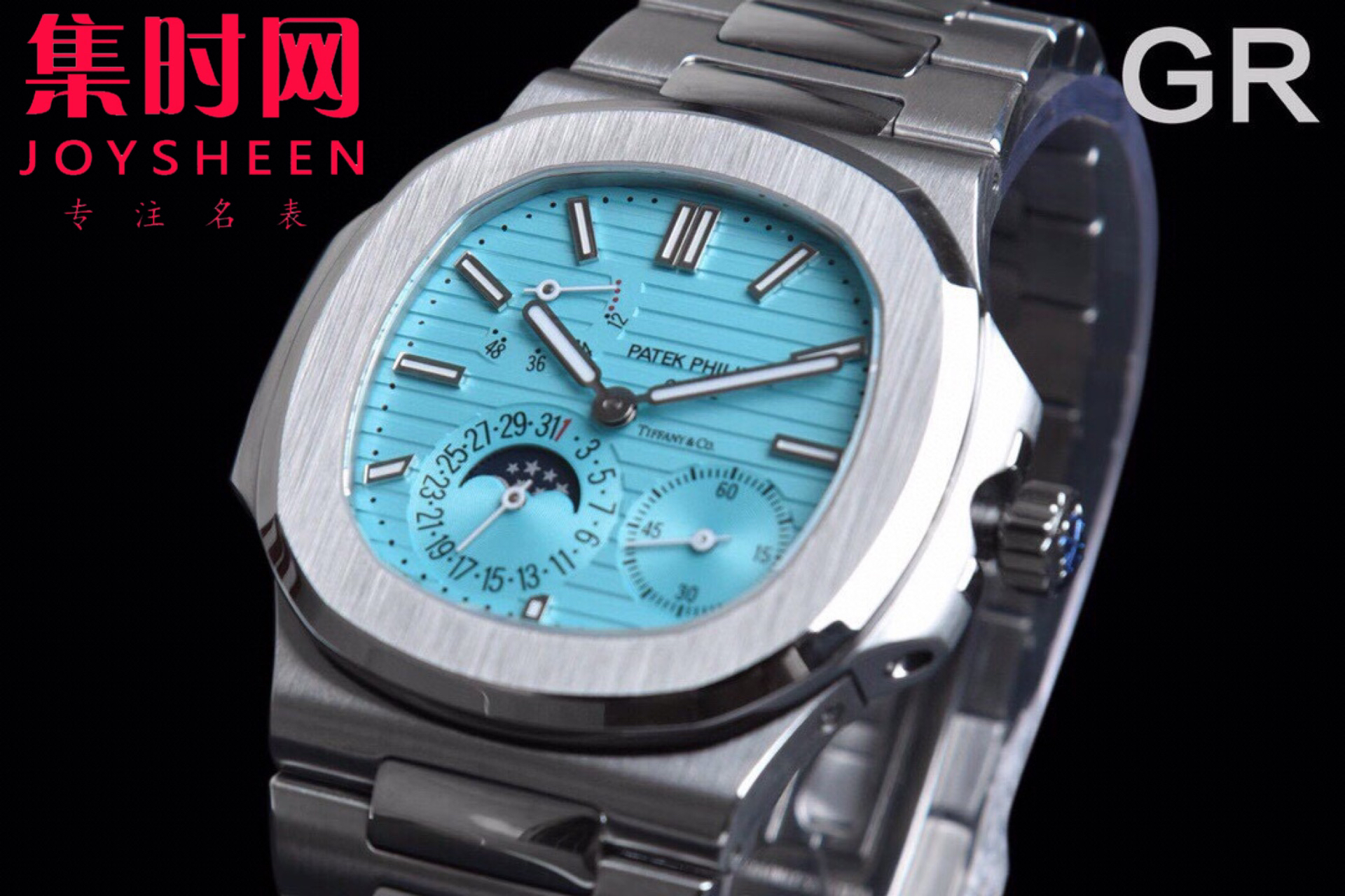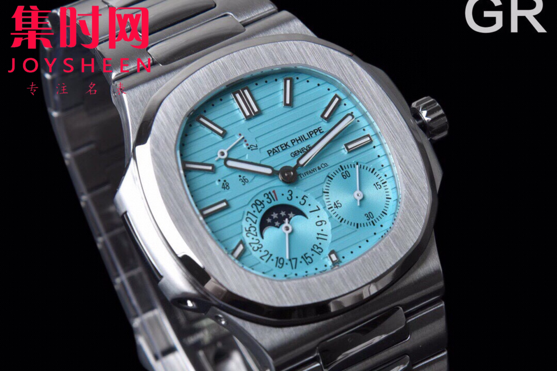 新品真正的王炸 百达翡丽GR鹦鹉螺5712系列 总裁5712蒂芙尼蓝 百达联名Tiffany全球限量款 男士腕表 5712GR“钢王之王” 震撼来袭!搭载全新超级一体机Cal.240 PS IRM C LU全自动机械机芯。全机芯零件265个,机芯宝石同色原装一色鸽子血,平面游丝,21600每小时振汤次数Gyromax带调节砝码的摆轮,稳定无误差。超薄壳套,厚度市面同级第0.95cm 仅次于原装厚度,全新修正的不锈钢表带,铰链部分根据真正的百达翡丽鹦鹉螺不锈钢表带拆解开发,和正品一致的贴合效果,秒杀市面上所有副本,铰链开合角度和正品一致,锁毕声音和正品相同,“蒂芙尼蓝”面无限接近原版,更是傲视群雄!