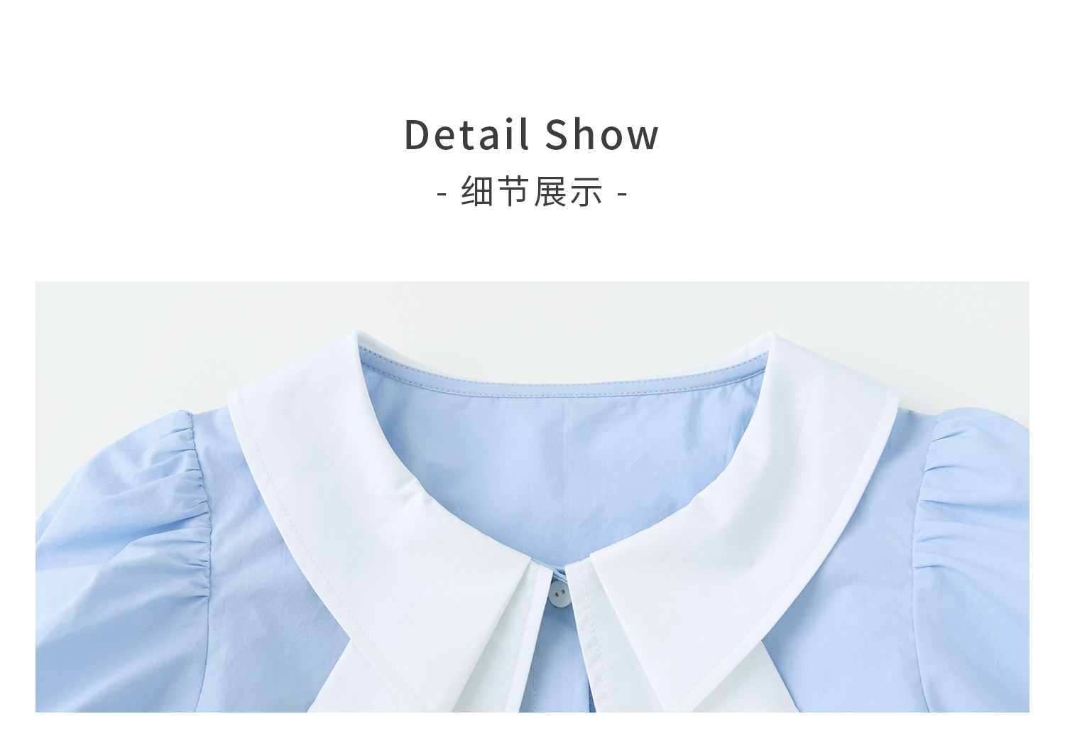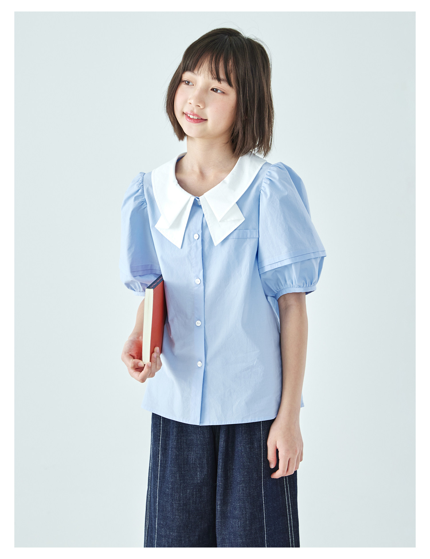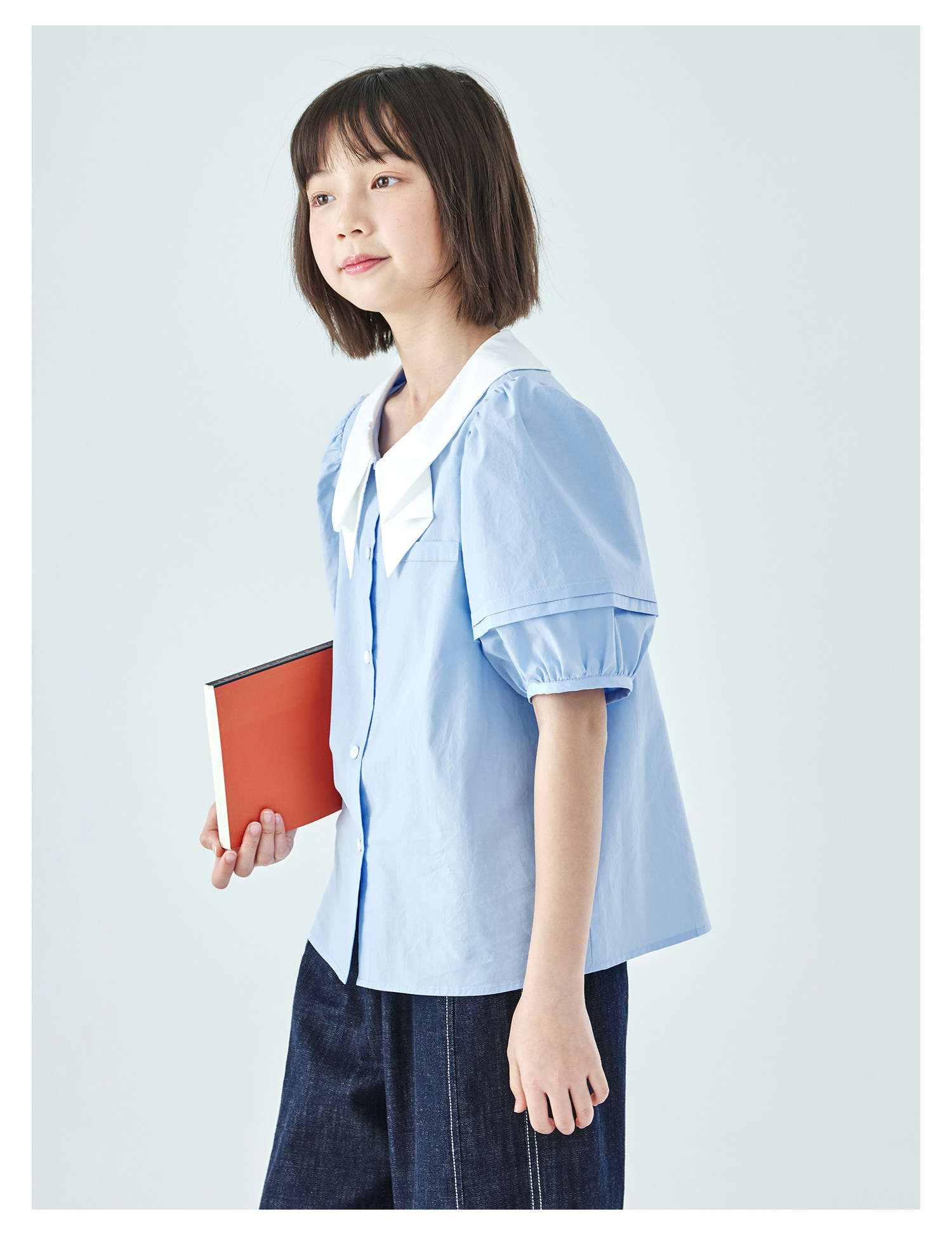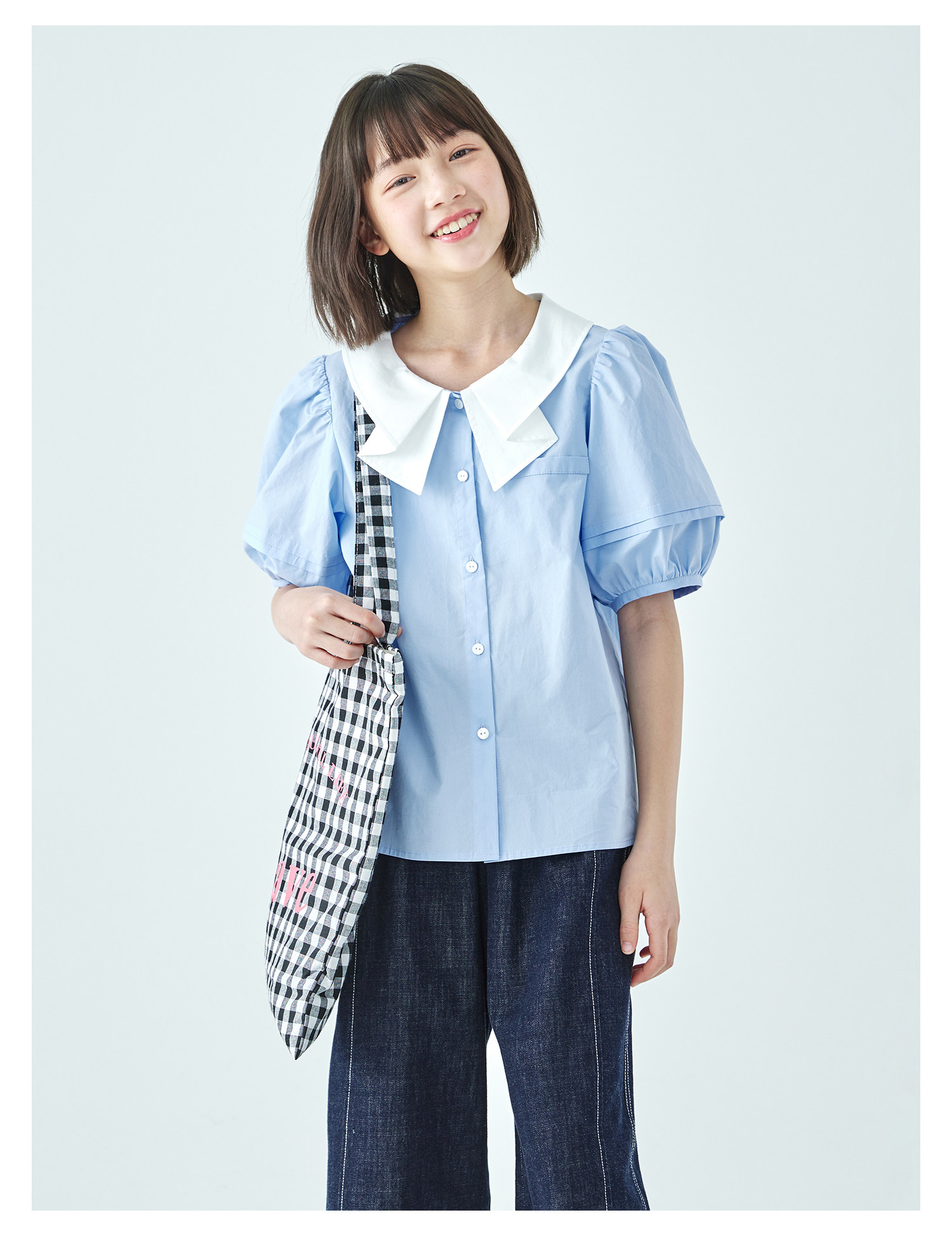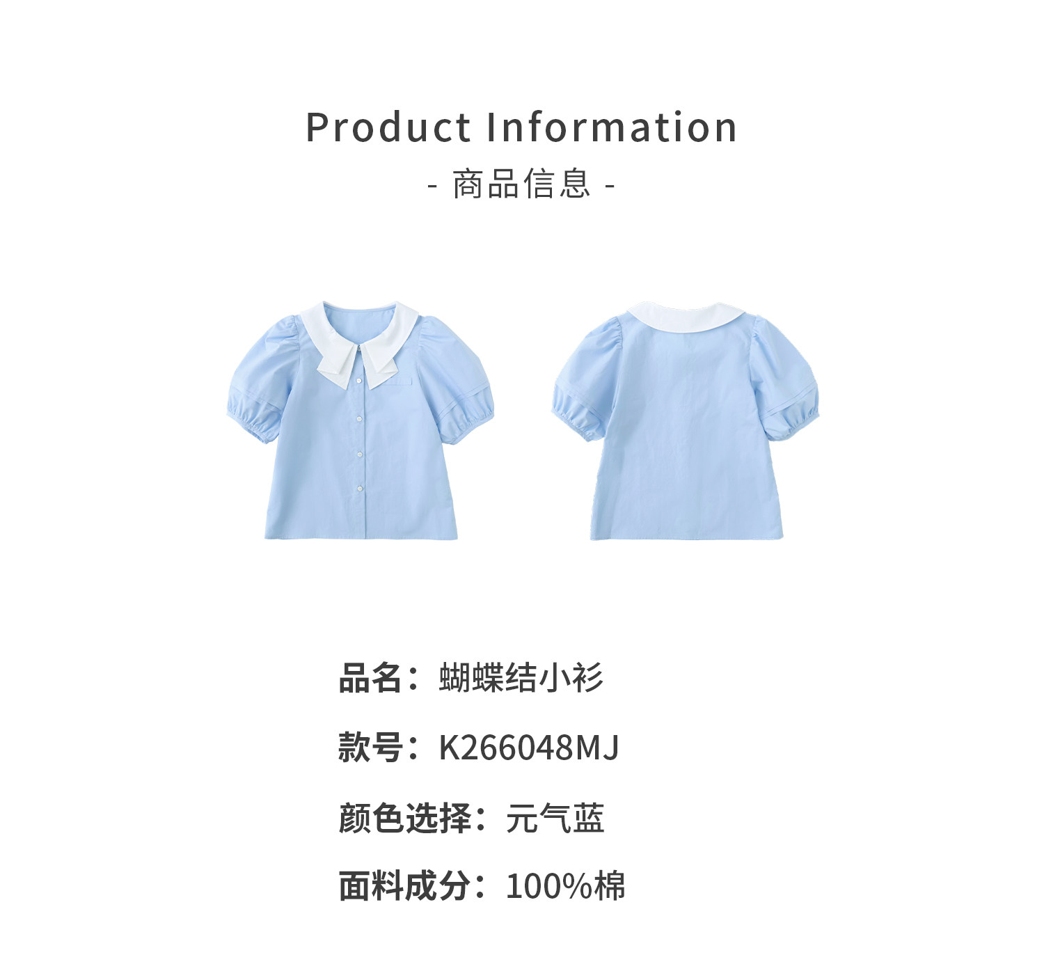 棵初26年夏季新款亲子中大女童蝴蝶结小衫泡泡袖蓝白撞色纯棉短袖