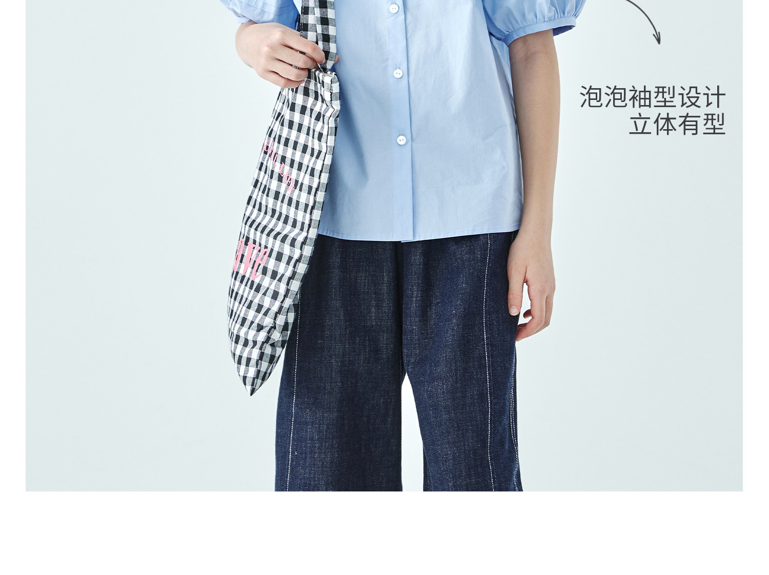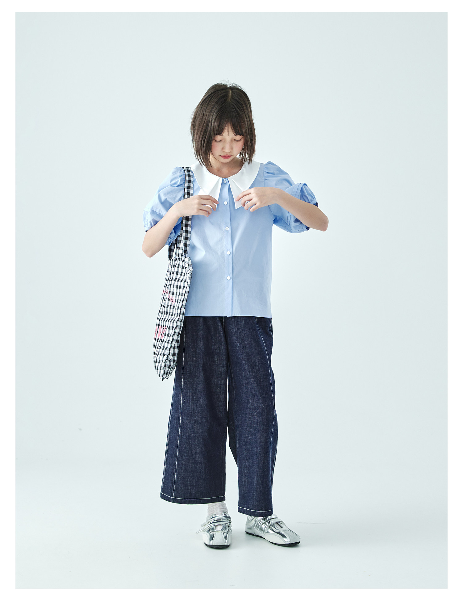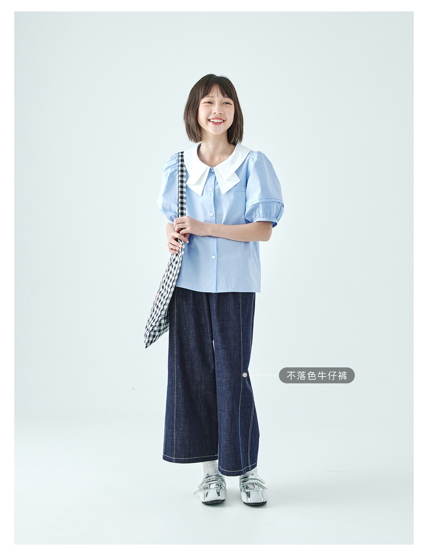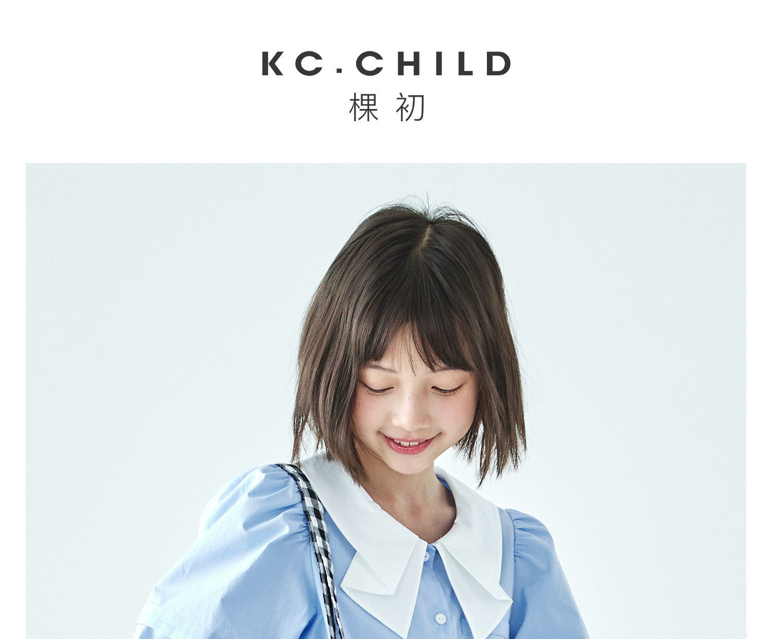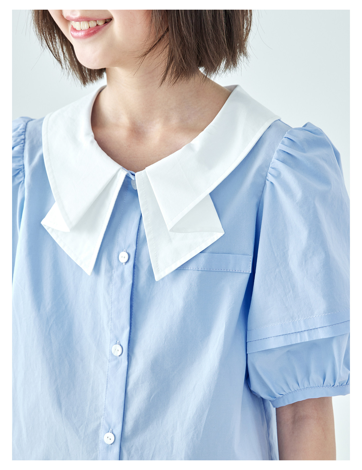 棵初26年夏季新款亲子中大女童蝴蝶结小衫泡泡袖蓝白撞色纯棉短袖