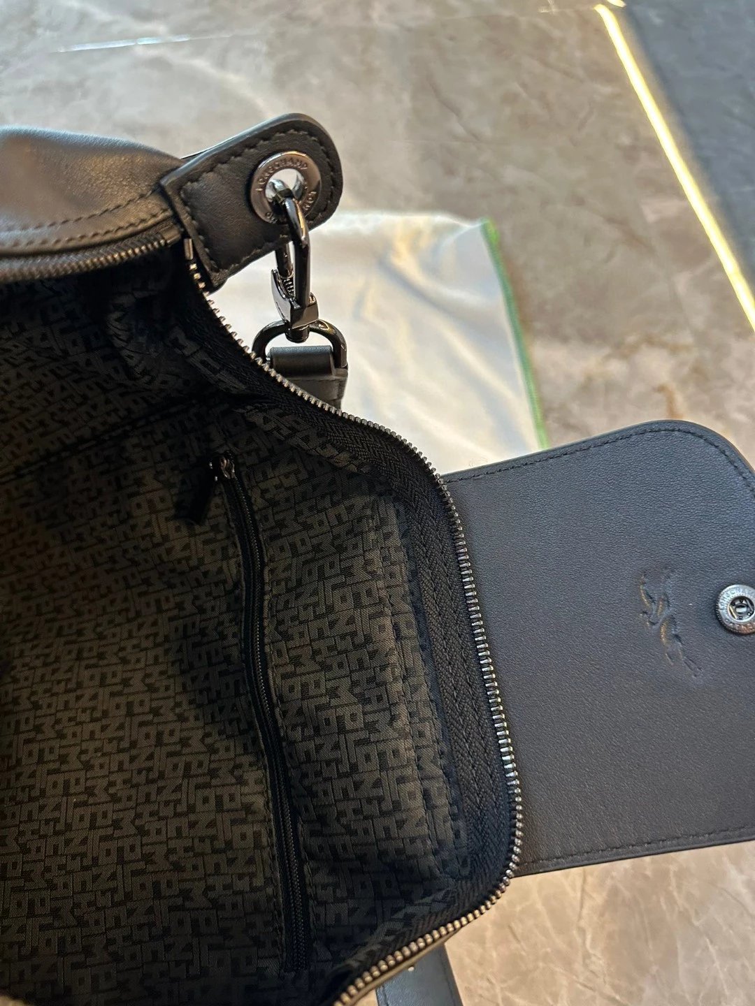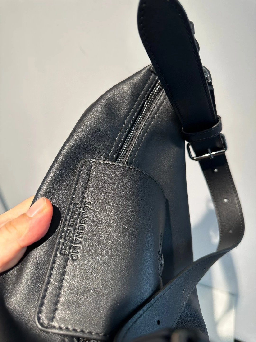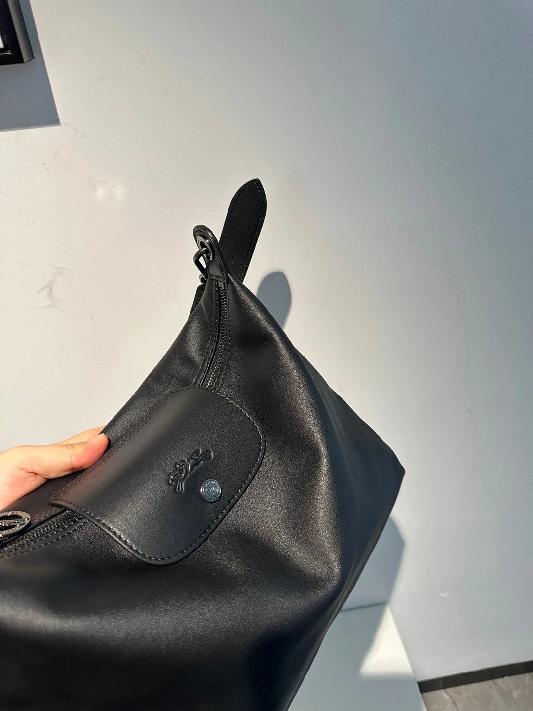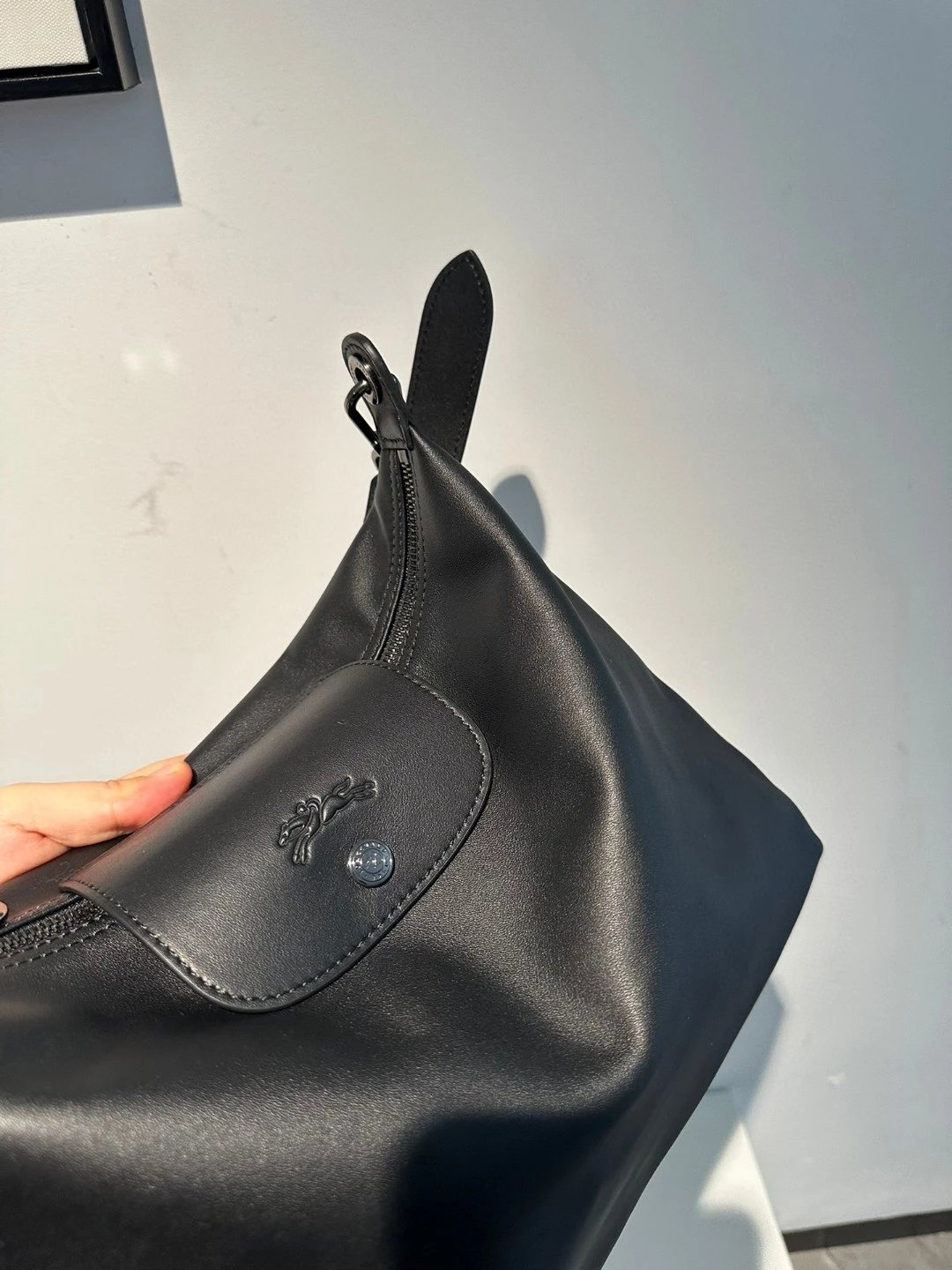 这个还是哑光的黑。但因为皮料好所以很有光泽,喜欢这种真正国外进口的皮料,他们的皮料虽然是亚光,但经得住各种场合。就是别人想摸一下你的包也好。你参加宴会别人灯光下看到你的包的时候。这个都是拿得出手的。不是见光死的那种皮料。他一定会给你自信。