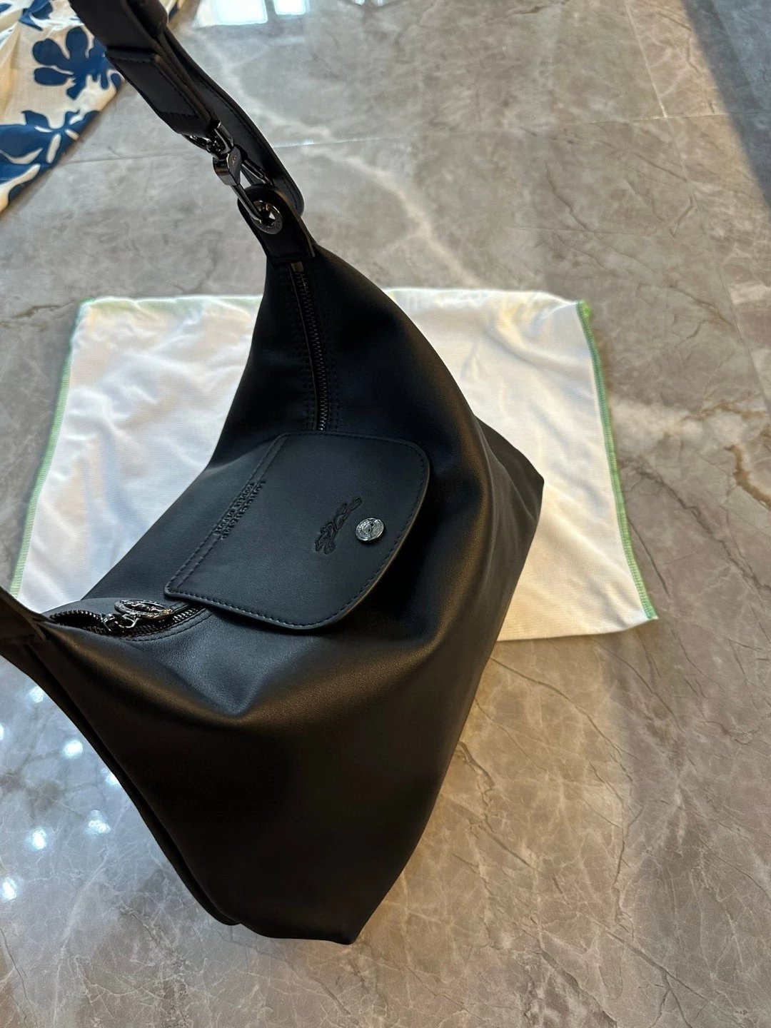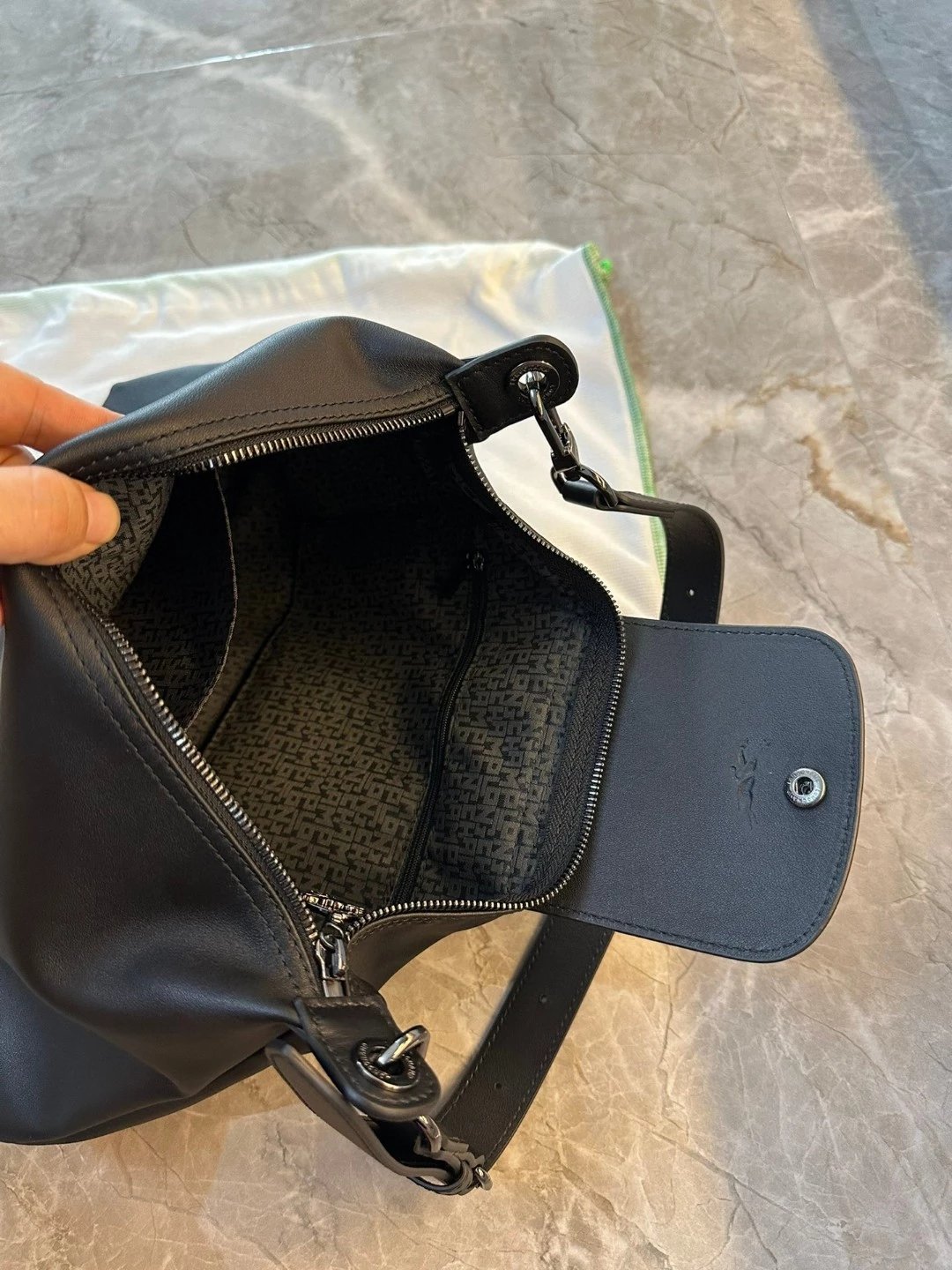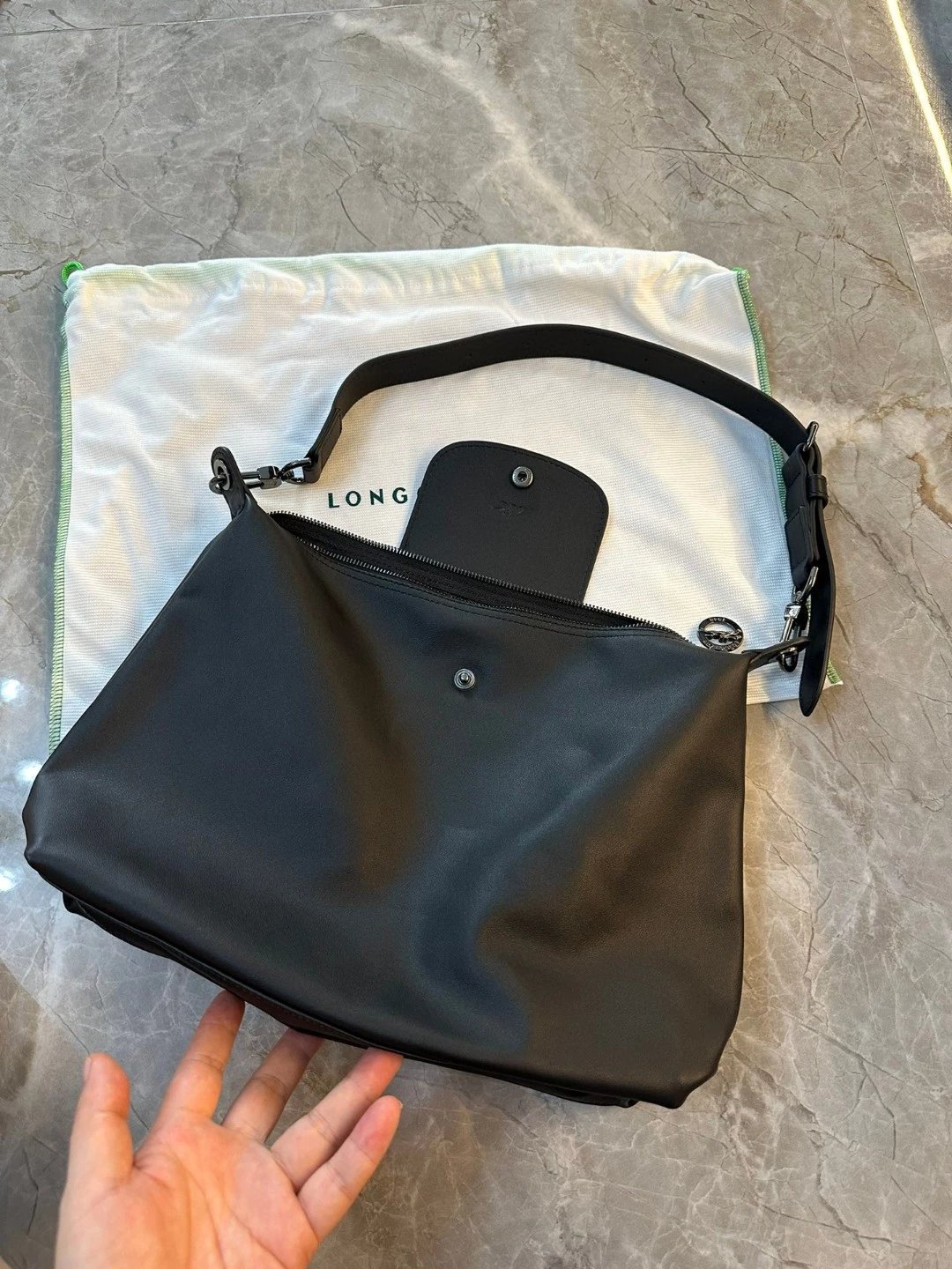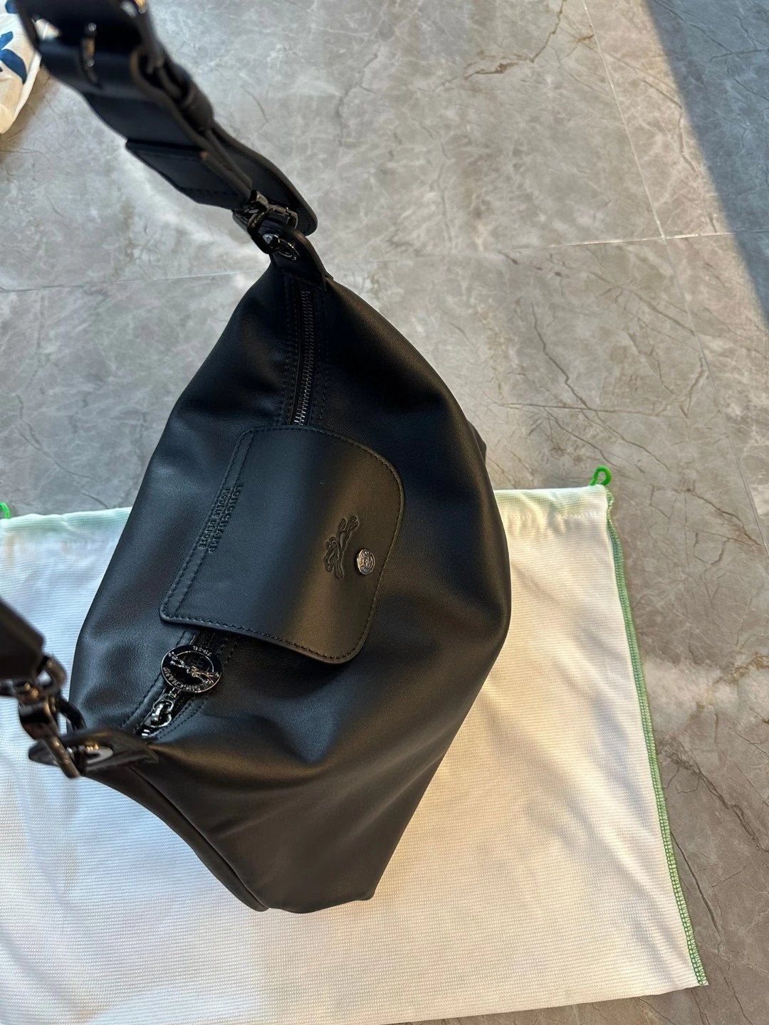 这个还是哑光的黑。但因为皮料好所以很有光泽,喜欢这种真正国外进口的皮料,他们的皮料虽然是亚光,但经得住各种场合。就是别人想摸一下你的包也好。你参加宴会别人灯光下看到你的包的时候。这个都是拿得出手的。不是见光死的那种皮料。他一定会给你自信。