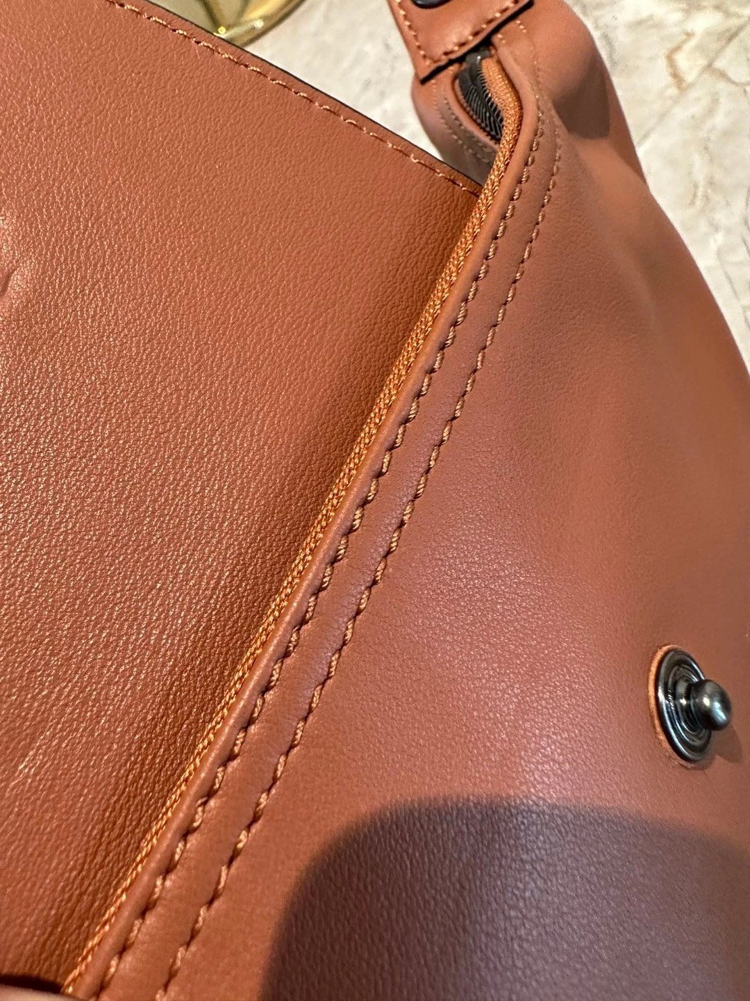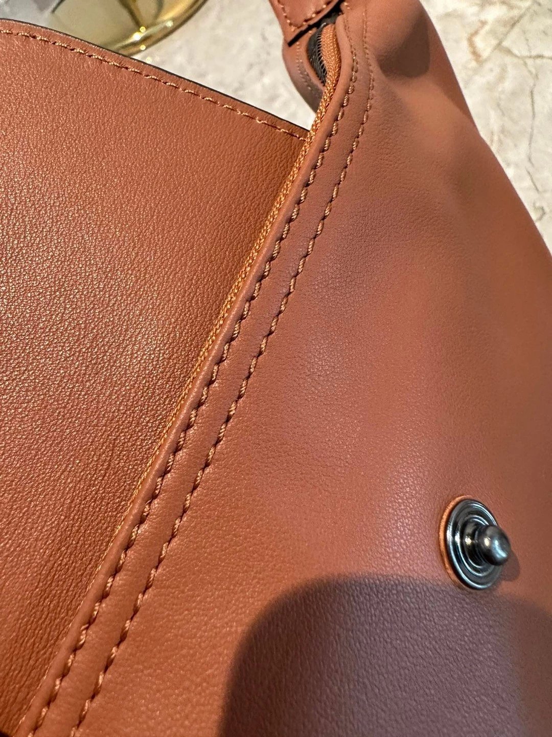 感受下肉感极好。这种皮料是有淡淡的香味。随着时间的推移,用的越久,手摸的越多,它的油感会更好。可能一年后,那个光泽比现在还要润