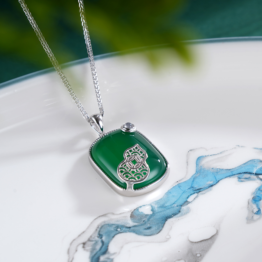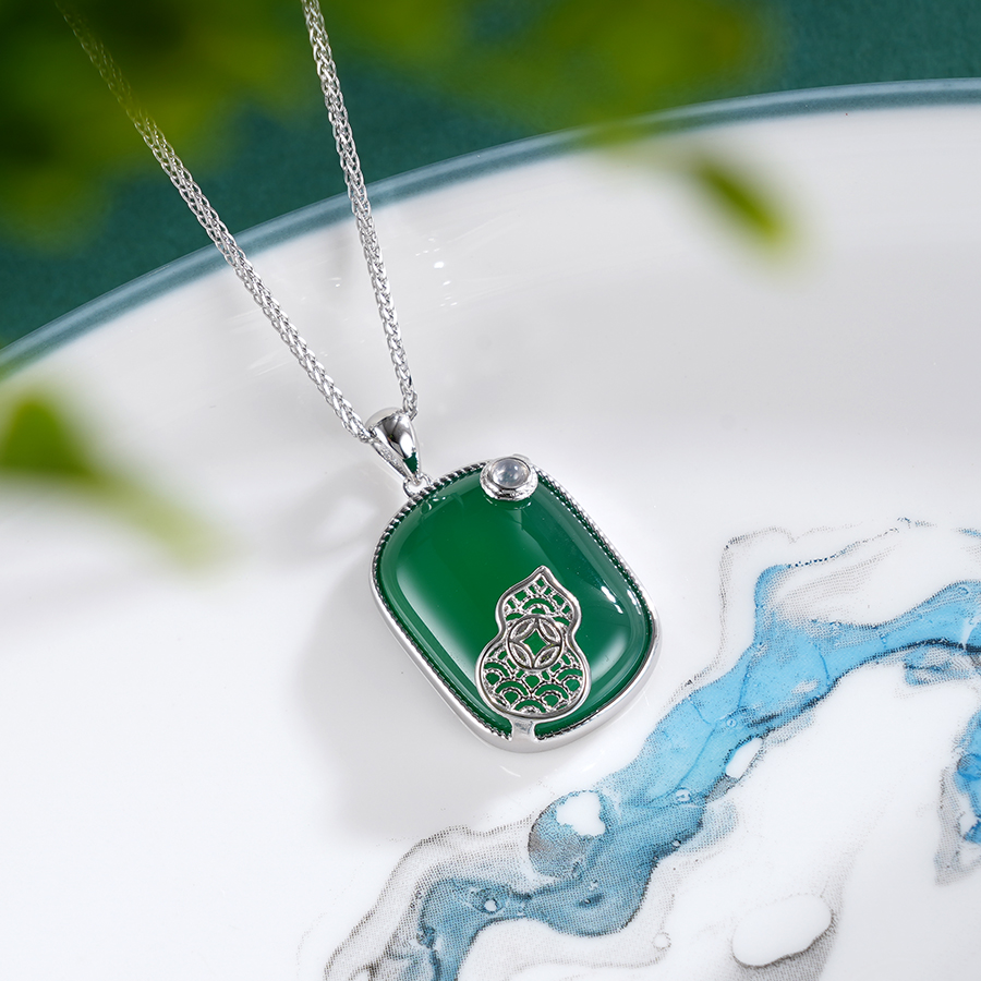 【寓意】:作品葫芦为灵感设计,玉髓玉髓材质与纯银葫芦巧妙搭配,静美温润,复古祥和,寓意吉祥如意,福禄相伴。