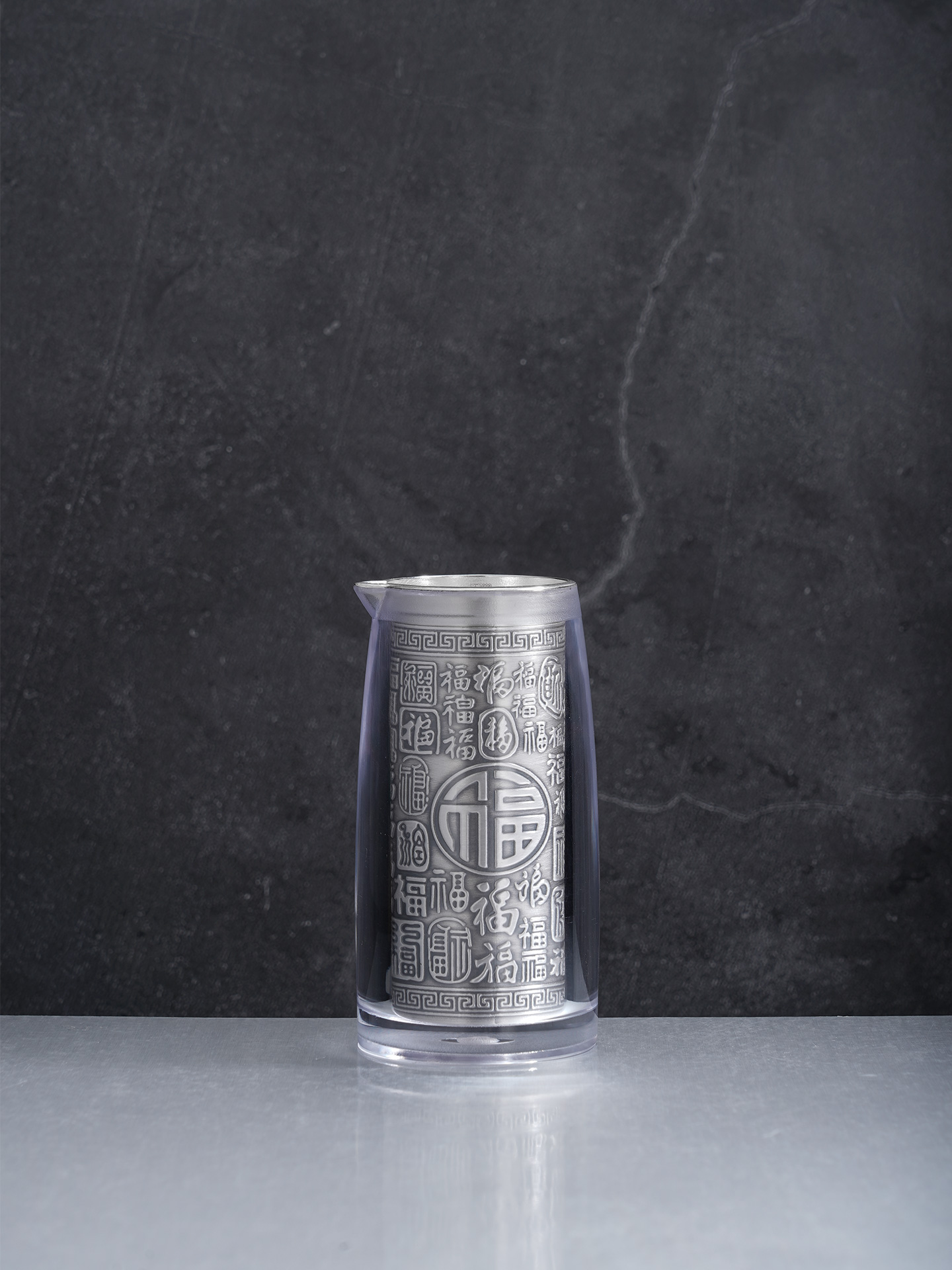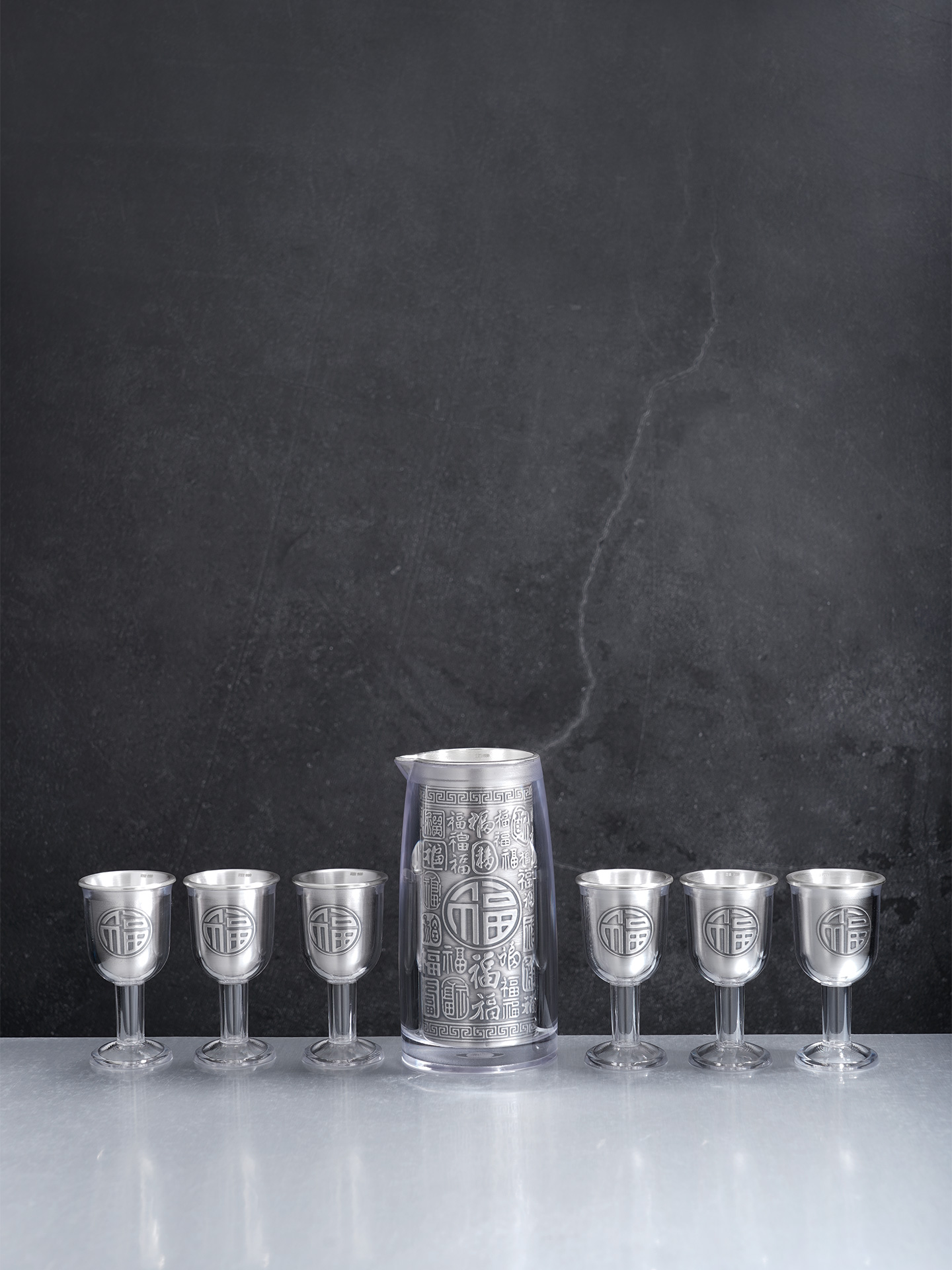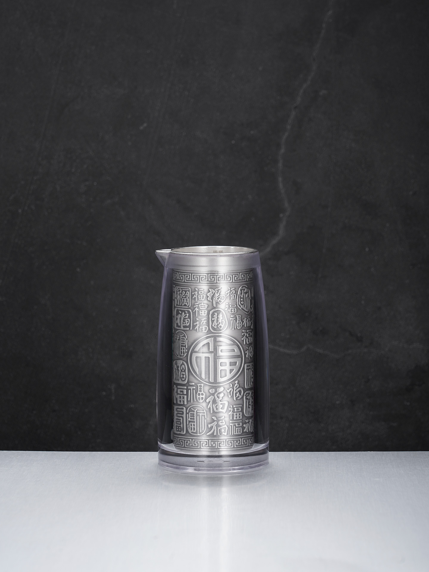 【寓意】:酒具采“百福图”为创意,福字笔走龙蛇,韵味悠长。此款福字酒杯,善纳酒气,巧引酒香,预兆财源广进,福随酒至。