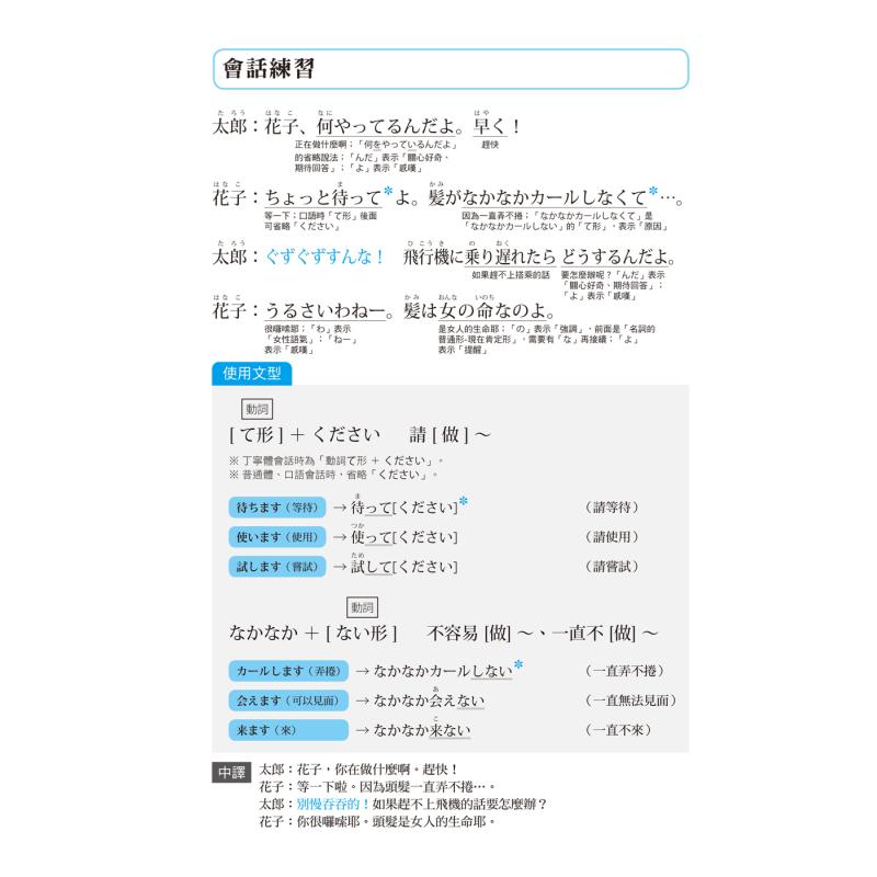 作者凭借优秀的中文能力,能够细微的掌握中日文的使用差异,所以知道如果依赖「中文句义」来使用日文句子,极可能产生误用风险。因此特别采取「情境式的用法解说」,详述这句话「什么时候说?」「可以对谁说?」以及「从中文句义看不出来的用法线索」、「提醒建议」等,不仅更容易熟记这个句子,学习会话也更具临场感!
