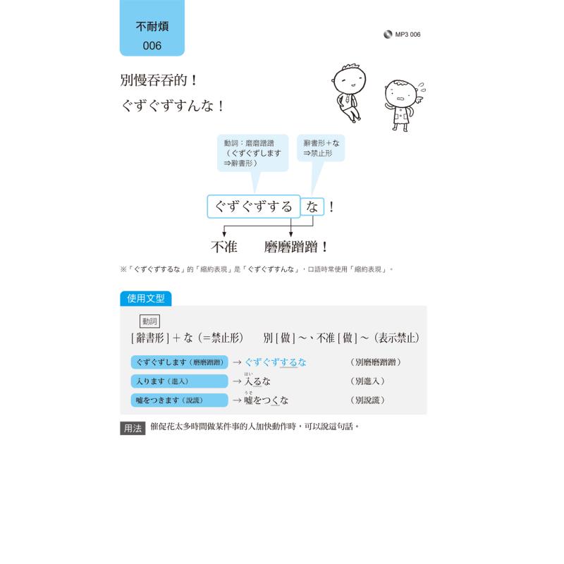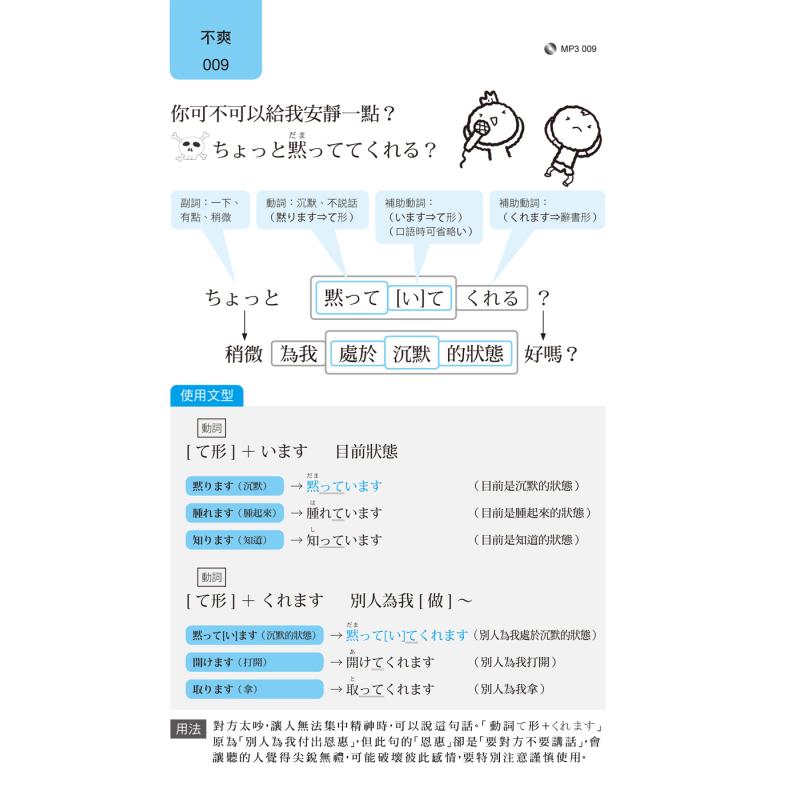 几乎所有教科书都教学「礼貌又得体」的日语。但任何人都有负面情绪,看「日剧、动漫、综艺节目」,表达「抱怨、怒气、咒骂、批评」都是常态。 「骂人的情绪」也要结合「文法规则」,本书就是教你「不压抑情绪」、「不在乎礼貌」、「任性发泄」的坦率日语。但要注意,除了「非常熟悉、完全不需要客气」的朋友,其他人不宜随便使用。