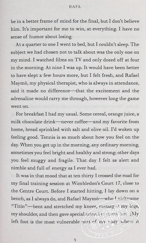 这本书把我们带到了纳达尔童年的核心,他作为一名球员的成长,以及他不可思议的职业生涯。这其中有令人难忘的高潮和低谷,从2008年温布尔登网球公开赛决赛的胜利(这场比赛被约翰·麦肯罗(John McEnroe)称为“网球史上伟大的比赛”),到经常威胁到他在这项运动中的统治地位的伤病问题,再到2010年成为公开赛时年轻的完成职业大满贯的球员。它把我们从纳达尔在马略卡岛的一生的家带到中央球场的更衣室,他详细地描述了参加世界上伟大的比赛的压力。