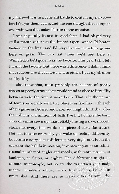 这本书让我们得以一窥球拍背后的秘密,了解到底是什么让这个非常注重隐私的人——他以前从未谈论过自己的家庭生活。它为我们提供了一个私人的、有启发性的故事,每一点都和纳达尔本人一样令人兴奋。