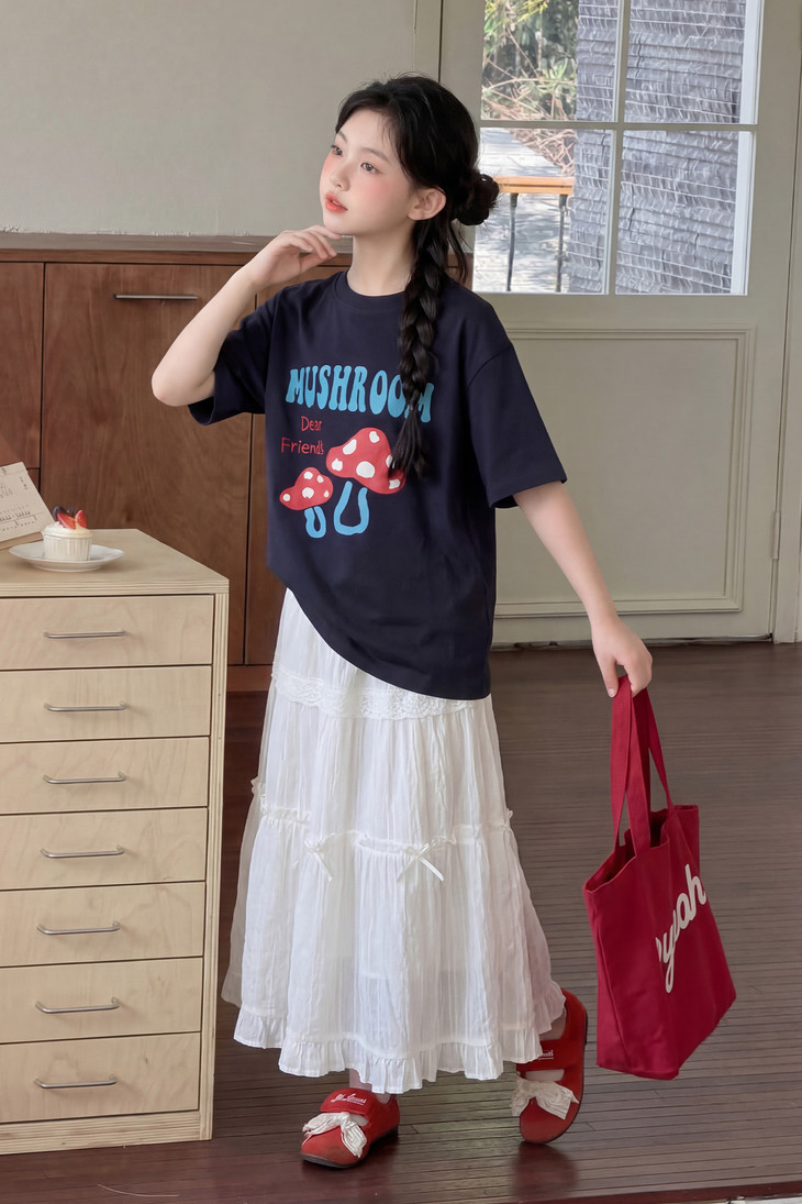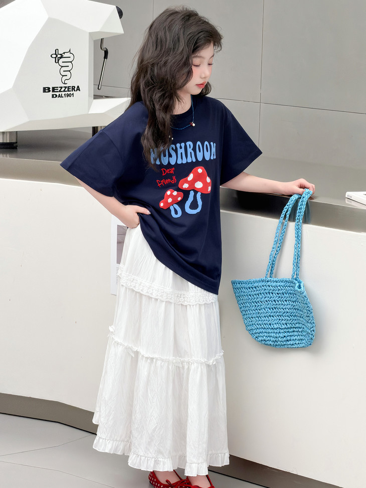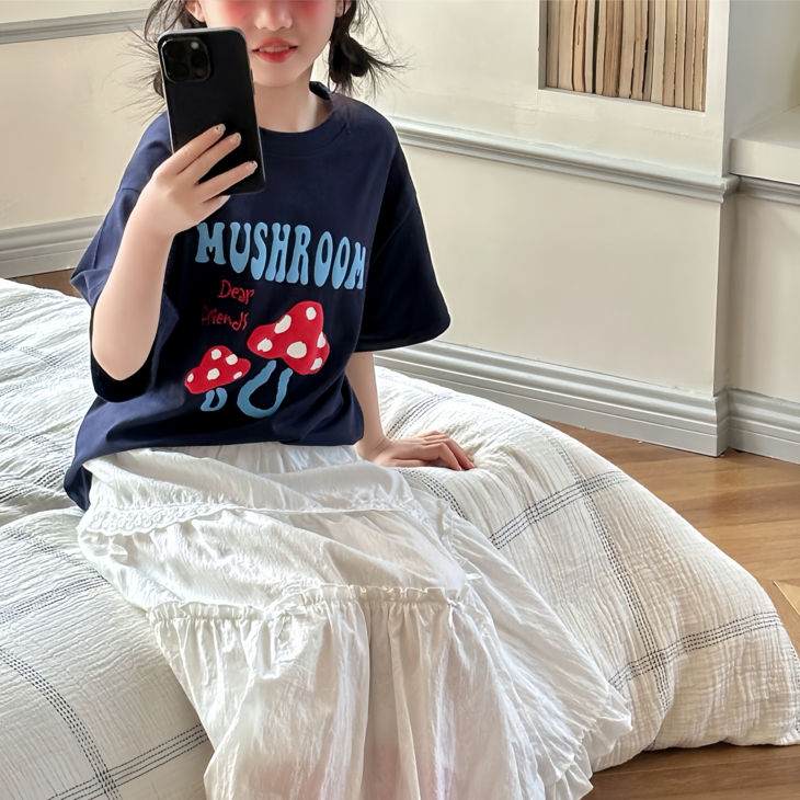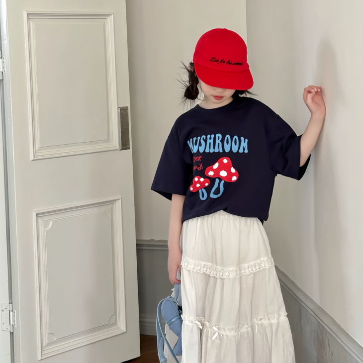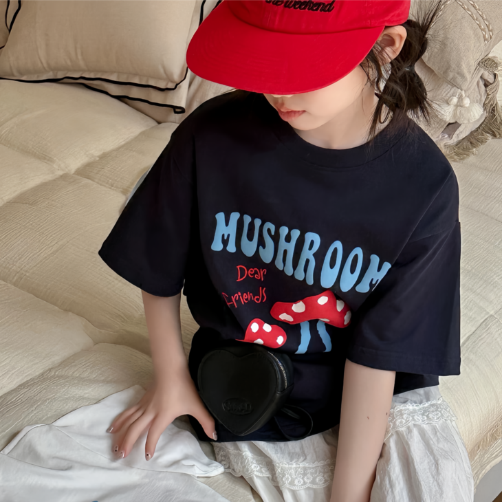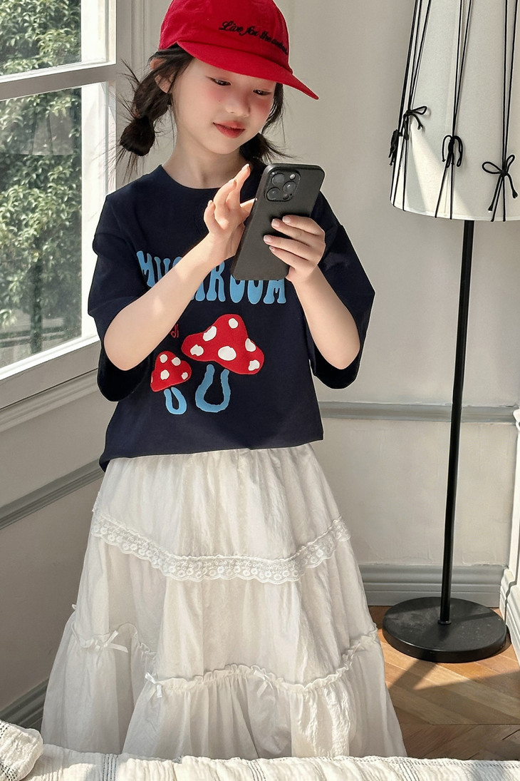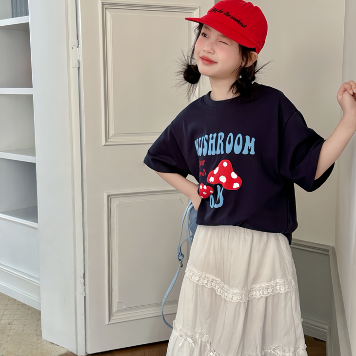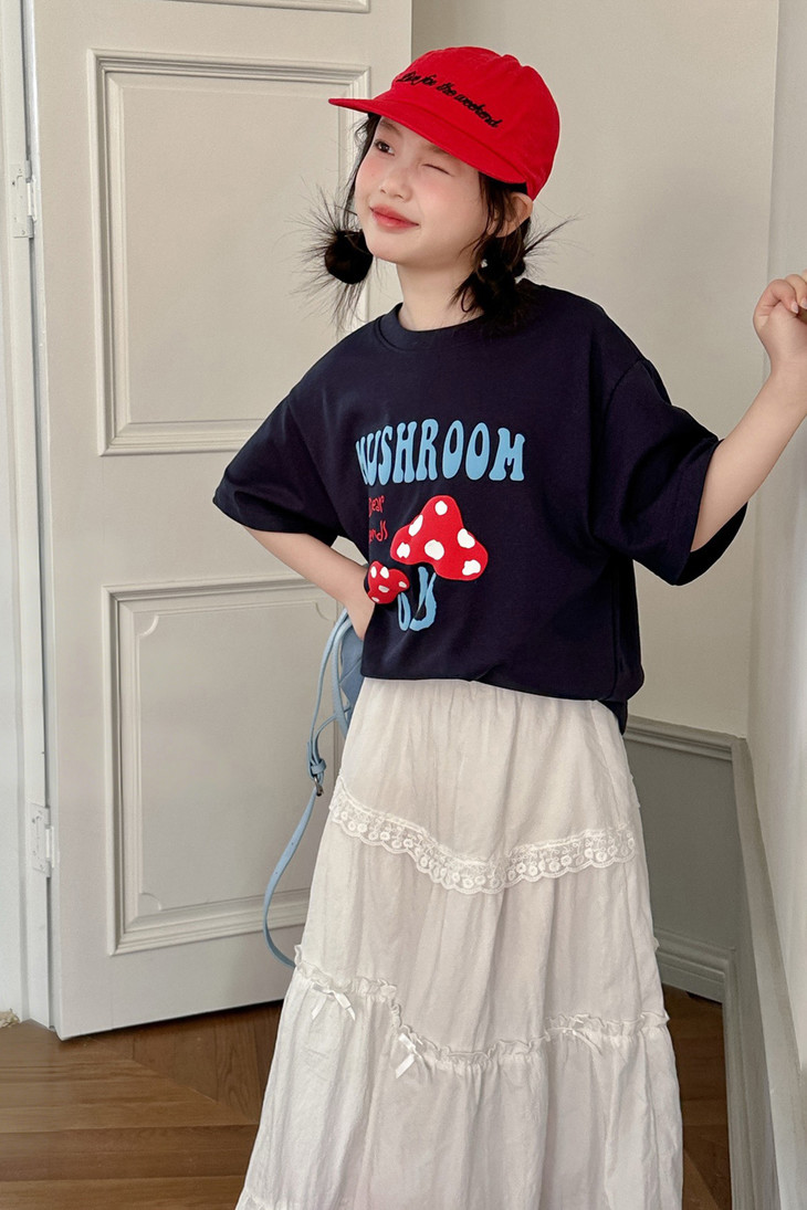 春日氛围感穿搭已就位! 藏青蘑菇T恤+白色蕾丝半裙,温柔又俏皮,让宝贝成为春天里最灵动的小美女~上身自带柔光滤镜,温柔得让人移不开眼~ 最绝的是立体蘑菇印花+蓝字母撞色,色彩饱满不易脱落,童趣感拉满。 ✅撞色活泼英文字母,呼应蘑菇主题,视觉层次更丰富。 ✅宽松落肩版型:不挑身材,包容度高,修饰身形的同时不限制活动,休闲感十足 ✅ 经典圆领:平整服帖走线,不卡脖子、不易变形,穿脱方便,贴合儿童颈部曲线。 韩系休闲风,藏青底色沉稳百搭,搭配白色半裙、牛仔裤都很协调,适配日常上学、周末出游、拍照打卡等多种场景。 - 单穿清爽利落,叠穿马甲、外套也能打造层次感,是女童衣柜里的万能基础款,轻松营造元气少女感。
