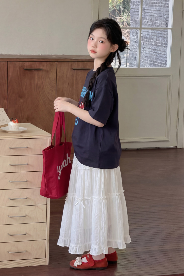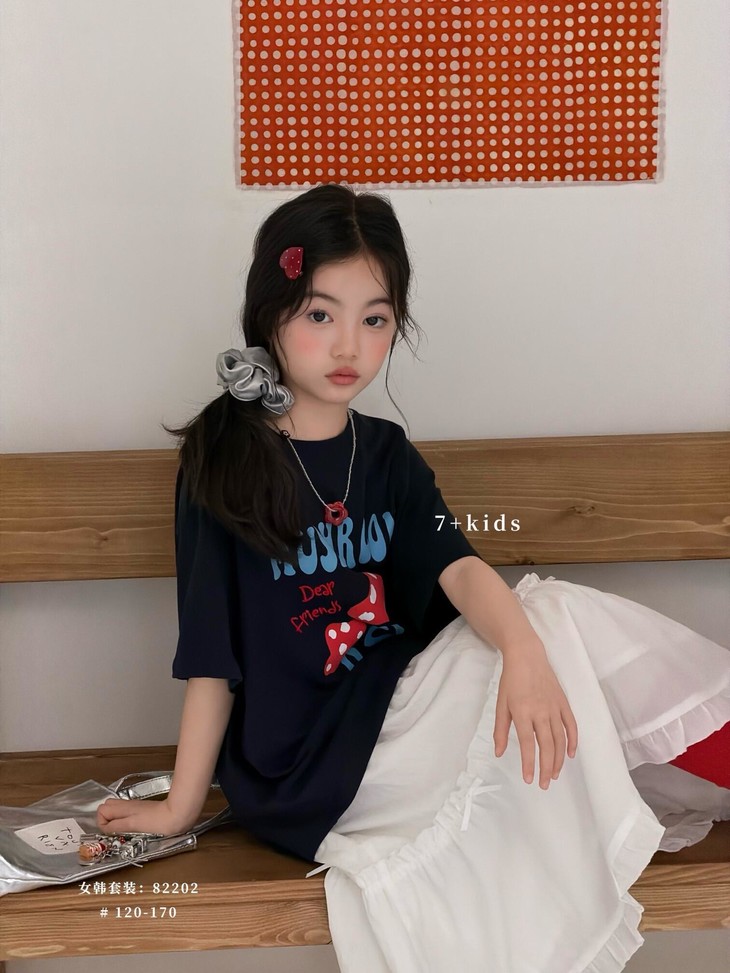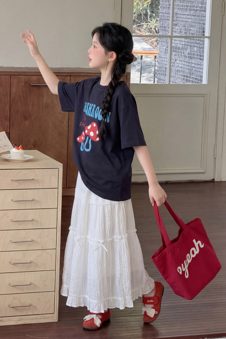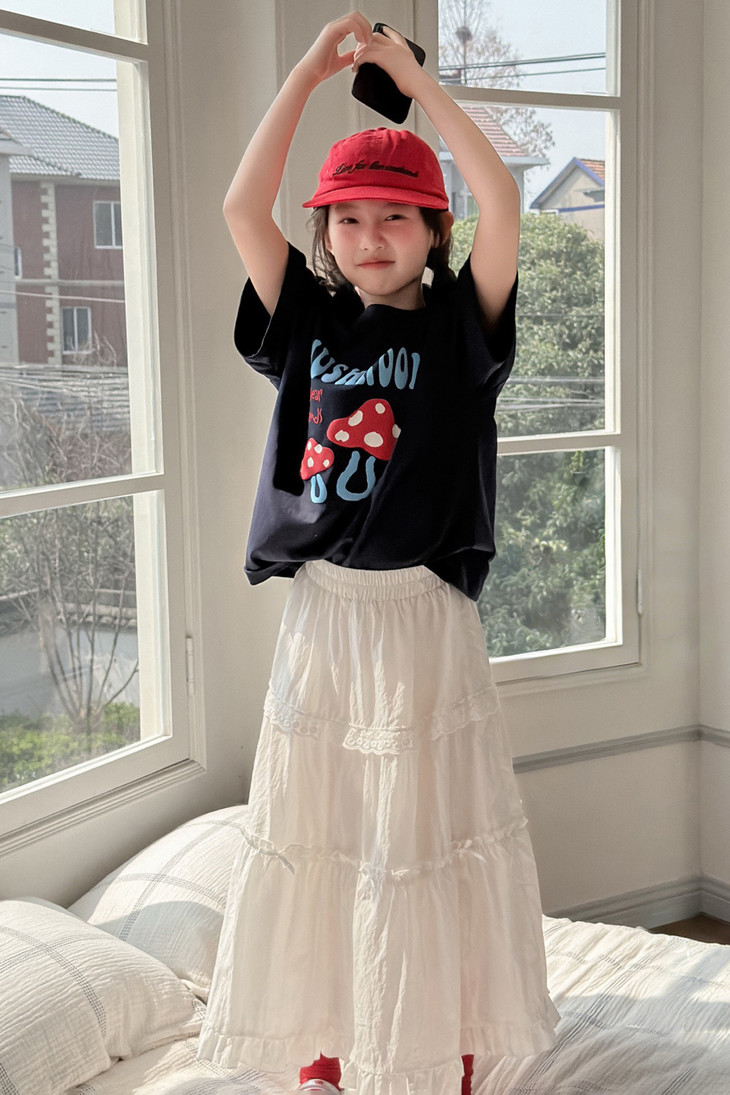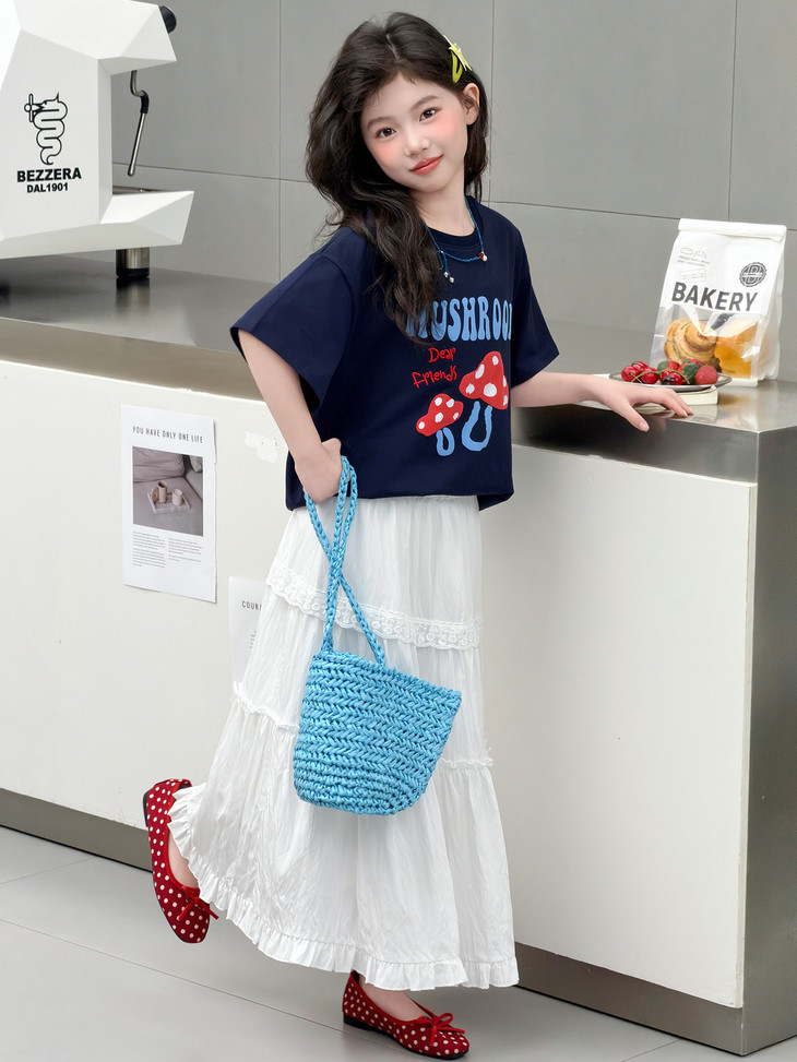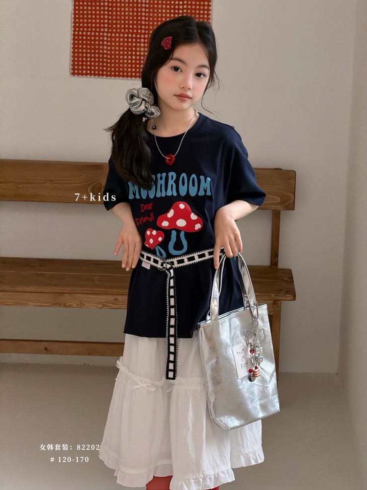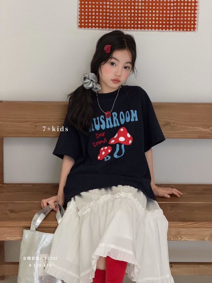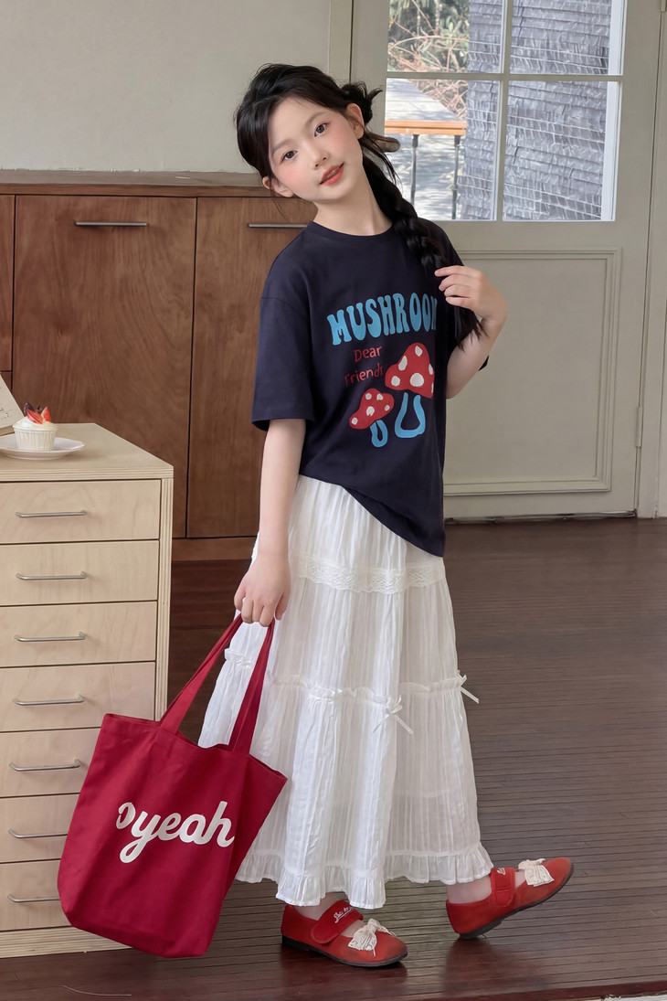 春日氛围感穿搭已就位! 藏青蘑菇T恤+白色蕾丝半裙,温柔又俏皮,让宝贝成为春天里最灵动的小美女~上身自带柔光滤镜,温柔得让人移不开眼~ 最绝的是立体蘑菇印花+蓝字母撞色,色彩饱满不易脱落,童趣感拉满。 ✅撞色活泼英文字母,呼应蘑菇主题,视觉层次更丰富。 ✅宽松落肩版型:不挑身材,包容度高,修饰身形的同时不限制活动,休闲感十足 ✅ 经典圆领:平整服帖走线,不卡脖子、不易变形,穿脱方便,贴合儿童颈部曲线。 韩系休闲风,藏青底色沉稳百搭,搭配白色半裙、牛仔裤都很协调,适配日常上学、周末出游、拍照打卡等多种场景。 - 单穿清爽利落,叠穿马甲、外套也能打造层次感,是女童衣柜里的万能基础款,轻松营造元气少女感。