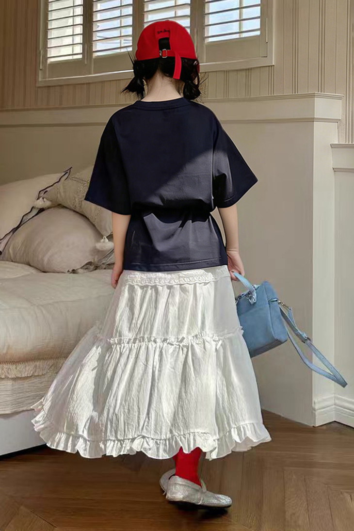 🎀 白色蕾丝蛋糕半裙 - 采用轻薄肌理感面料,自带自然褶皱纹理,垂坠感好,轻盈飘逸不贴腿,垂坠感好,春夏穿着透气不闷热。 - 多层蛋糕裙版型, 小蝴蝶结装饰,层层叠叠的褶皱设计,视觉上更显灵动俏皮,裙长适中,行走间自带飘逸感。 - 松紧腰头设计,弹力适中,不勒肚子,穿脱方便,适配不同腰围的宝宝,穿着更自在。 -下摆荷叶边剪裁,行走间随风飘动,温柔又灵动。
