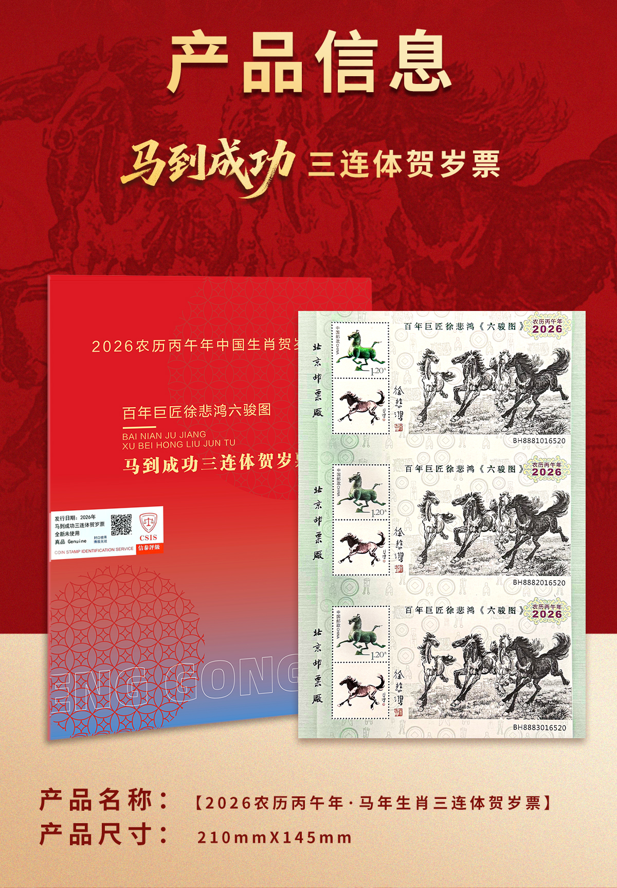 2026《马到成功》三连体贺岁票 ,雕刻凹版 浮雕工艺,中国邮政审批 北京邮票厂出品(预售10天发货)