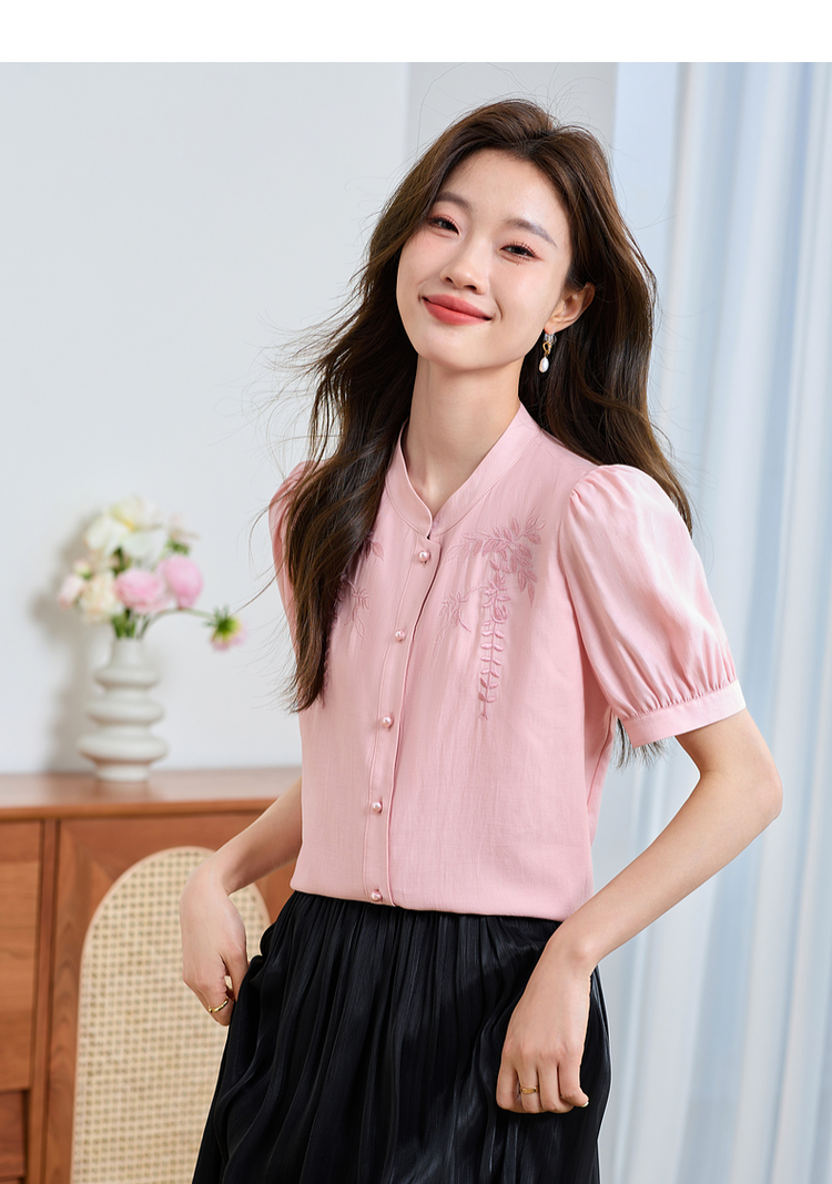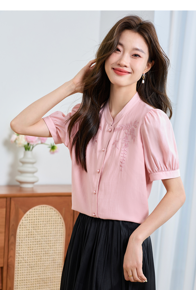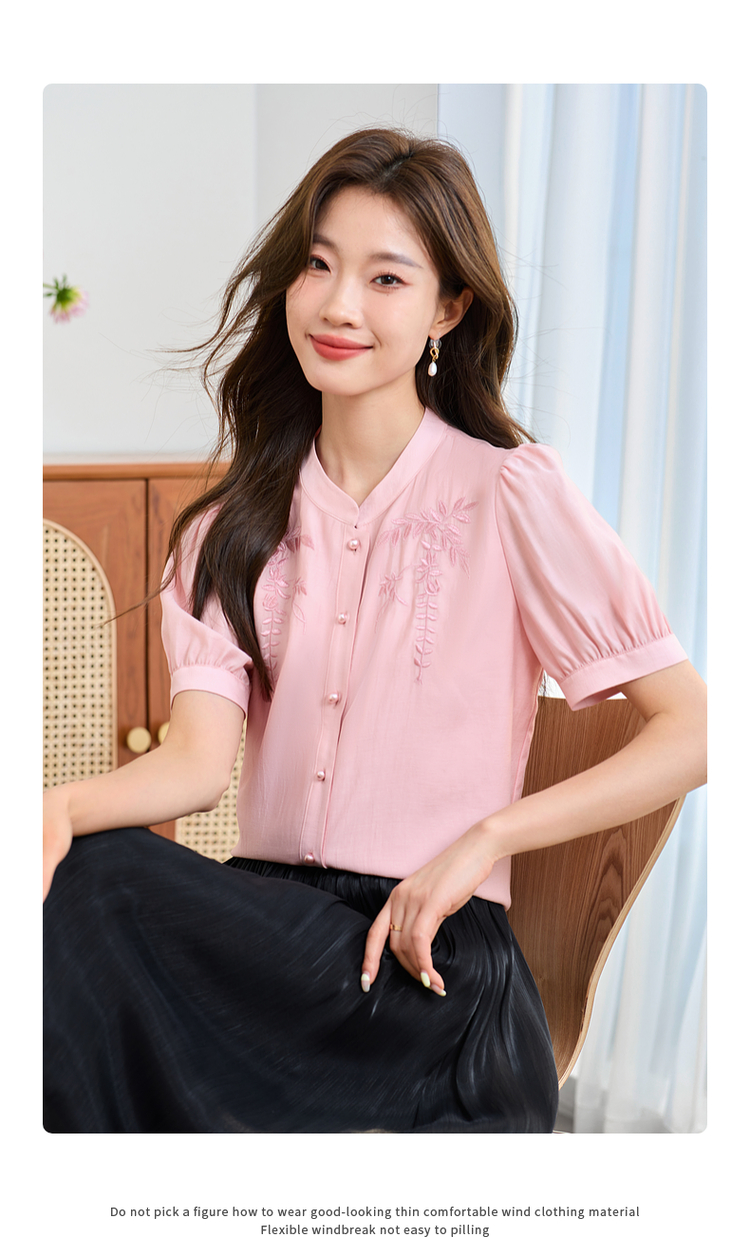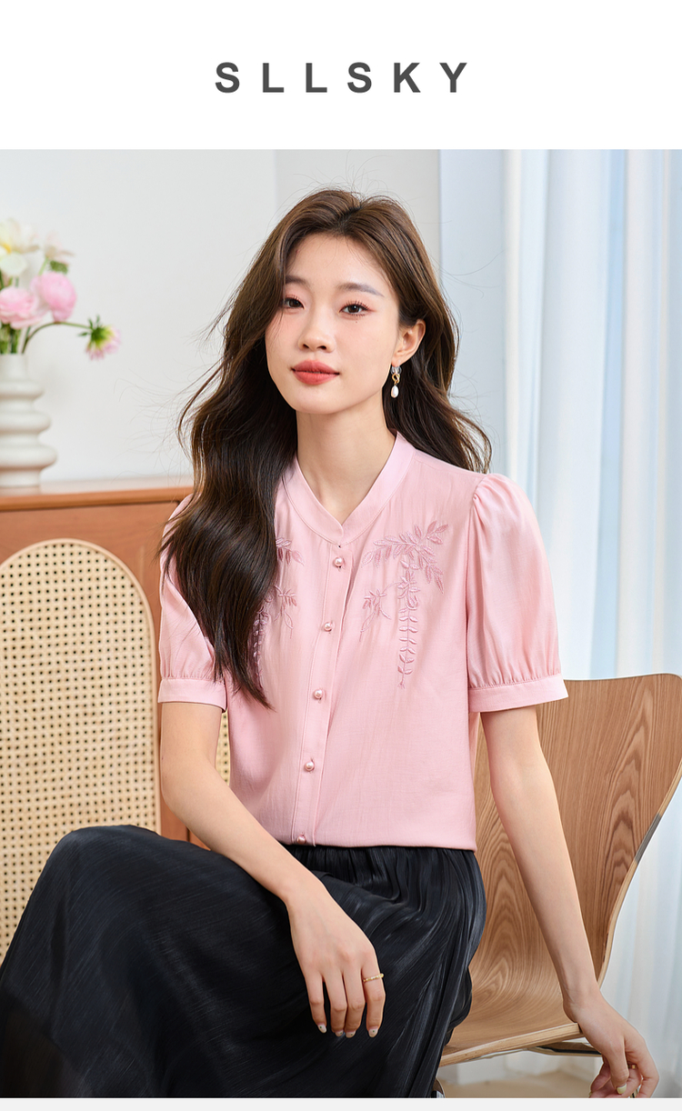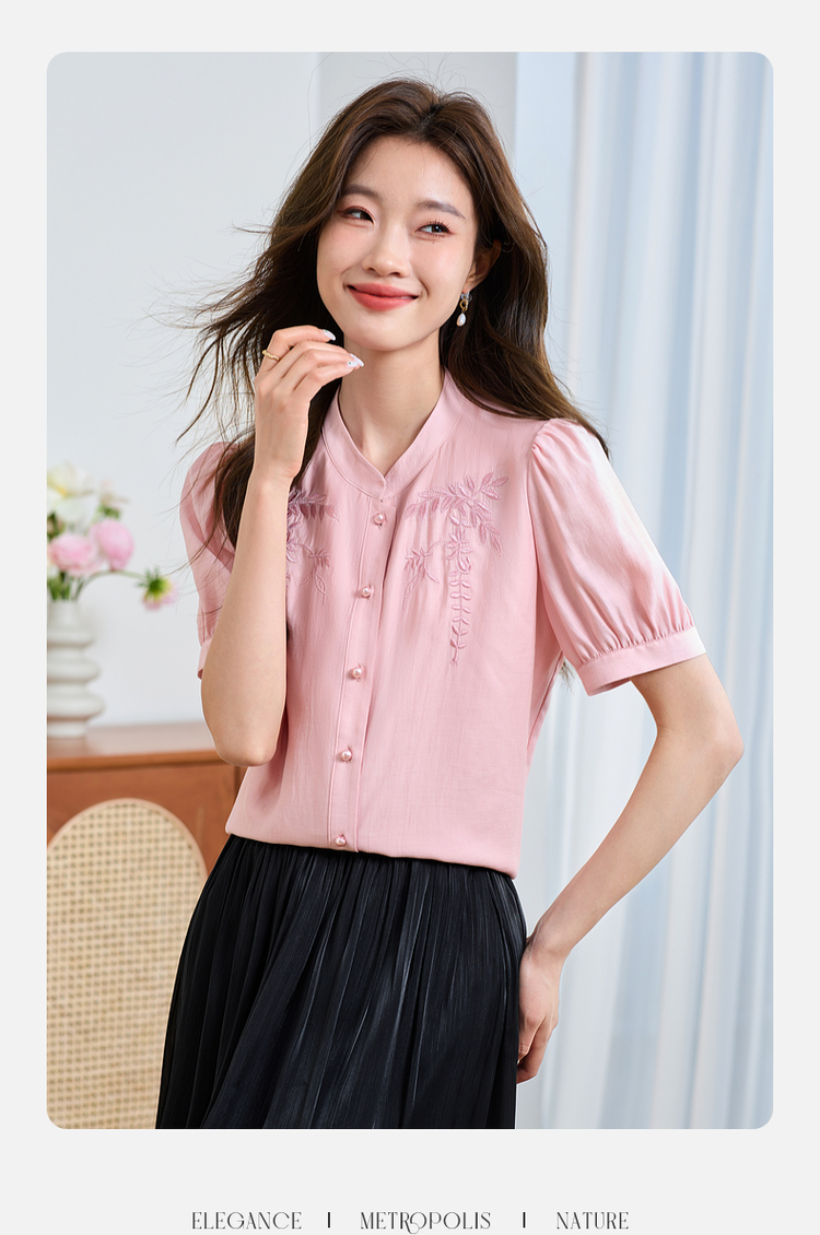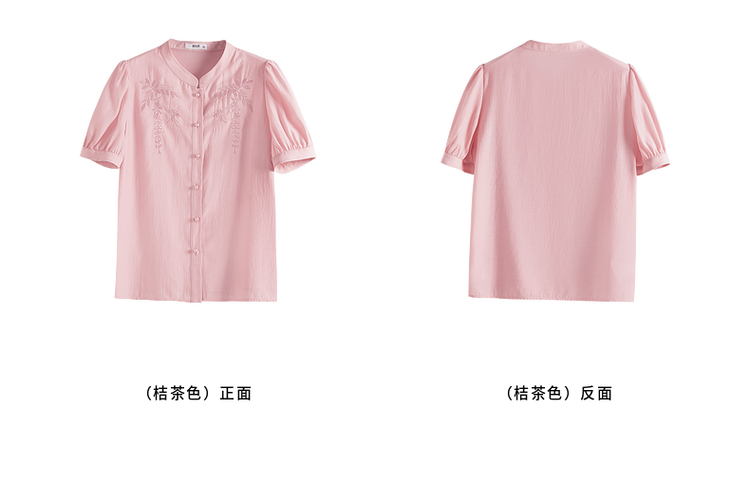 【专属特价】熙世界轻国风刺绣醋酸衬衫2025夏装新款高级感泡泡袖粉色衬衣