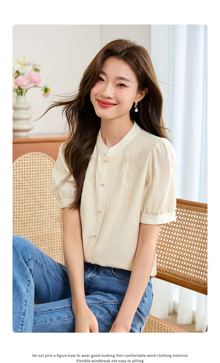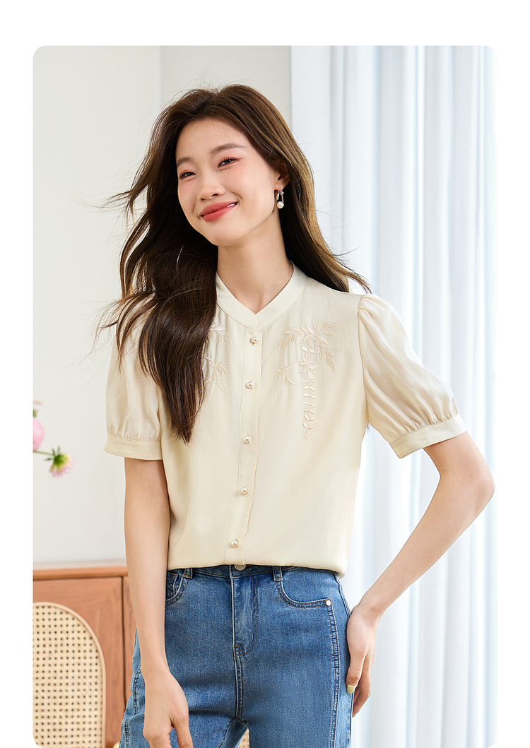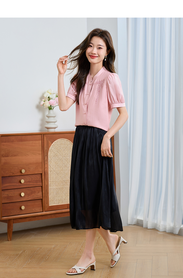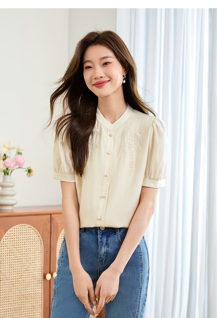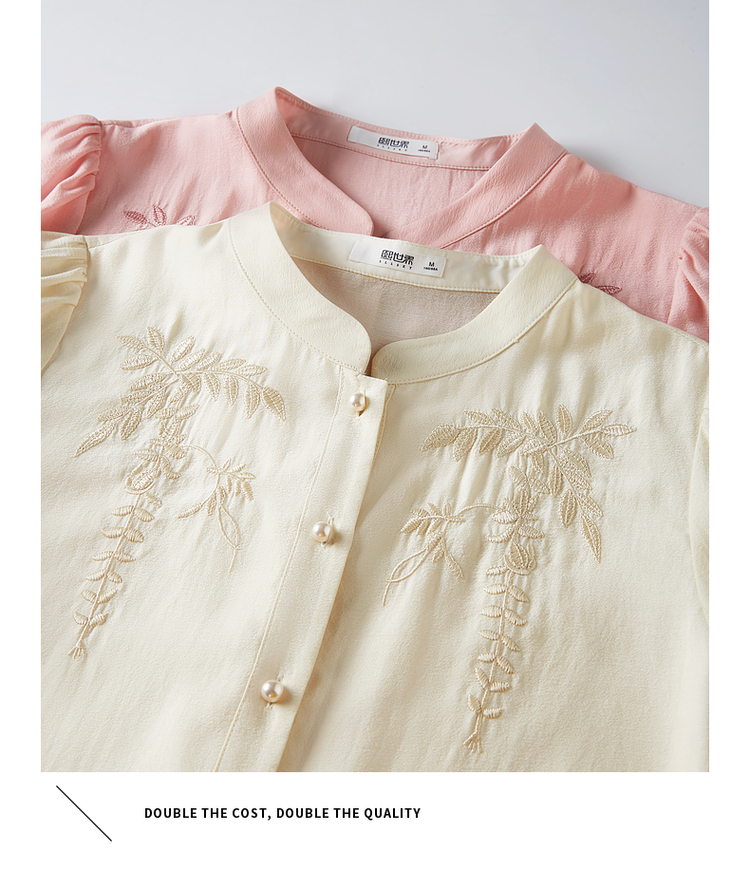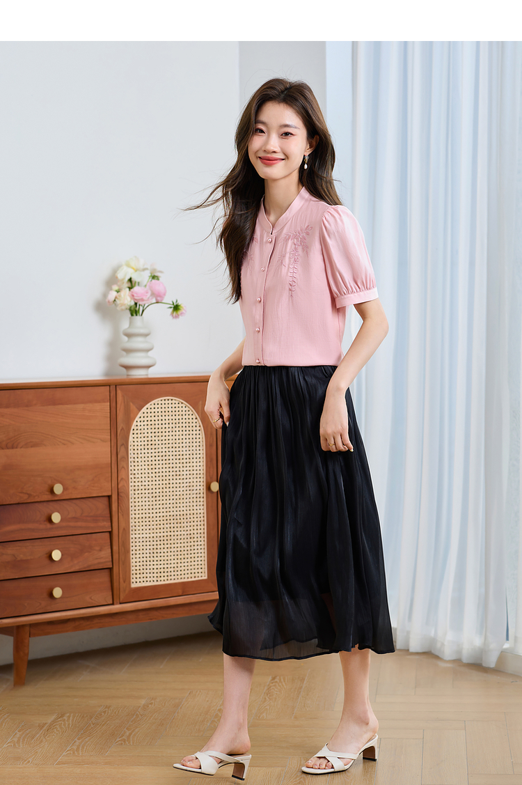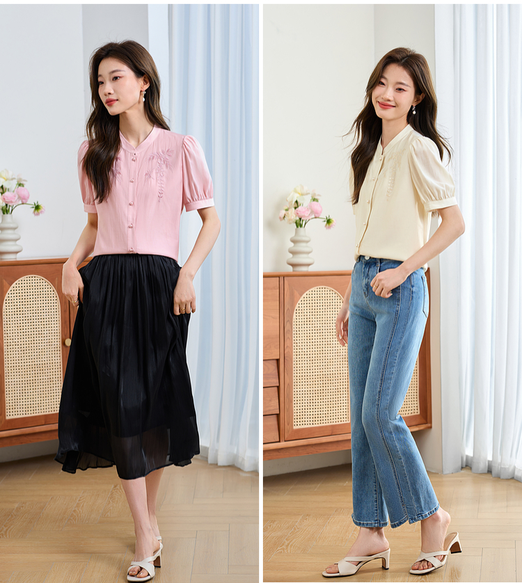【专属特价】熙世界轻国风刺绣醋酸衬衫2025夏装新款高级感泡泡袖粉色衬衣