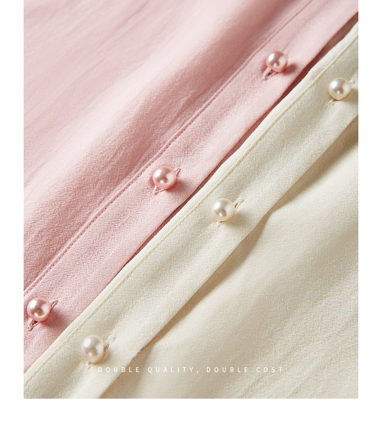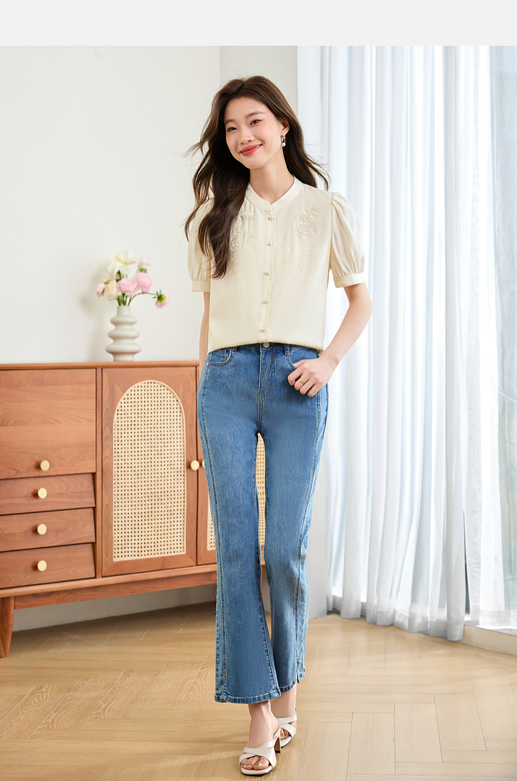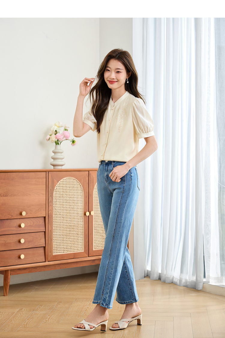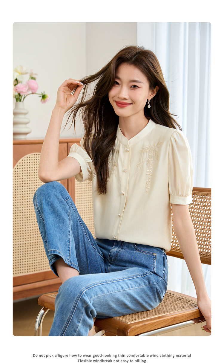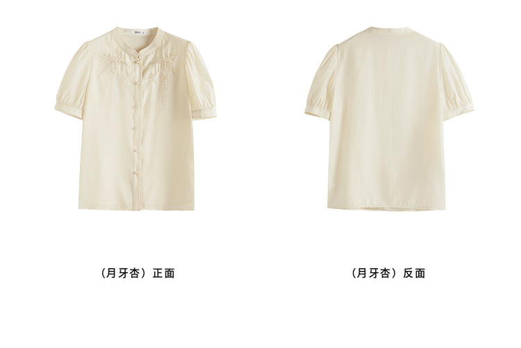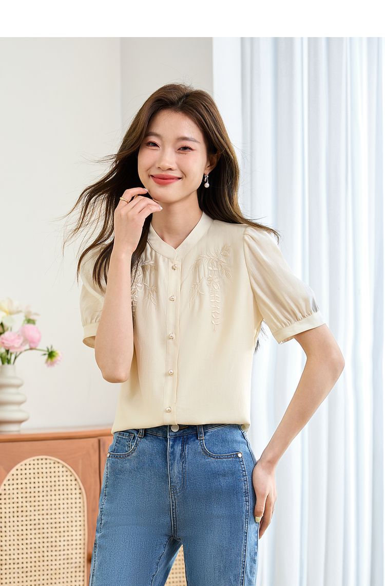 【专属特价】熙世界轻国风刺绣醋酸衬衫2025夏装新款高级感泡泡袖粉色衬衣