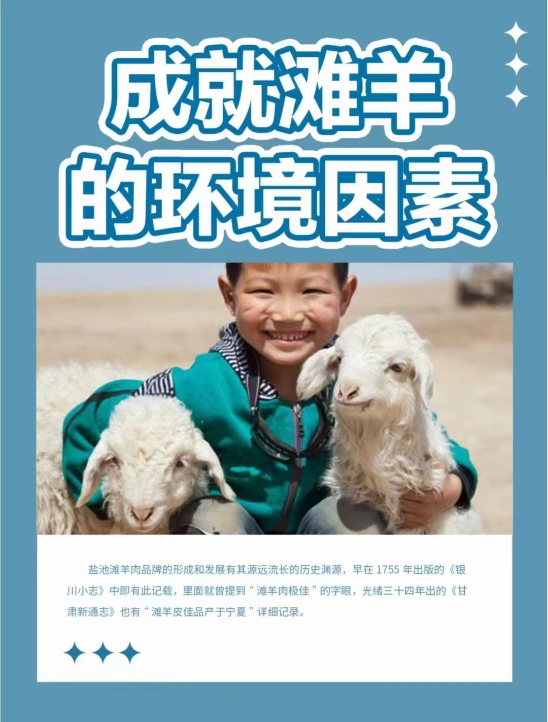 首先给大家普及一下什么是盐池滩羊? 滩羊,很早的时候,当地人喜欢把羊赶到野外、荒滩上放牧,这种在荒滩上被自由放牧的羊就叫做滩羊,一直流传到现在。滩羊属于绵羊品种,系蒙古羊的一个分支,适合于干旱、荒漠化草原放牧饲养。 滩羊的主要原产地就是宁夏盐池县,盐池县是宁夏回族自治区东部的一个县城,享有“中国滩羊之乡”的美誉,所以综合起来就叫做盐池滩羊。