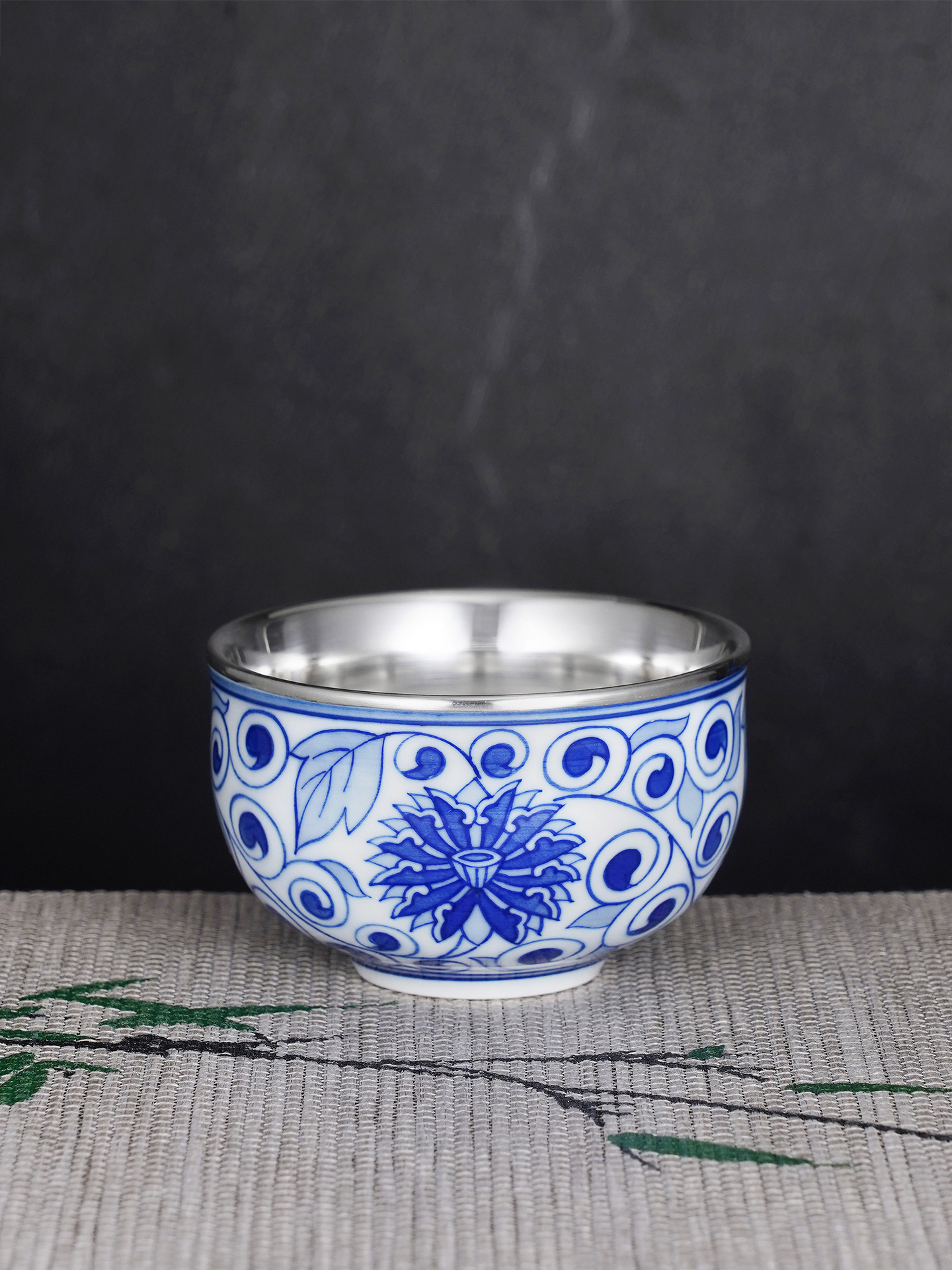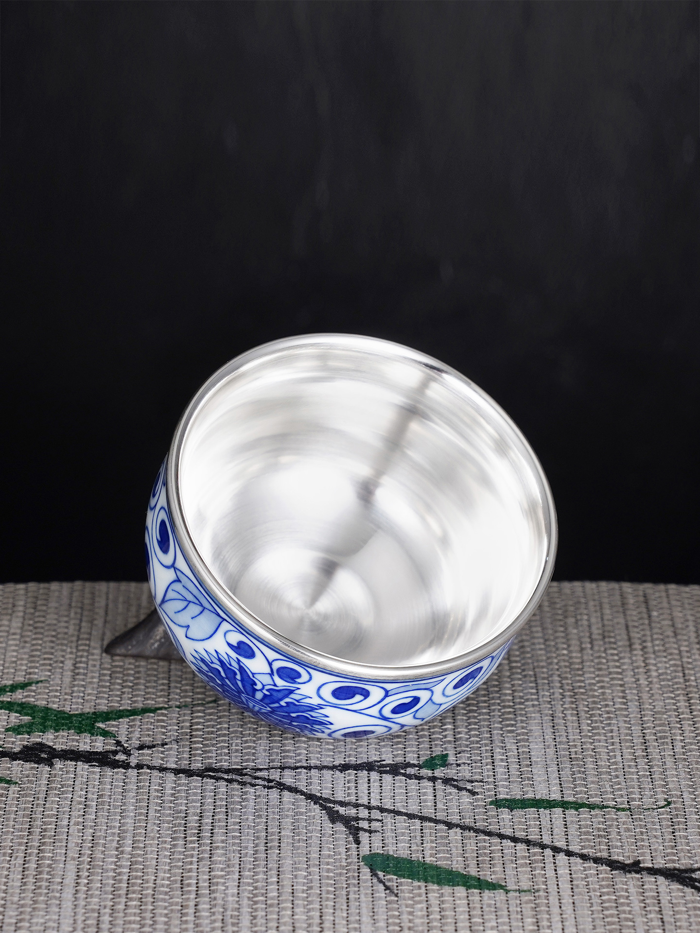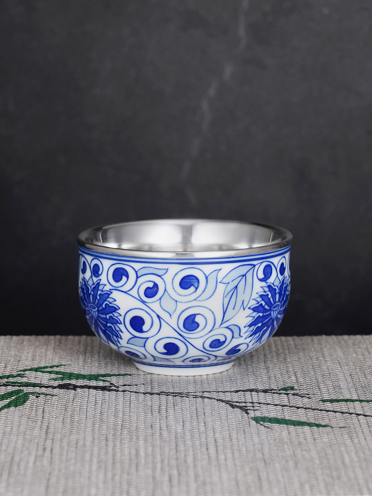 子佩集S990【清欢漫卷】摆件【QF004】纯银茶具青花藤蔓茶杯纯银内胆景德镇手绘2508