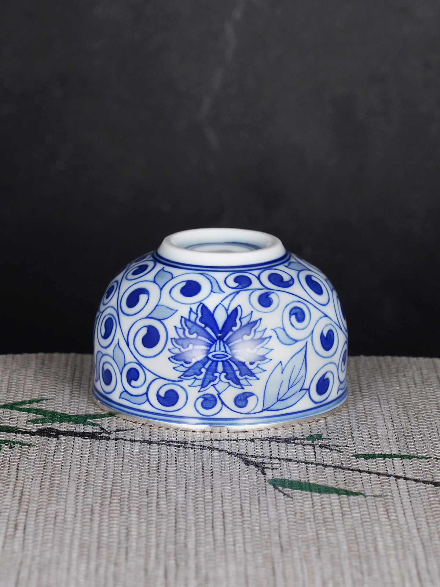 杯壁叶子卷曲成环,与青花釉色形成了巧妙联动,清辉流转,寓意美好生生不息。