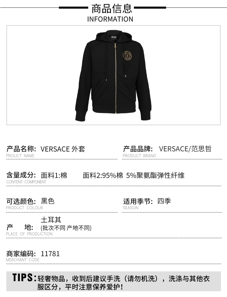 【新品底价】Versace 范思哲 男士拉链刺绣弹棉卫衣连帽卫衣外套 11781