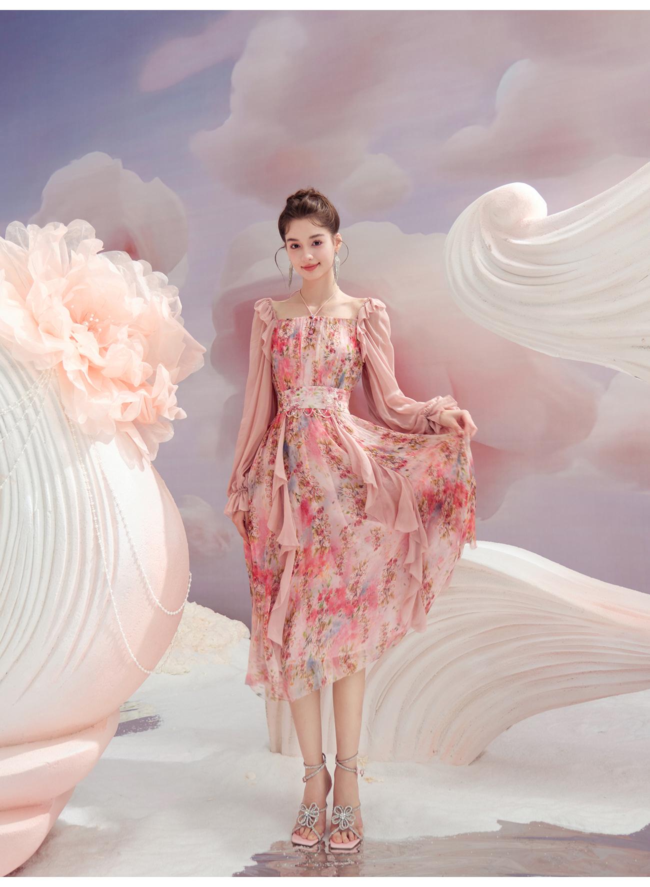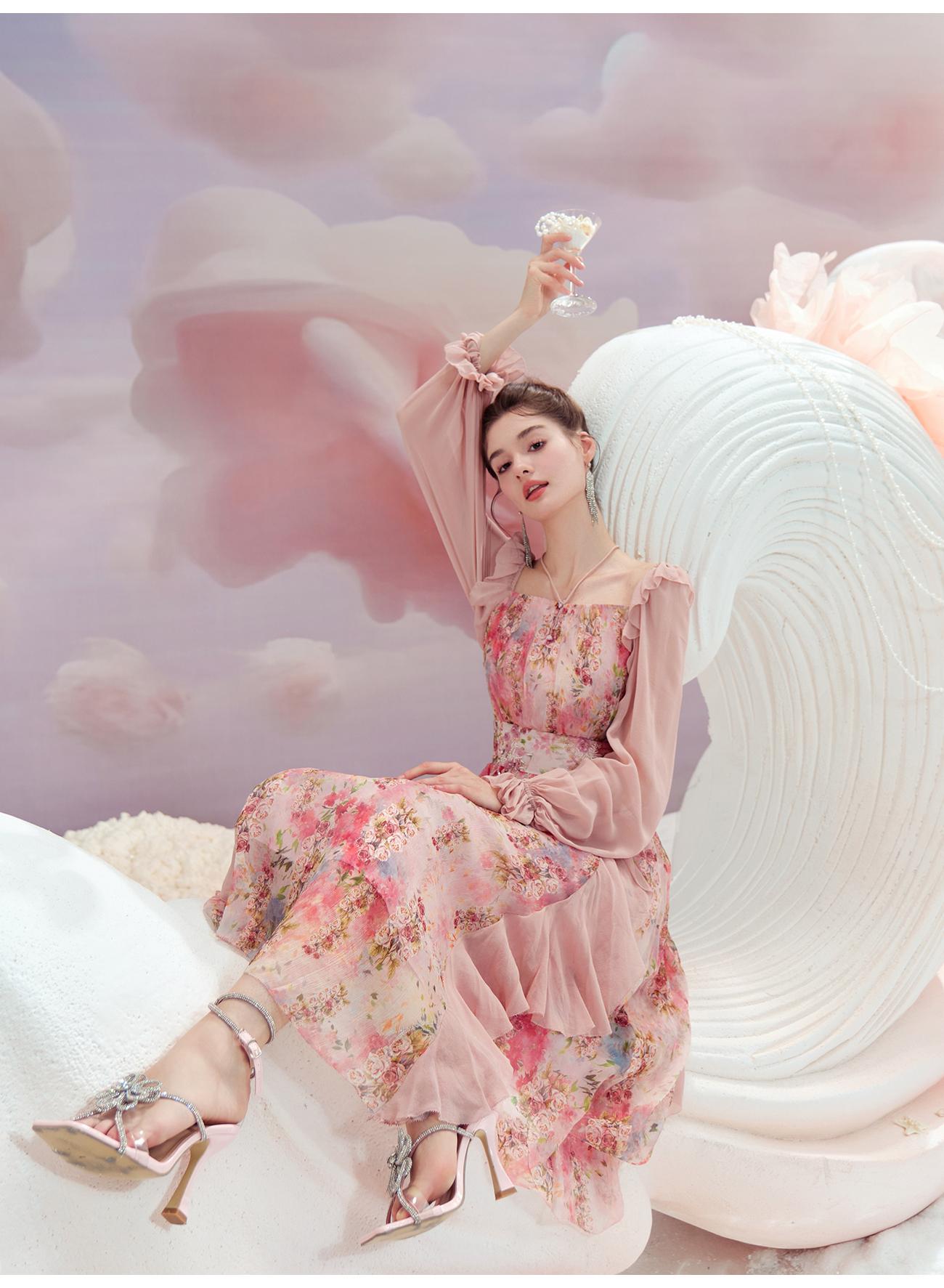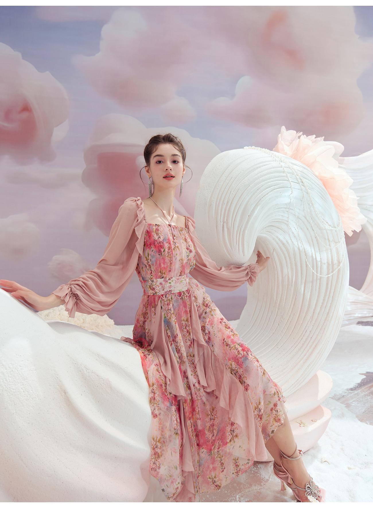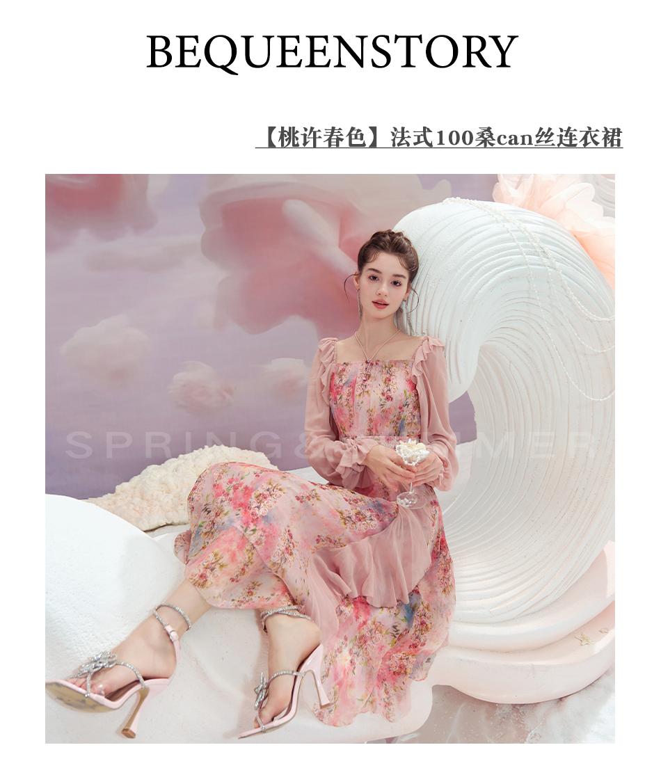 余潇潇【桃许春色】时髦轻奢法式长款100桑蚕丝连衣裙