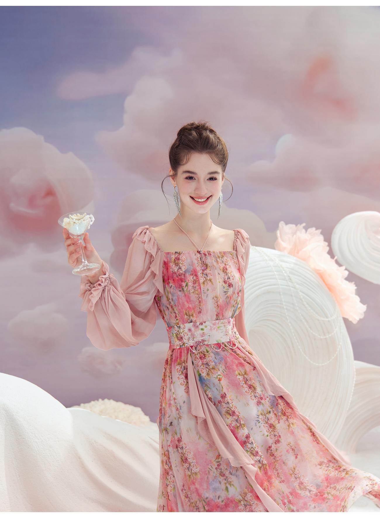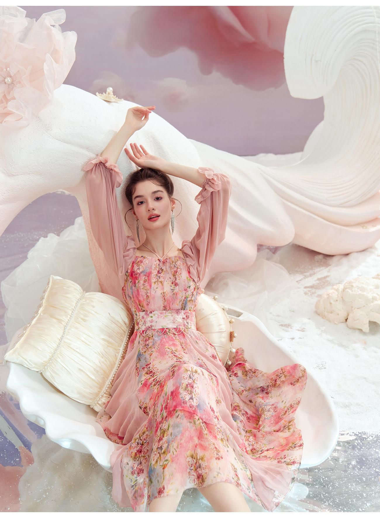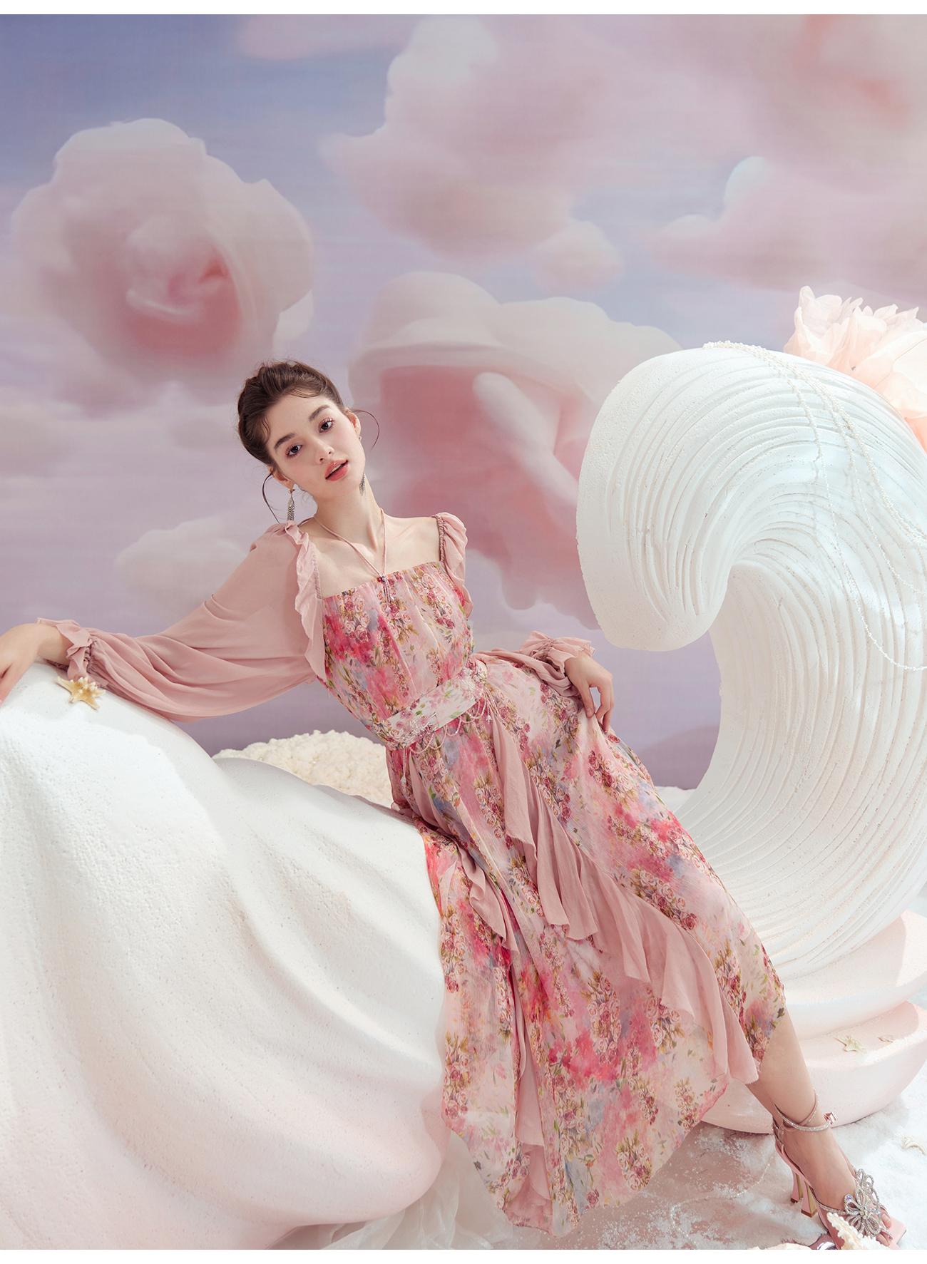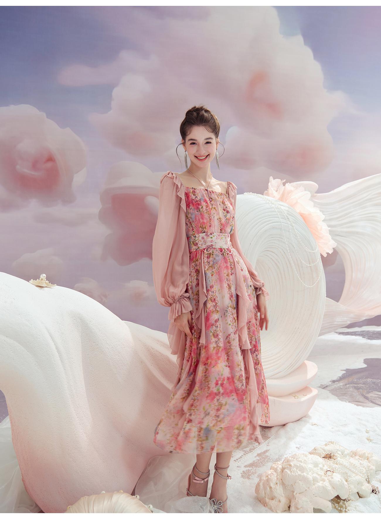 余潇潇【桃许春色】时髦轻奢法式长款100桑蚕丝连衣裙