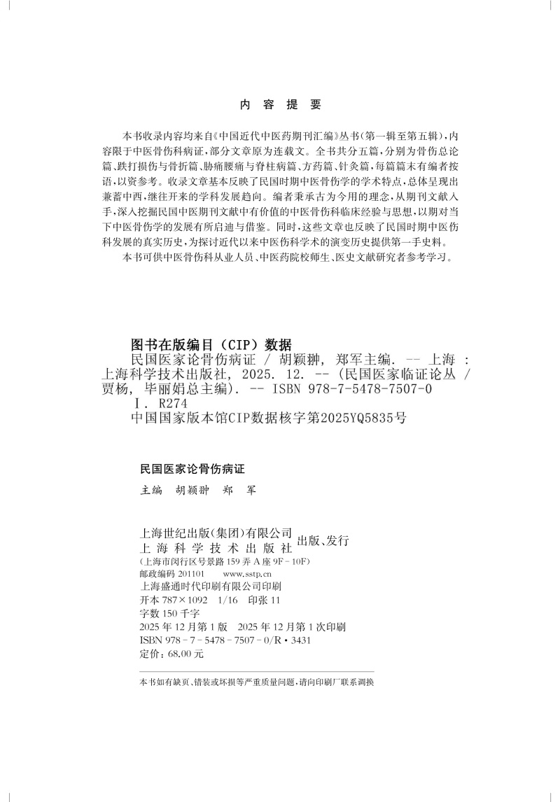 民国医家论骨伤病证 民国医家临证论丛 胡颖翀 郑军 主编 可供中医骨伤科从业人员 医史文献研究者参考学习 上海科学技术出版社