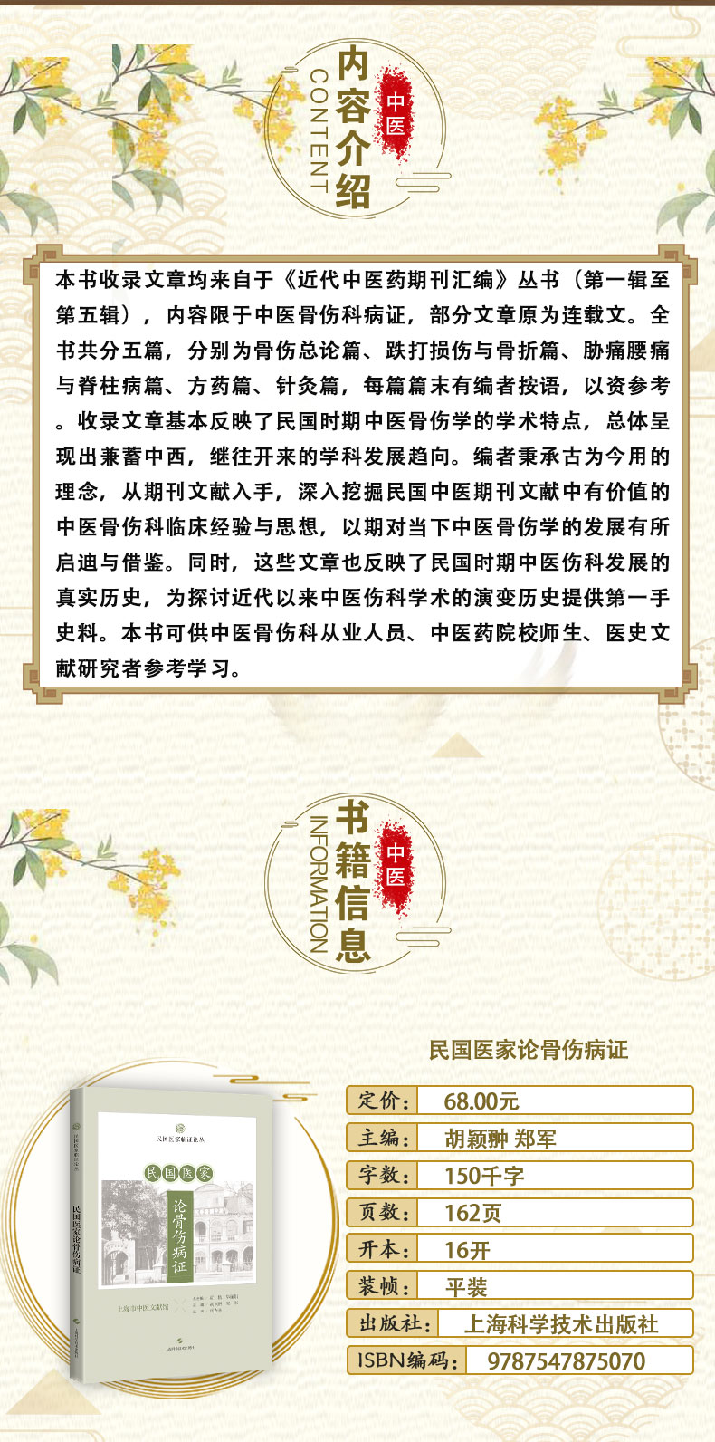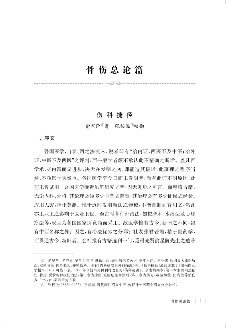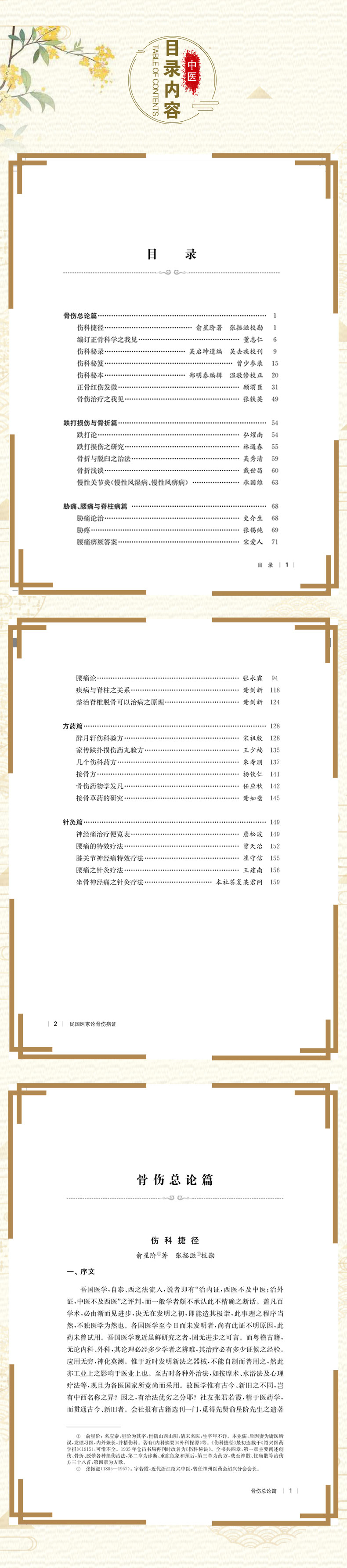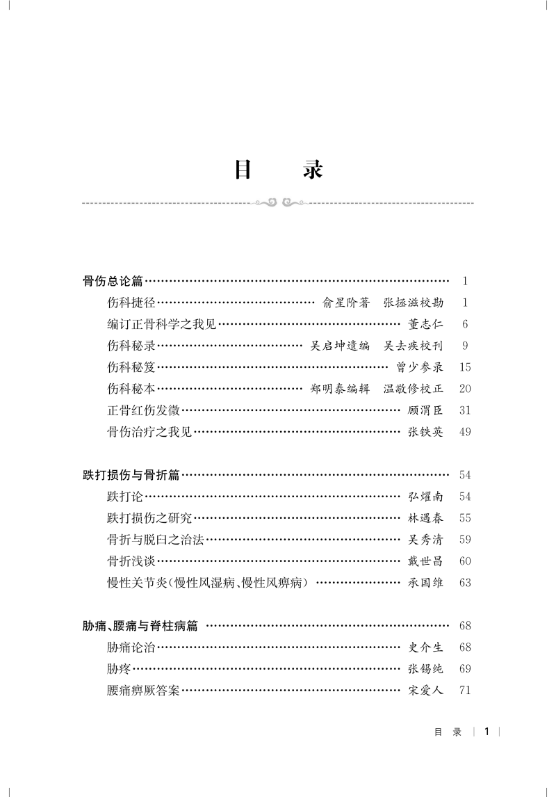 本书收录文章均来自于《近代中医药期刊汇编》丛书(第一辑至第五辑),内容限于中医骨伤科病证,部分文章原为连载文。全书共分五篇,分别为骨伤总论篇、跌打损伤与骨折篇、胁痛腰痛与脊柱病篇、方药篇、针灸篇,每篇篇末有编者按语,以资参考。收录文章基本反映了民国时期中医骨伤学的学术特点,总体呈现出兼蓄中西,继往开来的学科发展趋向。编者秉承古为今用的理念,从期刊文献入手,深入挖掘民国中医期刊文献中有价值的中医骨伤科临床经验与思想,以期对当下中医骨伤学的发展有所启迪与借鉴。同时,这些文章也反映了民国时期中医伤科发展的真实历史,为探讨近代以来中医伤科学术的演变历史提供第一手史料。本书可供中医骨伤科从业人员、中医药院校师生、医史文献研究者参考学习。