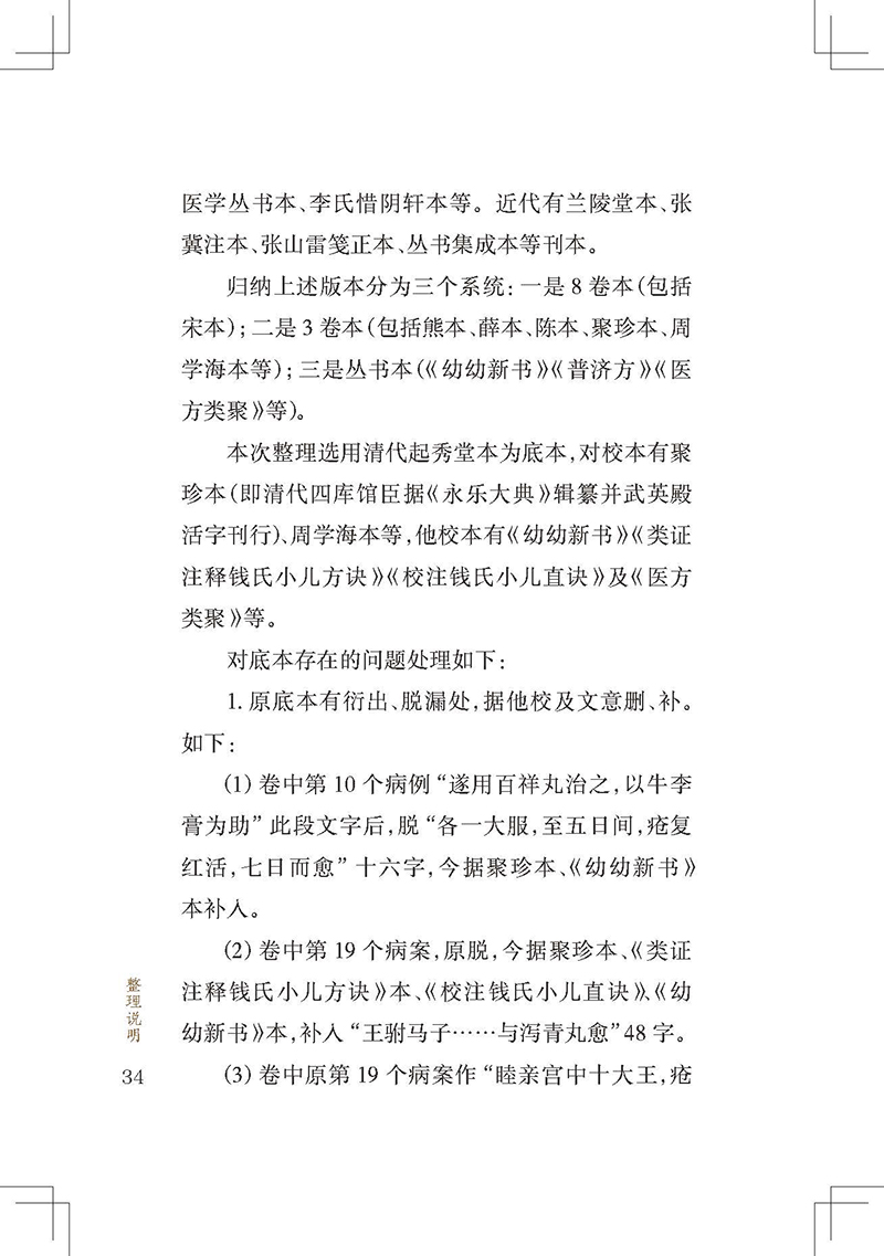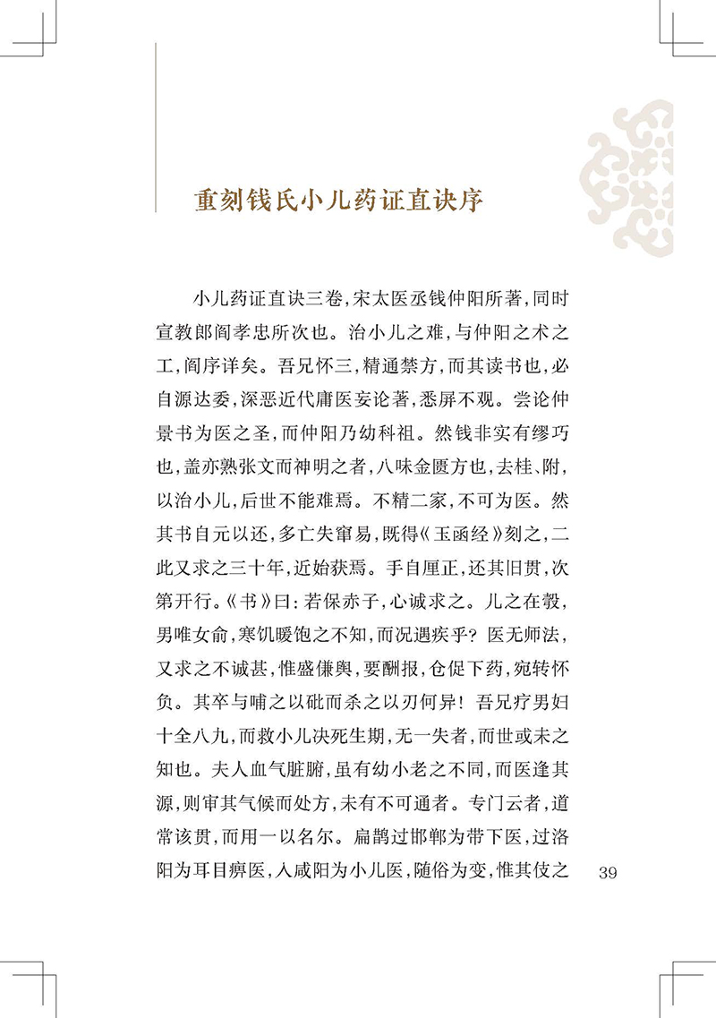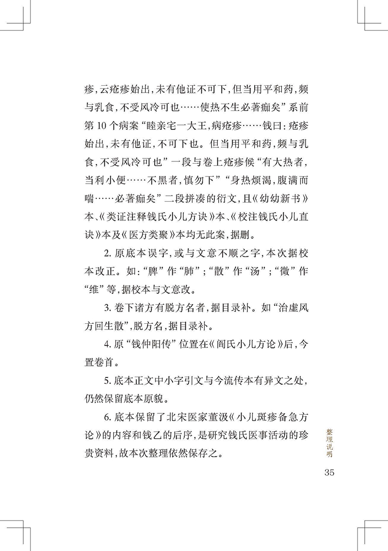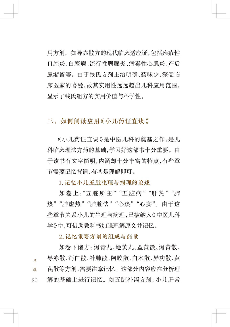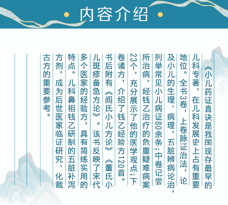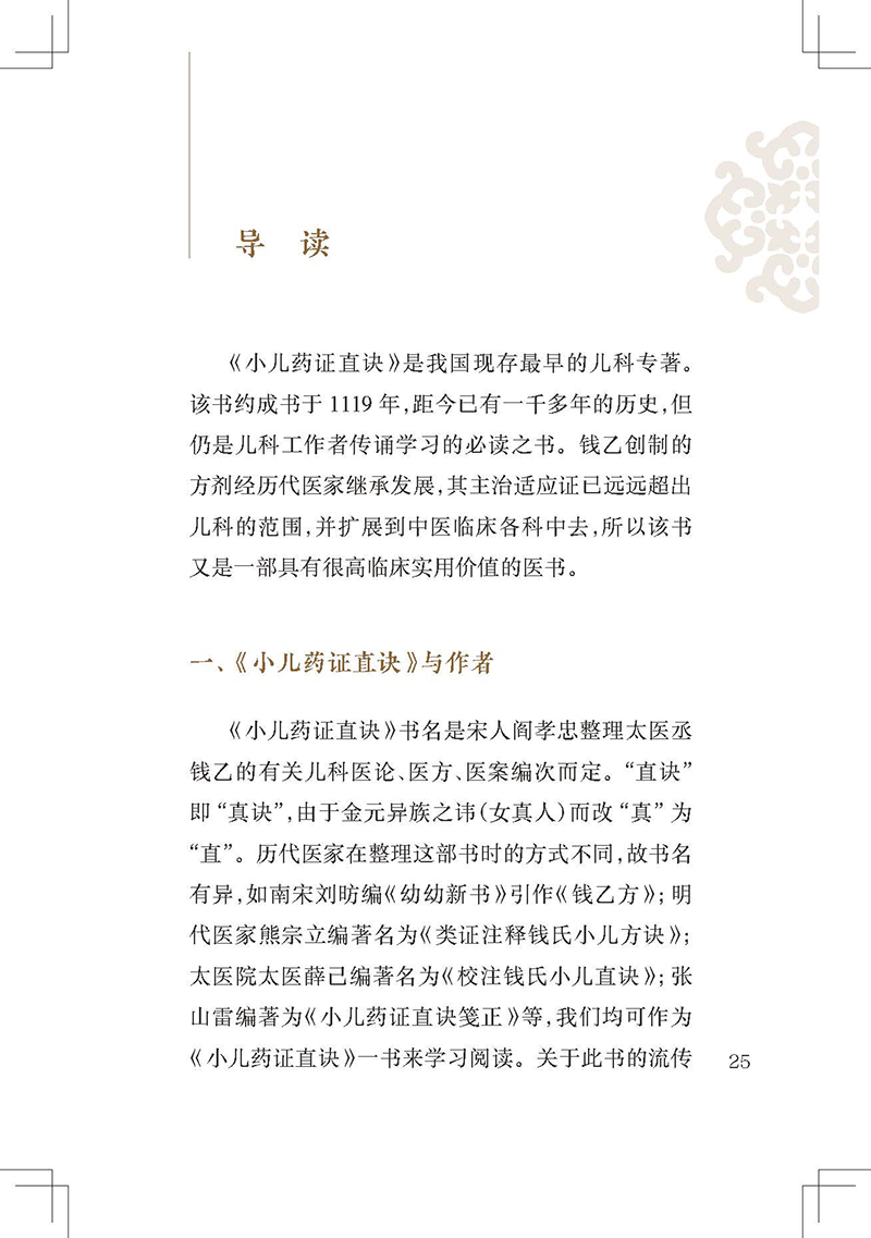 《小儿药证直诀》是我国现存最早的儿科专著,在儿科发展史上占有重要地位。全书3卷,上卷脉证治法,论及小儿的生理、病理,五脏辨病论治,列举常见小儿病证80余条;中卷记尝所治病,经钱乙治疗的危重疑难病案23个,充分展示了他的医学观点;下卷诸方,介绍了钱乙经验方120首。书后附有《阎氏小儿方论》《董氏小儿斑疹备急方论》。该书反映了宋代多个医家的经验方,具有简练实用的特点。儿科鼻祖钱乙研制的五脏补泻方剂,成为后世医家临证研究、化裁古方的重要参考。