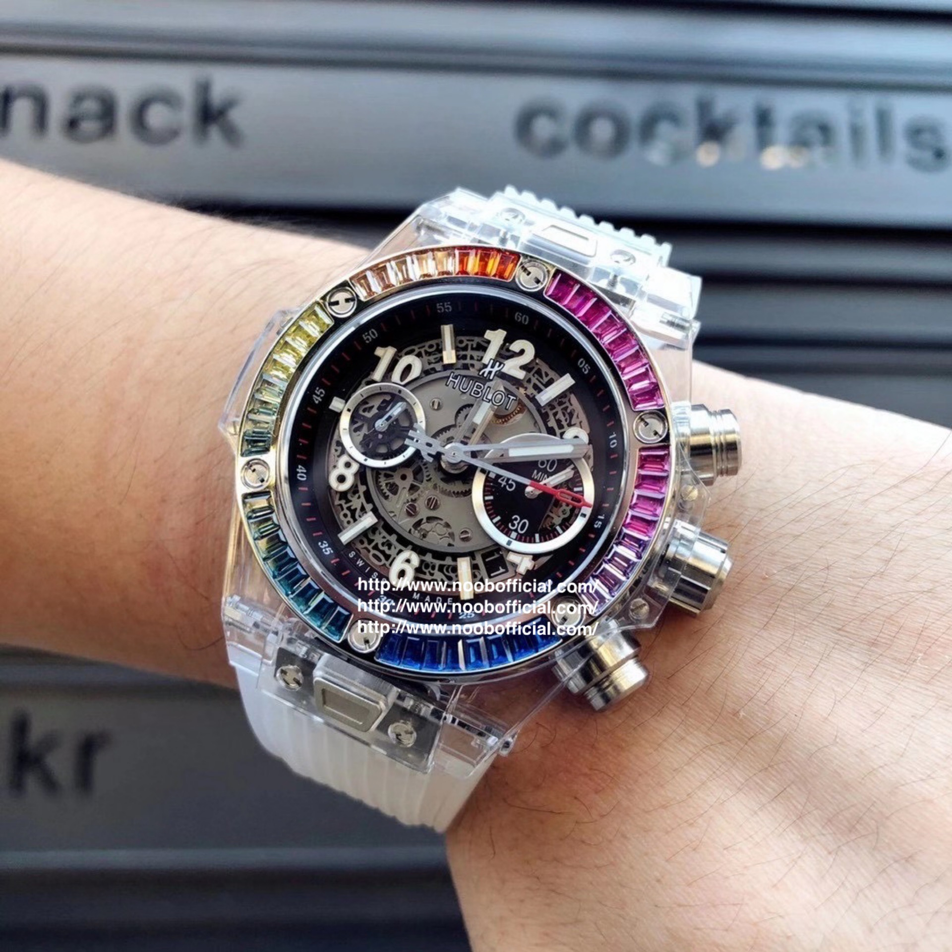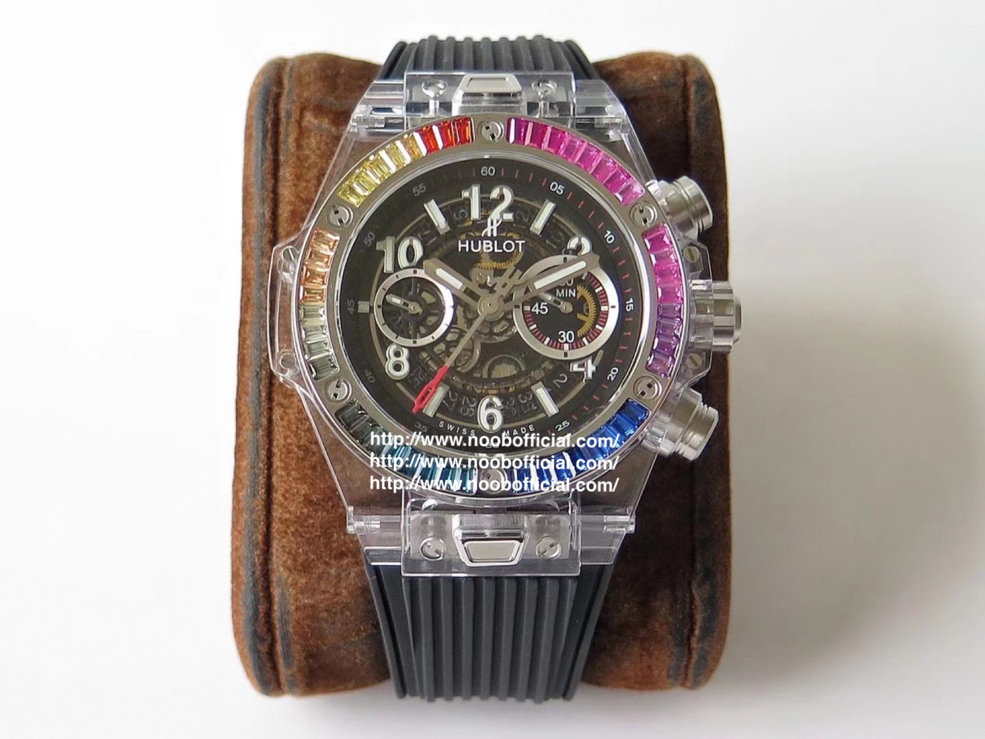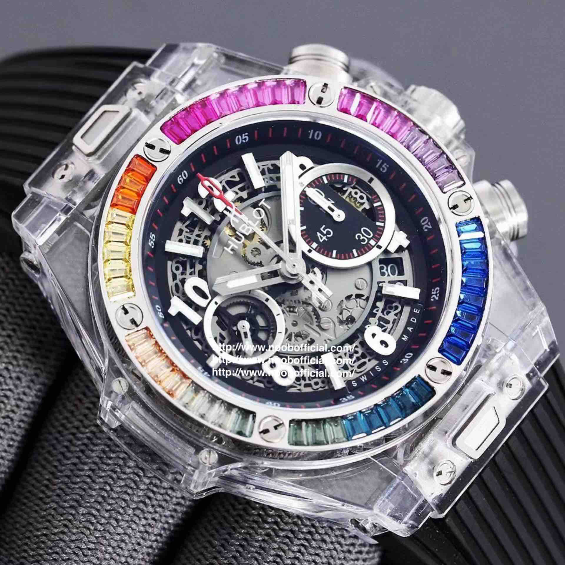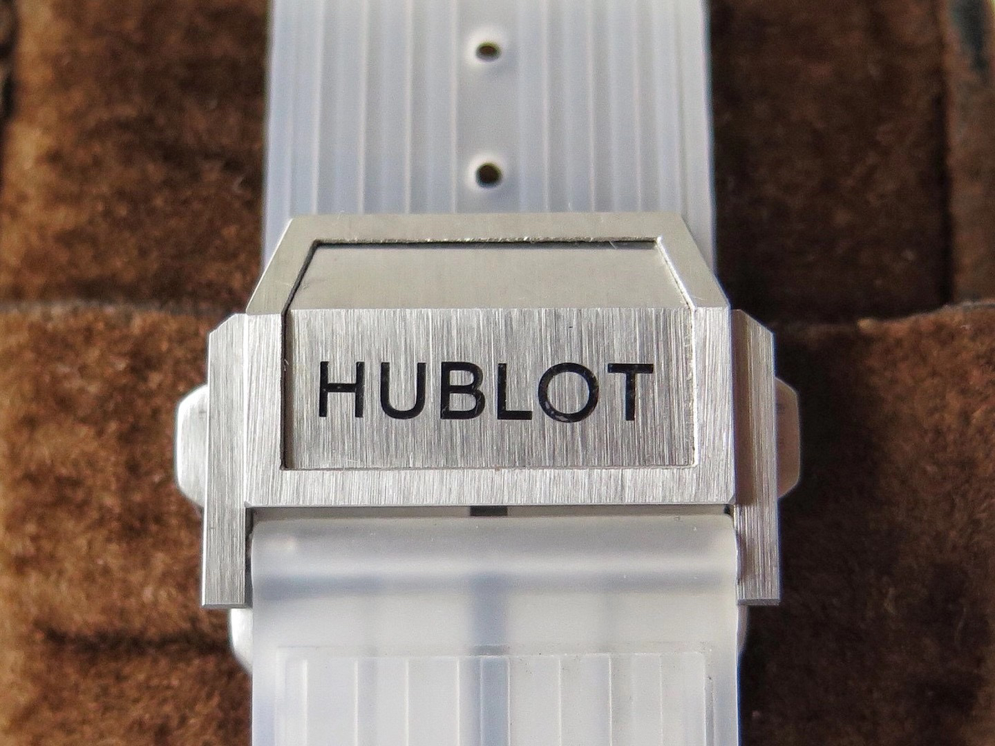 V2版少量到货HB 恒宝宇舶表年度 作品——宇舶BIG BANG系列411.JX.4802.RT“全透明腕表”【精彩细节】1.还原正品表盘后龙飞凤舞的镂空布局,2.采用与原装同样的丙烯酸有机玻璃极致克隆——完成不可能完成的任务。该材质不仅硬度高,且具有抗腐蚀,耐磨损等卓越物理特性。【机芯功能】腕表直径45mm。采用增强版计时7750机芯改原装HUB.1242型芯,实现所有功能吻合正装。【精益求精】HB工厂全力以赴,层层把关,在保证完美“透视感官”的同时,竭心尽力还原正品的每个细节。【赠品】附赠一副同款不同色的天然橡胶表带(可替代原装)复刻界首款“全透佳作”