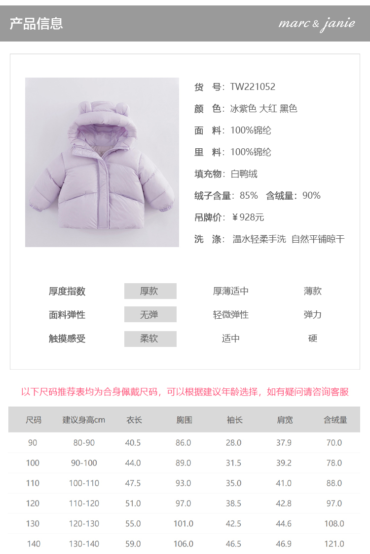 【三防石墨烯蓄热】马克珍妮冬装女童超轻保暖羽绒服面包服221052