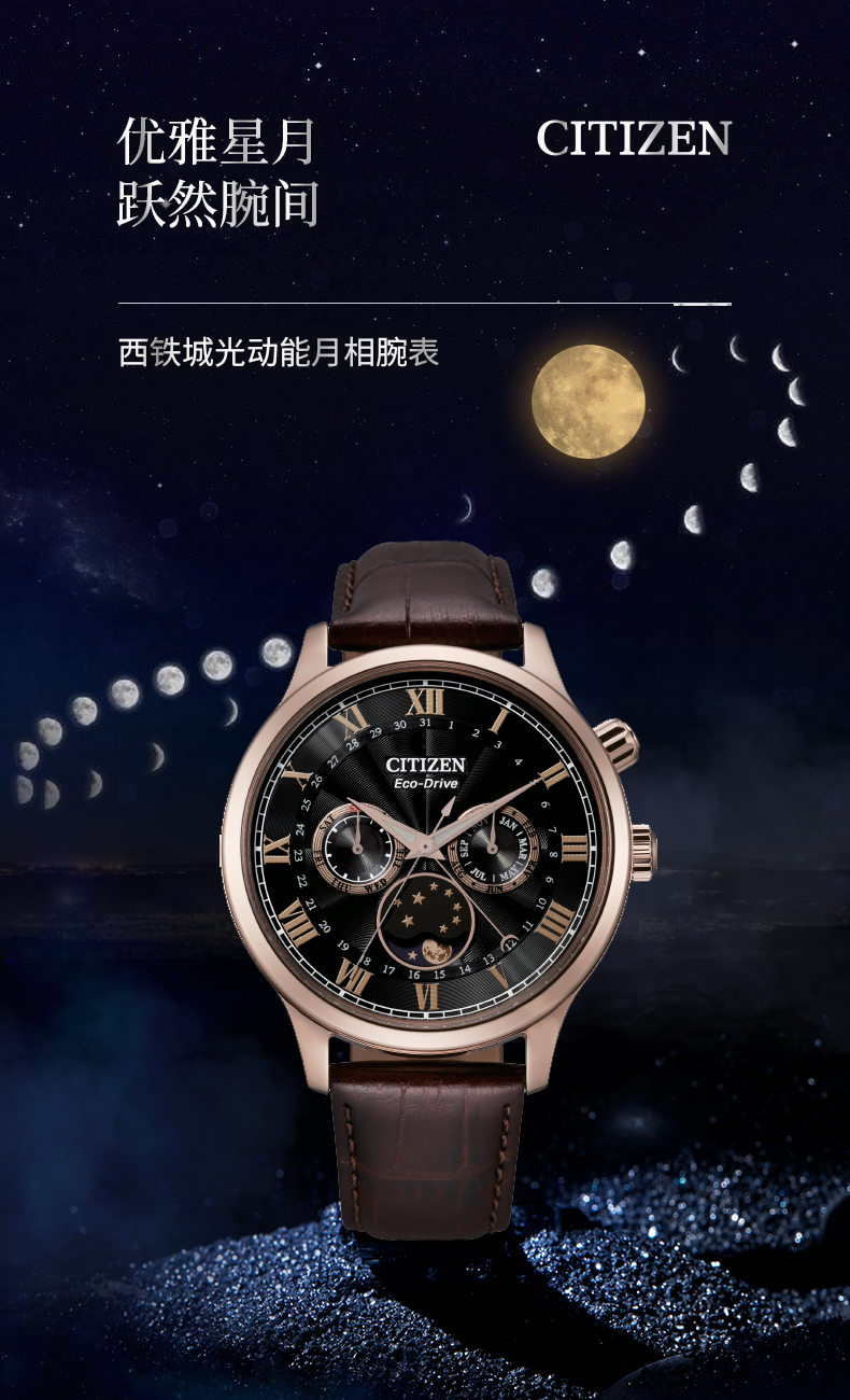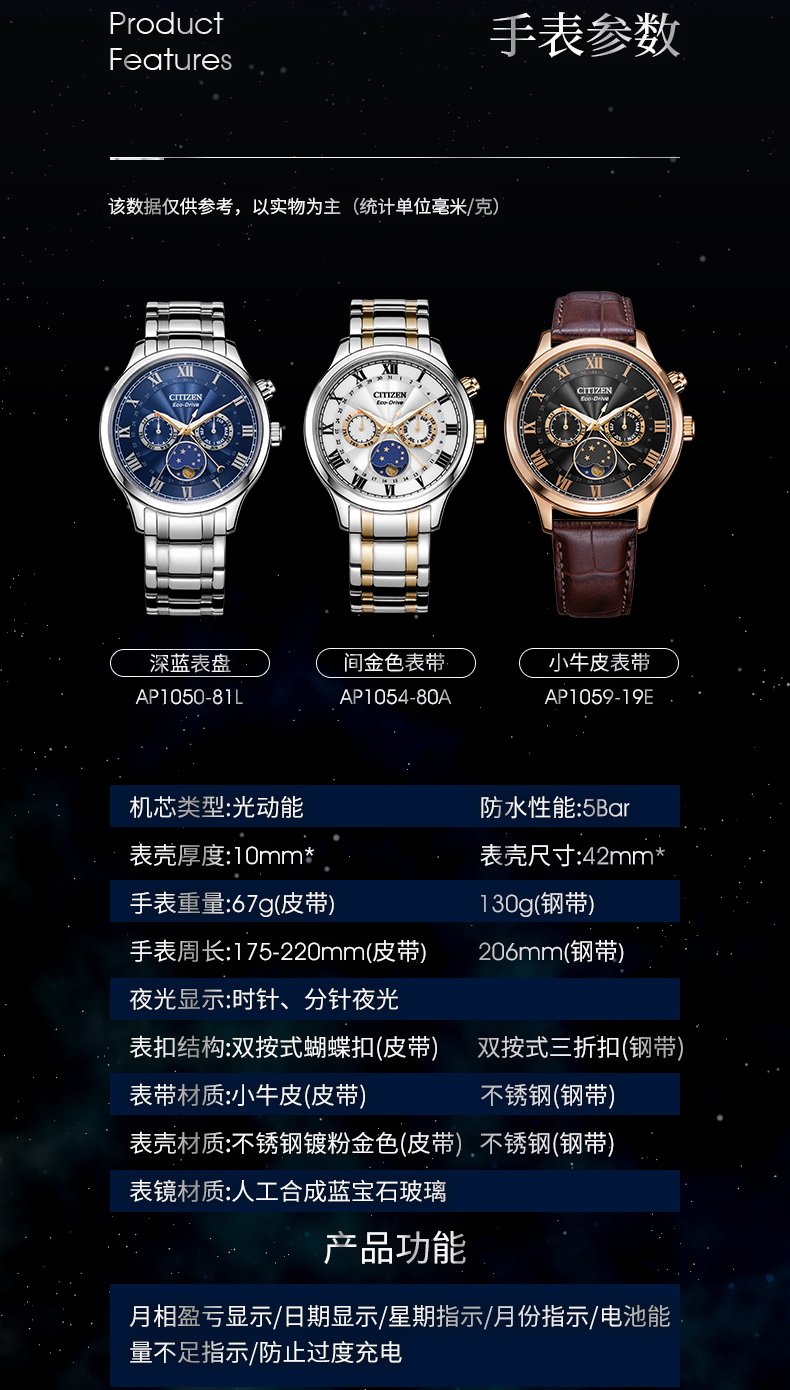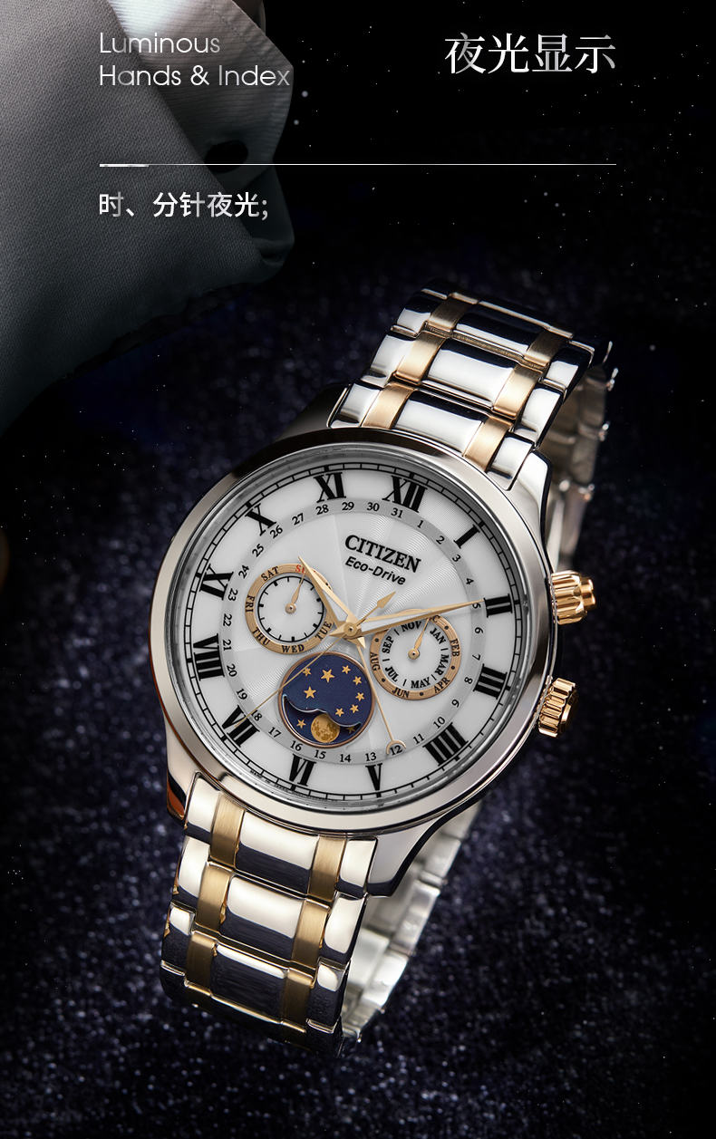 西铁城日本官方正品光动能月相盈亏月份星期日历男表AP1059-19E