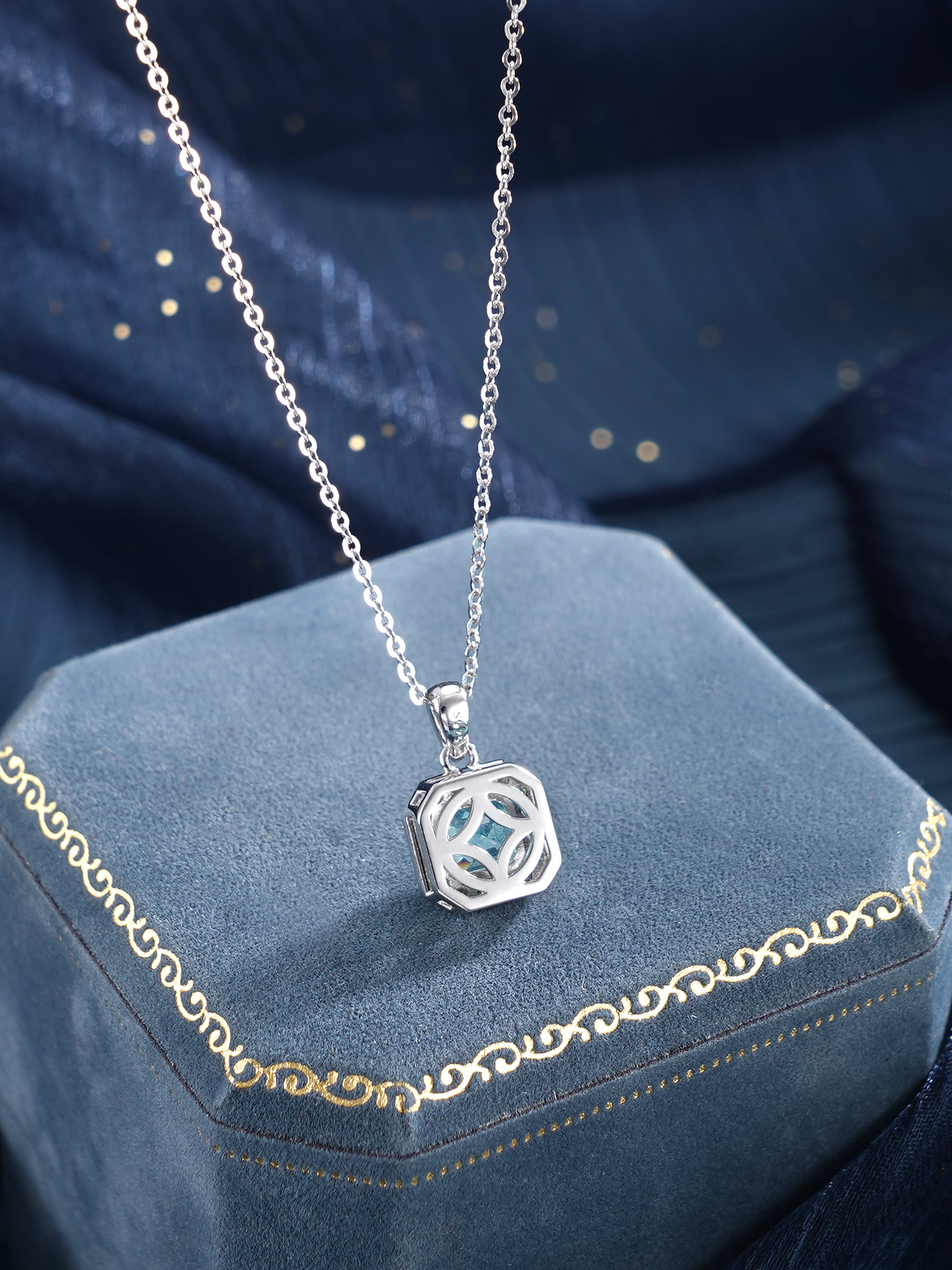 【寓意】:小方糖吊坠,镶嵌蓝色宝石,角度变幻之间,宛若星河与大海形成巧妙互动,给佩戴者带来积极的暗示,寓意获得甜蜜的幸福和完美的结果。