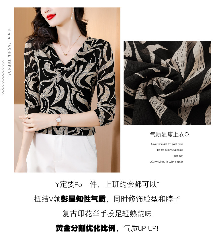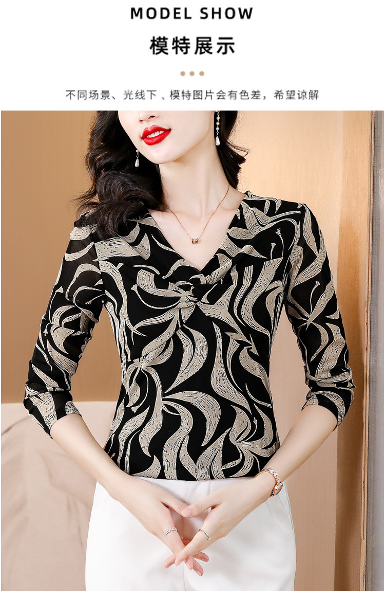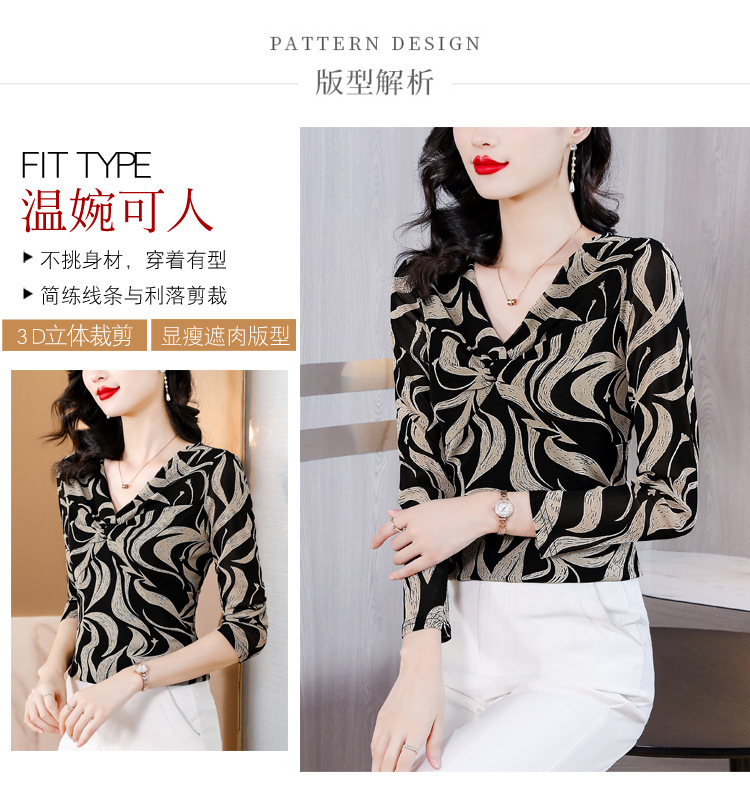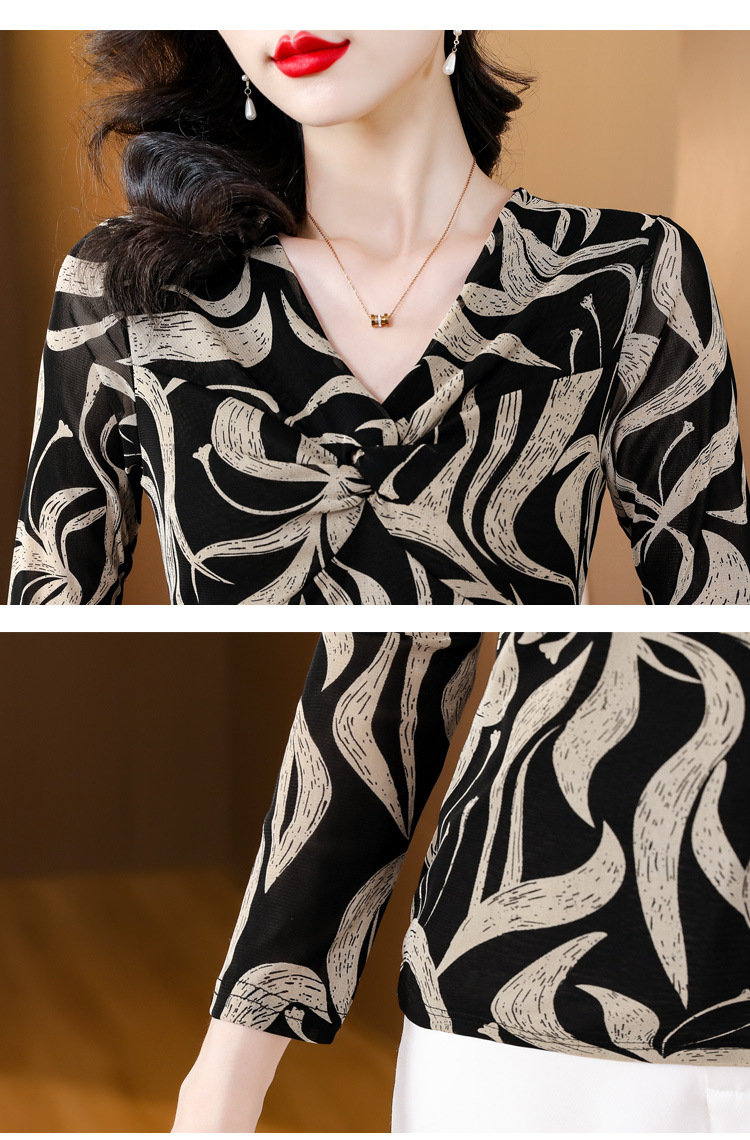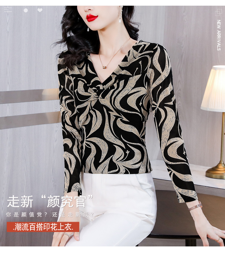 2023秋季新款时尚V领印花高弹网纱长袖洋气遮肚子上衣气质小衫女YH852032